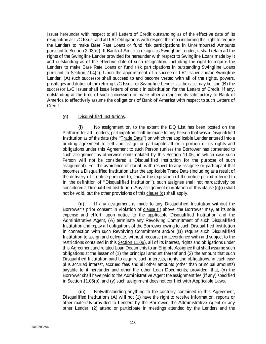 116 14102835v4 Issuer hereunder with respect to all Letters of Credit outstanding as of the effective date of its resignation as L/C Issuer and all L/C Obligations with respect thereto (including the right to require the Lenders to make Base Rate Loans or fund risk participations in Unreimbursed Amounts pursuant to Section 2.03(c)). If Bank of America resigns as Swingline Lender, it shall retain all the rights of the Swingline Lender provided for hereunder with respect to Swingline Loans made by it and outstanding as of the effective date of such resignation, including the right to require the Lenders to make Base Rate Loans or fund risk participations in outstanding Swingline Loans pursuant to Section 2.04(c). Upon the appointment of a successor L/C Issuer and/or Swingline Lender, (A) such successor shall succeed to and become vested with all of the rights, powers, privileges and duties of the retiring L/C Issuer or Swingline Lender, as the case may be, and (B) the successor L/C Issuer shall issue letters of credit in substitution for the Letters of Credit, if any, outstanding at the time of such succession or make other arrangements satisfactory to Bank of America to effectively assume the obligations of Bank of America with respect to such Letters of Credit. (g) Disqualified Institutions. (i) No assignment or, to the extent the DQ List has been posted on the Platform for all Lenders, participation shall be made to any Person that was a Disqualified Institution as of the date (the “Trade Date”) on which the applicable Lender entered into a binding agreement to sell and assign or participate all or a portion of its rights and obligations under this Agreement to such Person (unless the Borrower has consented to such assignment as otherwise contemplated by this Section 11.06, in which case such Person will not be considered a Disqualified Institution for the purpose of such assignment). For the avoidance of doubt, with respect to any assignee or participant that becomes a Disqualified Institution after the applicable Trade Date (including as a result of the delivery of a notice pursuant to, and/or the expiration of the notice period referred to in, the definition of “Disqualified Institution”), such assignee shall not retroactively be considered a Disqualified Institution. Any assignment in violation of this clause (g)(i) shall not be void, but the other provisions of this clause (g) shall apply. (ii) If any assignment is made to any Disqualified Institution without the Borrower’s prior consent in violation of clause (i) above, the Borrower may, at its sole expense and effort, upon notice to the applicable Disqualified Institution and the Administrative Agent, (A) terminate any Revolving Commitment of such Disqualified Institution and repay all obligations of the Borrower owing to such Disqualified Institution in connection with such Revolving Commitment and/or (B) require such Disqualified Institution to assign and delegate, without recourse (in accordance with and subject to the restrictions contained in this Section 11.06), all of its interest, rights and obligations under this Agreement and related Loan Documents to an Eligible Assignee that shall assume such obligations at the lesser of (1) the principal amount thereof and (2) the amount that such Disqualified Institution paid to acquire such interests, rights and obligations, in each case plus accrued interest, accrued fees and all other amounts (other than principal amounts) payable to it hereunder and other the other Loan Documents; provided, that, (x) the Borrower shall have paid to the Administrative Agent the assignment fee (if any) specified in Section 11.06(b), and (y) such assignment does not conflict with Applicable Laws. (iii) Notwithstanding anything to the contrary contained in this Agreement, Disqualified Institutions (A) will not (1) have the right to receive information, reports or other materials provided to Lenders by the Borrower, the Administrative Agent or any other Lender, (2) attend or participate in meetings attended by the Lenders and the