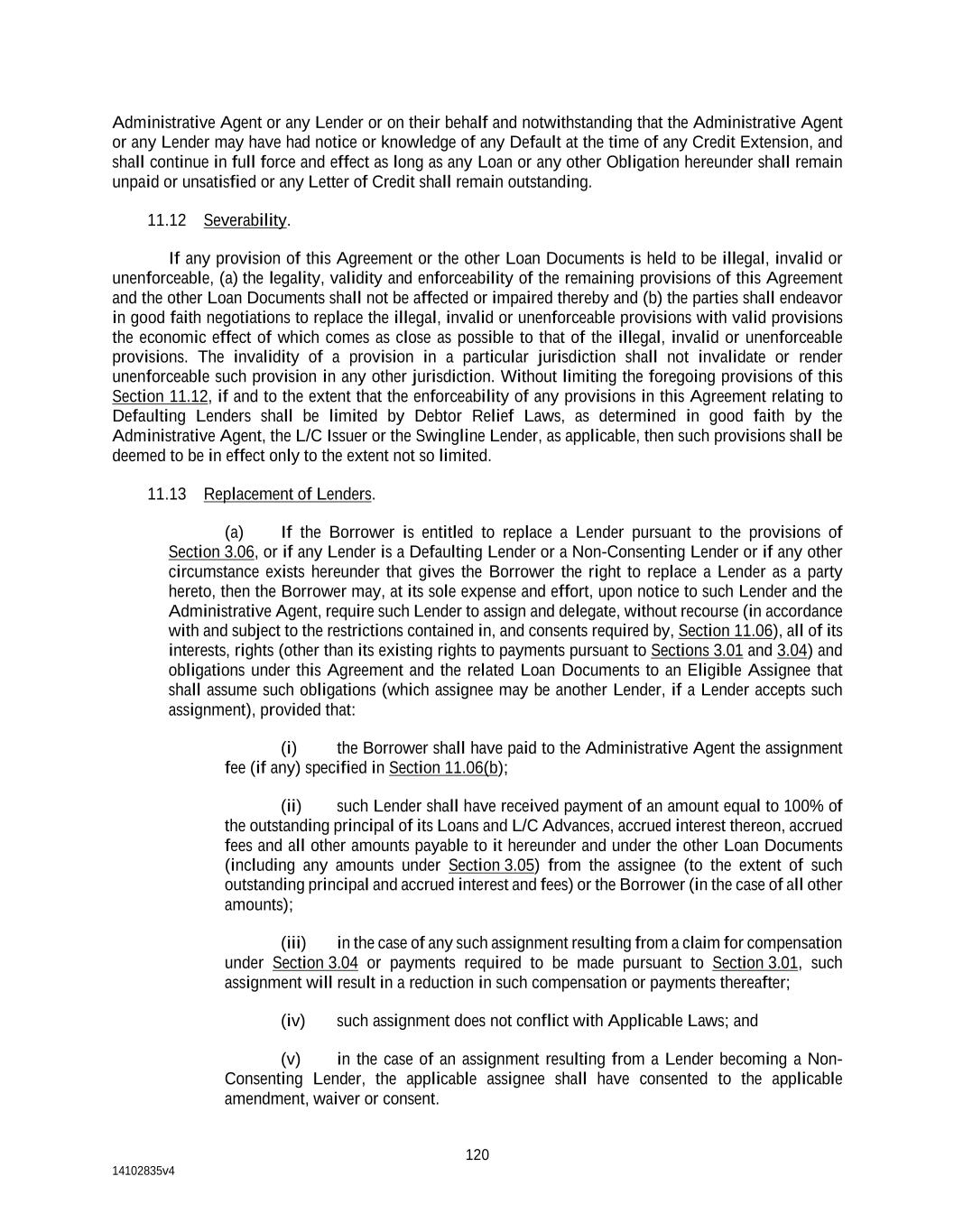 120 14102835v4 Administrative Agent or any Lender or on their behalf and notwithstanding that the Administrative Agent or any Lender may have had notice or knowledge of any Default at the time of any Credit Extension, and shall continue in full force and effect as long as any Loan or any other Obligation hereunder shall remain unpaid or unsatisfied or any Letter of Credit shall remain outstanding. 11.12 Severability. If any provision of this Agreement or the other Loan Documents is held to be illegal, invalid or unenforceable, (a) the legality, validity and enforceability of the remaining provisions of this Agreement and the other Loan Documents shall not be affected or impaired thereby and (b) the parties shall endeavor in good faith negotiations to replace the illegal, invalid or unenforceable provisions with valid provisions the economic effect of which comes as close as possible to that of the illegal, invalid or unenforceable provisions. The invalidity of a provision in a particular jurisdiction shall not invalidate or render unenforceable such provision in any other jurisdiction. Without limiting the foregoing provisions of this Section 11.12, if and to the extent that the enforceability of any provisions in this Agreement relating to Defaulting Lenders shall be limited by Debtor Relief Laws, as determined in good faith by the Administrative Agent, the L/C Issuer or the Swingline Lender, as applicable, then such provisions shall be deemed to be in effect only to the extent not so limited. 11.13 Replacement of Lenders. (a) If the Borrower is entitled to replace a Lender pursuant to the provisions of Section 3.06, or if any Lender is a Defaulting Lender or a Non-Consenting Lender or if any other circumstance exists hereunder that gives the Borrower the right to replace a Lender as a party hereto, then the Borrower may, at its sole expense and effort, upon notice to such Lender and the Administrative Agent, require such Lender to assign and delegate, without recourse (in accordance with and subject to the restrictions contained in, and consents required by, Section 11.06), all of its interests, rights (other than its existing rights to payments pursuant to Sections 3.01 and 3.04) and obligations under this Agreement and the related Loan Documents to an Eligible Assignee that shall assume such obligations (which assignee may be another Lender, if a Lender accepts such assignment), provided that: (i) the Borrower shall have paid to the Administrative Agent the assignment fee (if any) specified in Section 11.06(b); (ii) such Lender shall have received payment of an amount equal to 100% of the outstanding principal of its Loans and L/C Advances, accrued interest thereon, accrued fees and all other amounts payable to it hereunder and under the other Loan Documents (including any amounts under Section 3.05) from the assignee (to the extent of such outstanding principal and accrued interest and fees) or the Borrower (in the case of all other amounts); (iii) in the case of any such assignment resulting from a claim for compensation under Section 3.04 or payments required to be made pursuant to Section 3.01, such assignment will result in a reduction in such compensation or payments thereafter; (iv) such assignment does not conflict with Applicable Laws; and (v) in the case of an assignment resulting from a Lender becoming a Non- Consenting Lender, the applicable assignee shall have consented to the applicable amendment, waiver or consent.