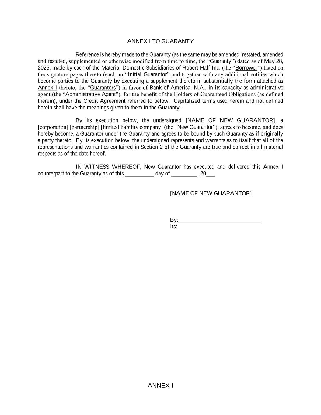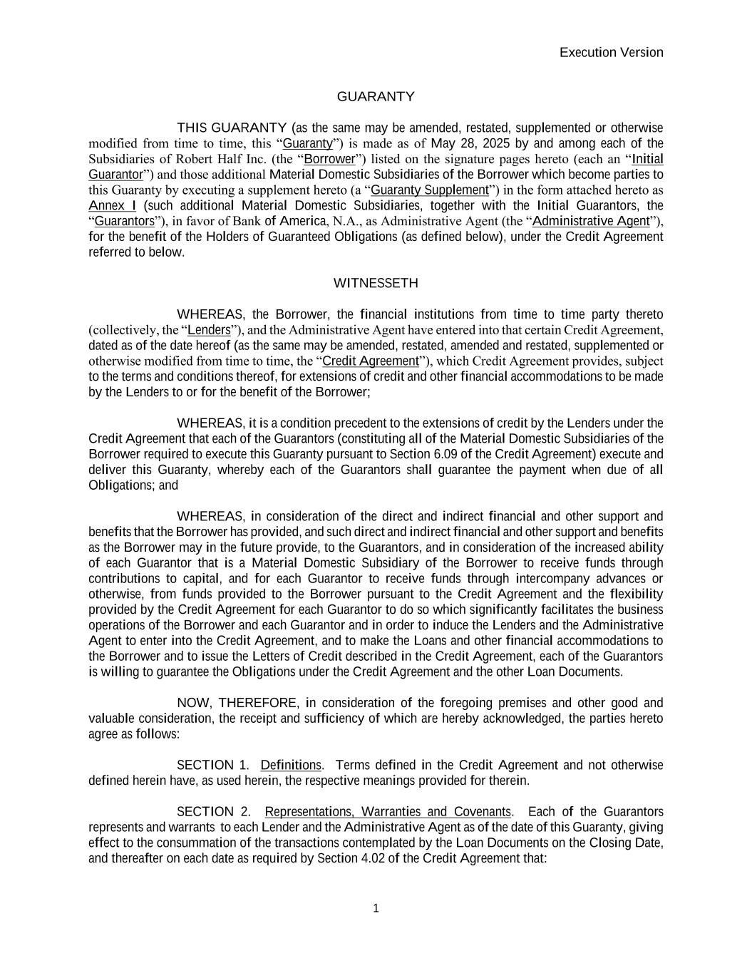 1 14102835v4 CREDIT AGREEMENT This CREDIT AGREEMENT is entered into as of May 28, 2025, among ROBERT HALF INC., a Delaware corporation (the “Borrower”), the Lenders (defined herein), and BANK OF AMERICA, N.A., as Administrative Agent, Swingline Lender and L/C Issuer. PRELIMINARY STATEMENTS: WHEREAS, the Loan Parties (as hereinafter defined) have requested that the Lenders, the Swingline Lender and the L/C Issuer make loans and other financial accommodations to the Loan Parties in an aggregate amount of up to $100,000,000. WHEREAS, the Lenders, the Swingline Lender and the L/C Issuer have agreed to make such loans and other financial accommodations to the Loan Parties on the terms and subject to the conditions set forth herein. NOW THEREFORE, in consideration of the mutual covenants and agreements herein contained, the parties hereto covenant and agree as follows: ARTICLE I DEFINITIONS AND ACCOUNTING TERMS 1.01 Defined Terms. As used in this Agreement, the following terms shall have the meanings set forth below: “Acquisition” means any acquisition (whether by purchase, merger, consolidation or otherwise) or series of related acquisitions by the Borrower or any Subsidiary of (i) all or substantially all the assets of (or all or substantially all the assets constituting a business unit, division, product line or line of business of) any Person, or (ii) all or substantially all the Equity Interests in a Person or division or line of business of a Person. “Additional Guaranteed Obligations” means (a) all obligations arising under Guaranteed Cash Management Agreements and Guaranteed Hedge Agreements and (b) all costs and expenses incurred in connection with enforcement and collection of the foregoing, including the fees, charges and disbursements of counsel, in each case whether direct or indirect (including those acquired by assumption), absolute or contingent, due or to become due, now existing or hereafter arising and including interest, expenses and fees that accrue after the commencement by or against any Loan Party or any Affiliate thereof of any proceeding under any Debtor Relief Laws naming such Person as the debtor in such proceeding, regardless of whether such interest, expenses and fees are allowed claims in such proceeding; provided that Additional Guaranteed Obligations of a Loan Party shall exclude any Excluded Swap Obligations with respect to such Loan Party. “Administrative Agent” means Bank of America (or any of its designated branch offices or affiliates) in its capacity as administrative agent under any of the Loan Documents, or any successor administrative agent. “Administrative Agent’s Office” means, with respect to any currency, the Administrative Agent’s address and, as appropriate, account as set forth on Schedule 1.01(a) with respect to such currency, or such