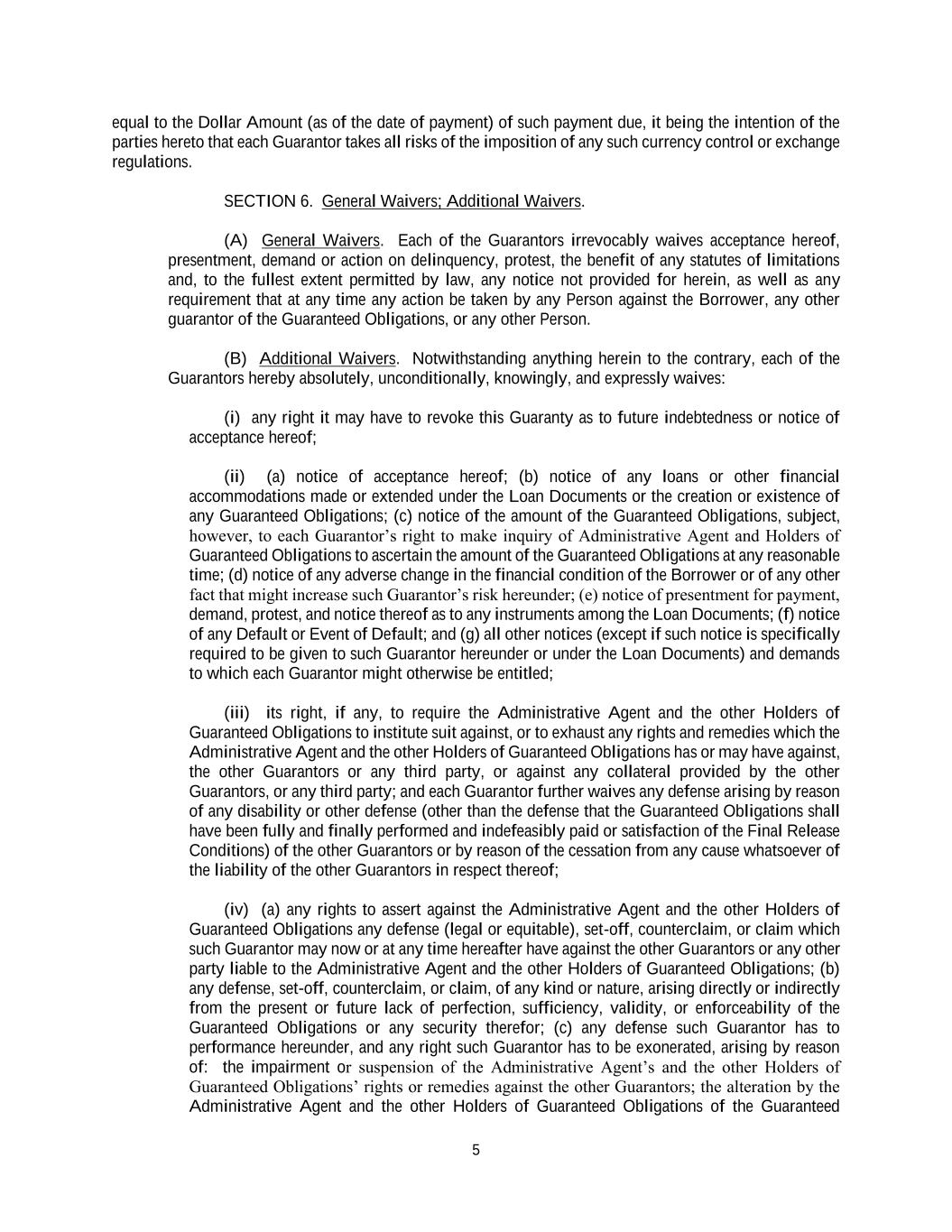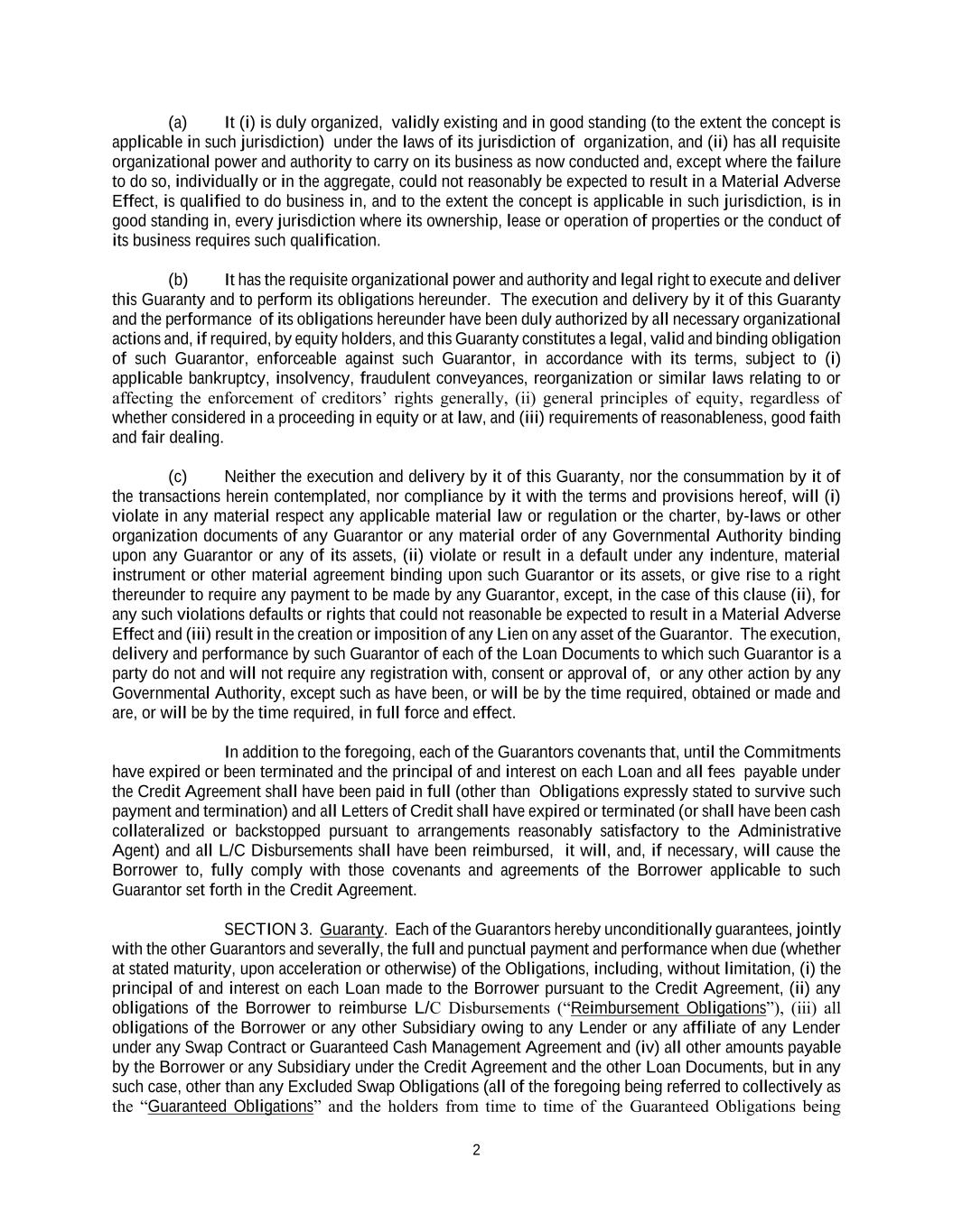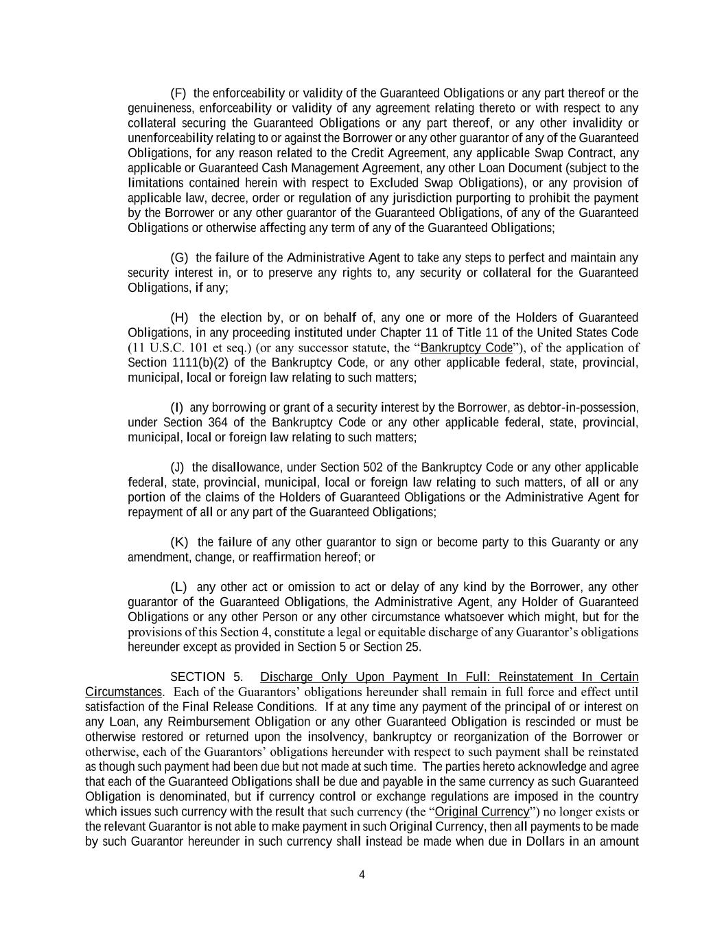 103 14102835v4 affecting any term of any of the Additional Guaranteed Obligations; or (h) any other act, omission or delay to do any other act which may or might in any manner or to any extent vary the risk of the Borrower or otherwise operate as a discharge of a guarantor as a matter of law or equity or which would impair or eliminate any right of the Borrower to subrogation. 10.03 Obligations and Payment. (a) The Borrower further agrees that its agreement hereunder constitutes a guarantee of payment when due (whether or not any bankruptcy or similar proceeding shall have stayed the accrual or collection of any of the Additional Guaranteed Obligations or operated as a discharge thereof) and not merely of collection, and waives any right to require that any resort be had by any applicable Lender (or any of its Affiliates) to any balance of any deposit account or credit on the books of the Administrative Agent, the L/C Issuer or any Lender in favor of any Subsidiary or any other Person. (b) The obligations of the Borrower hereunder shall not be subject to any reduction, limitation, impairment or termination for any reason, and shall not be subject to any defense or setoff, counterclaim, recoupment or termination whatsoever, by reason of the invalidity, illegality or unenforceability of any of the Additional Guaranteed Obligations, any impossibility in the performance of any of the Additional Guaranteed Obligations or otherwise. (c) The Borrower further agrees that its obligations hereunder shall constitute a continuing and irrevocable guarantee of all Additional Guaranteed Obligations now or hereafter existing and shall continue to be effective or be reinstated, as the case may be, if at any time payment, or any part thereof, of any Additional Guaranteed Obligation (including a payment effected through exercise of a right of setoff) is rescinded, or is or must otherwise be restored or returned by any applicable Lender (or any of its Affiliates) upon the insolvency, bankruptcy or reorganization of any Subsidiary or otherwise (including pursuant to any settlement entered into by a holder of Additional Guaranteed Obligations in its discretion). (d) In furtherance of the foregoing and not in limitation of any other right which any applicable Lender (or any of its Affiliates) may have at law or in equity against the Borrower by virtue hereof, upon the failure of any Subsidiary to pay any Additional Guaranteed Obligation when and as the same shall become due, whether at maturity, by acceleration, after notice of prepayment or otherwise, the Borrower hereby promises to and will, upon receipt of written demand by any applicable Lender (or any of its Affiliates), forthwith pay, or cause to be paid, to such applicable Lender (or any of its Affiliates) in cash an amount equal to the unpaid principal amount of such Additional Guaranteed Obligations then due, together with accrued and unpaid interest thereon. The Borrower further agrees that if payment in respect of any Additional Guaranteed Obligation shall be due in a currency other than Dollars and/or at a place of payment other than the applicable Lending Office for such currency and if, by reason of any Change in Law, disruption of currency or foreign exchange markets, war or civil disturbance or other event, payment of such Additional Guaranteed Obligation in such currency or at such place of payment shall be impossible or, in the reasonable judgment of any applicable Lender (or any of its Affiliates), disadvantageous to such applicable Lender (or any of its Affiliates) in any material respect, then, at the election of such applicable Lender, the Borrower shall make payment of such Additional Guaranteed Obligation in Dollars (in the Dollar Equivalent of the amount of such Additional Guaranteed Obligation on the date of payment) and/or in such other Lending Office as is designated by such applicable Lender (or its Affiliate) and, as a separate and independent obligation, shall indemnify such applicable Lender (and any of its Affiliates) against any losses or reasonable out-of-pocket expenses that it shall sustain as a result of such alternative payment.