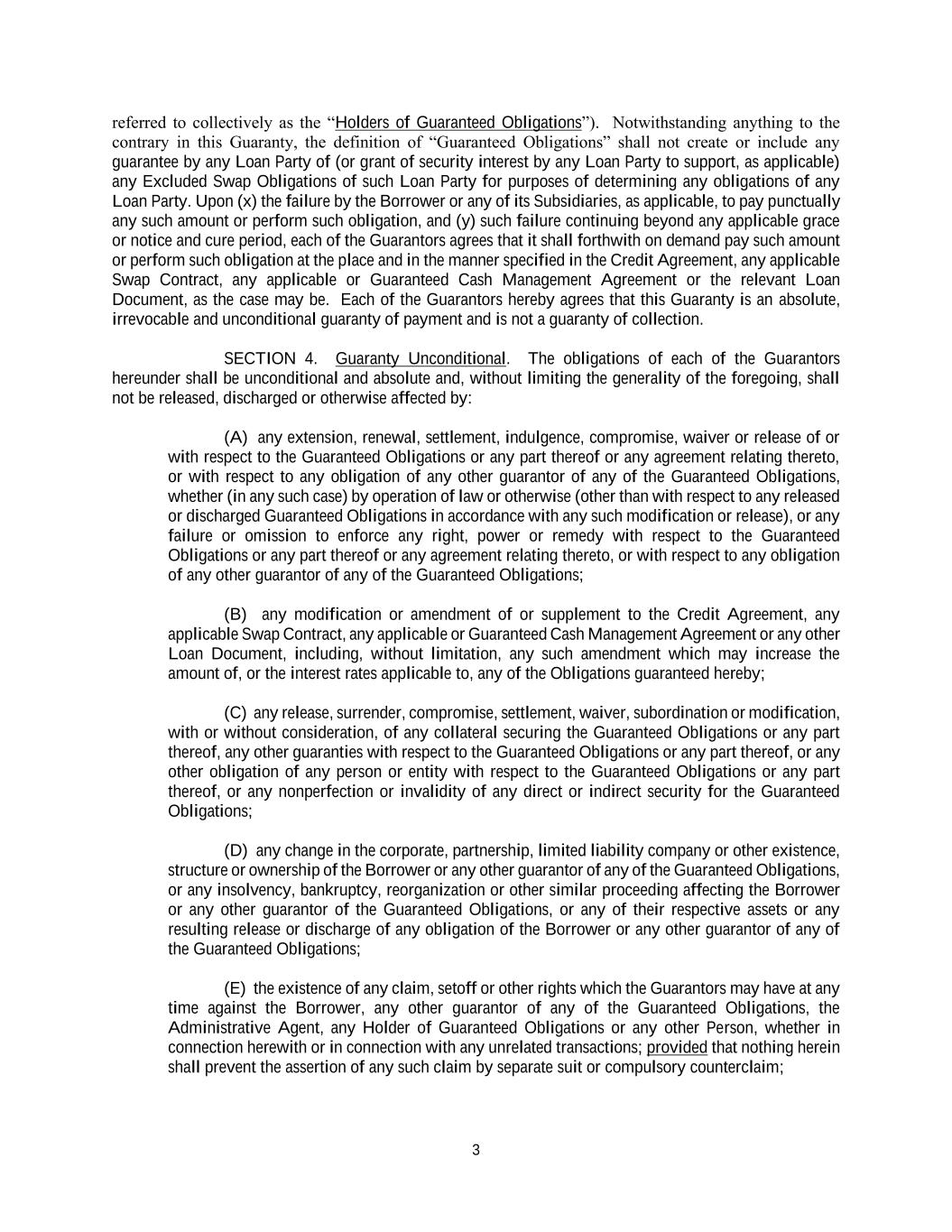 102 14102835v4 then in any such event, each Lender Recipient Party receiving a Rescindable Amount severally agrees to repay to the Administrative Agent forthwith on demand the Rescindable Amount received by such Lender Recipient Party in Same Day Funds in the currency so received, with interest thereon, for each day from and including the date such Rescindable Amount is received by it to but excluding the date of payment to the Administrative Agent, at the Overnight Rate. Each Lender Recipient Party irrevocably waives any and all defenses, including any “discharge for value” (under which a creditor might otherwise claim a right to retain funds mistakenly paid by a third party in respect of a debt owed by another) or similar defense to its obligation to return any Rescindable Amount. The Administrative Agent shall inform each Lender Recipient Party promptly upon determining that any payment made to such Lender Recipient Party comprised, in whole or in part, a Rescindable Amount. ARTICLE X BORROWER GUARANTY 10.01 Guaranty. In order to induce the Lenders to extend credit to the Borrower hereunder and for other good and valuable consideration (the receipt and sufficiency of which are hereby acknowledged), the Borrower hereby absolutely and irrevocably and unconditionally guarantees, as a primary obligor and not merely as a surety, the payment when and as due of the Additional Guaranteed Obligations of the Subsidiaries. The Borrower further agrees that the due and punctual payment of such Additional Guaranteed Obligations may be extended or renewed, in whole or in part, without notice to or further assent from it, and that it will remain bound upon its guarantee hereunder notwithstanding any such extension or renewal of any such Additional Guaranteed Obligations. 10.02 Certain Waivers. The Borrower waives presentment to, demand of payment from and protest to any Subsidiary of any of the Additional Guaranteed Obligations, and also waives notice of acceptance of its obligations and notice of protest for nonpayment. The obligations of the Borrower hereunder shall not be affected by (a) the failure of any applicable Lender (or any of its Affiliates) to assert any claim or demand or to enforce any right or remedy against any Subsidiary under the provisions of any Guaranteed Cash Management Agreement, any Guaranteed Hedge Agreement or otherwise; (b) any extension or renewal of any of the Additional Guaranteed Obligations; (c) any rescission, waiver, amendment or modification of, or release from, any of the terms or provisions of this Agreement, any other Loan Document, any Guaranteed Cash Management Agreement, any Guaranteed Hedge Agreement or other agreement; (d) any default, failure or delay, willful or otherwise, in the performance of any of the Additional Guaranteed Obligations; (e) the failure of any applicable Lender (or any of its Affiliates) to take any steps to perfect and maintain any security interest in, or to preserve any rights to, any security or collateral for the Additional Guaranteed Obligations, if any; (f) any change in the corporate, partnership or other existence, structure or ownership of any Subsidiary or any other guarantor of any of the Additional Guaranteed Obligations; (g) the enforceability or validity of the Additional Guaranteed Obligations or any part thereof or the genuineness, enforceability or validity of any agreement relating thereto or with respect to any collateral securing the Additional Guaranteed Obligations or any part thereof, or any other invalidity or unenforceability relating to or against any Subsidiary or any other guarantor of any of the Additional Guaranteed Obligations, for any reason related to this Agreement, any other Loan Document, any Guaranteed Cash Management Agreement, any Guaranteed Hedge Agreement, or any provision of applicable law, decree, order or regulation of any jurisdiction purporting to prohibit the payment by such Subsidiary or any other guarantor of the Additional Guaranteed Obligations, of any of the Additional Guaranteed Obligations or otherwise