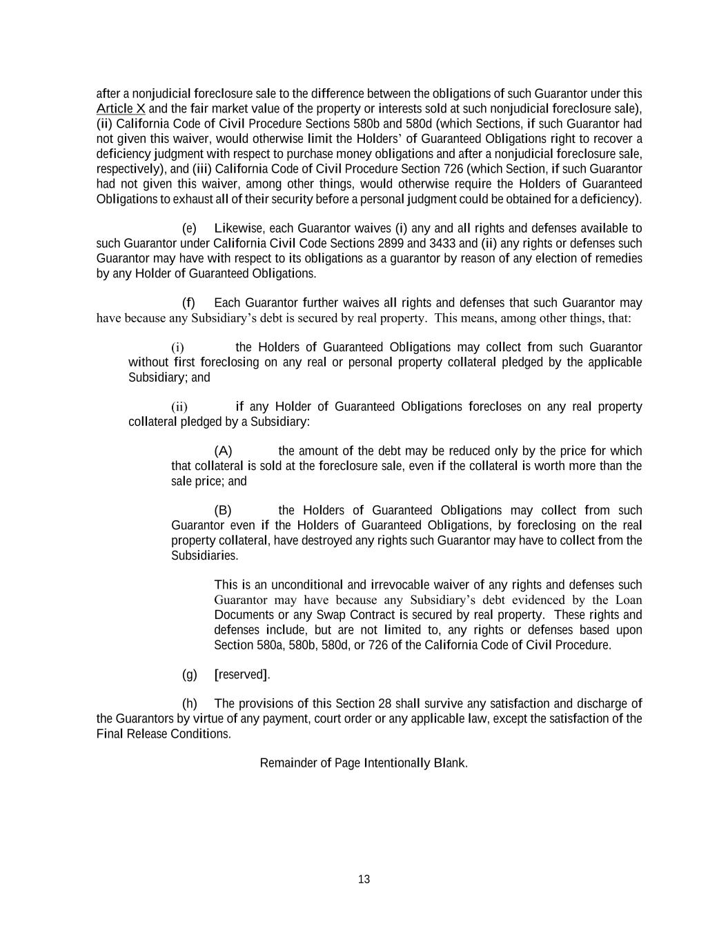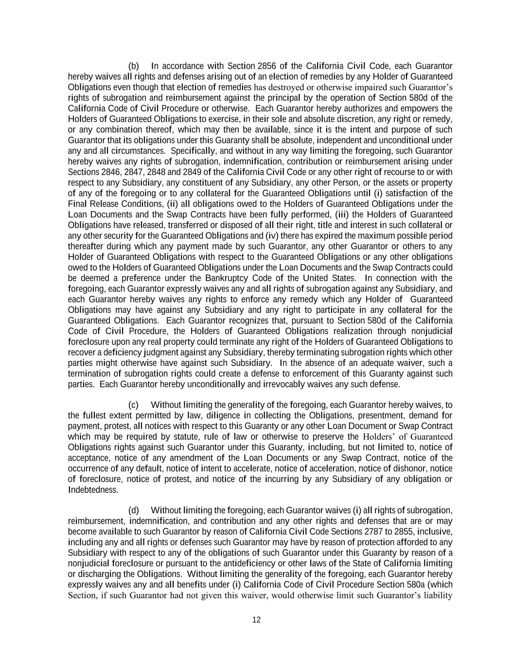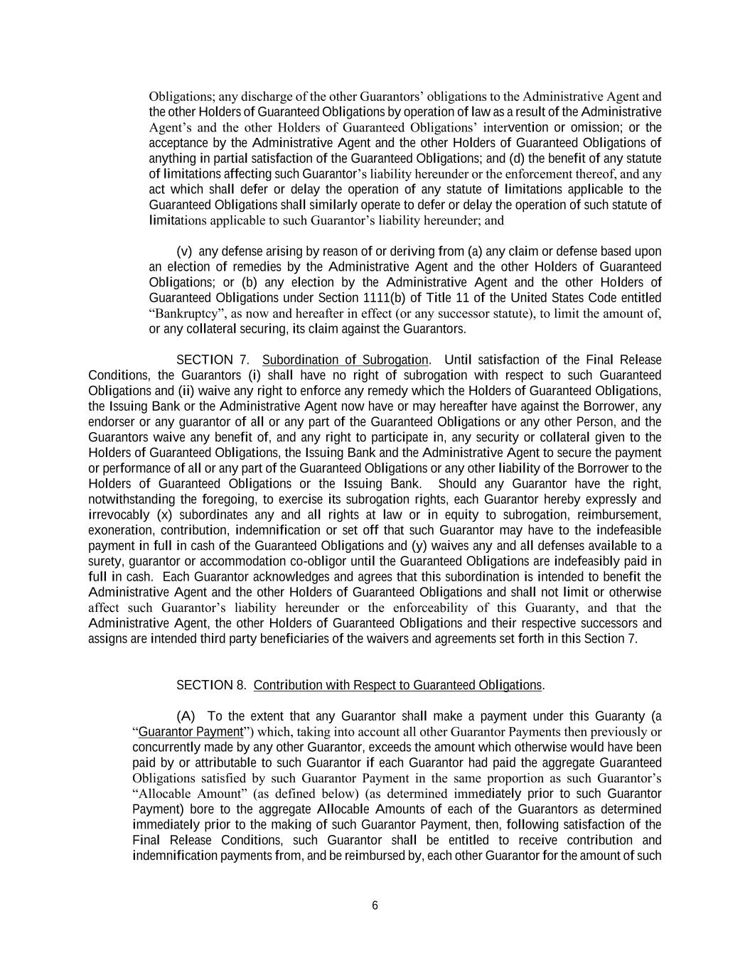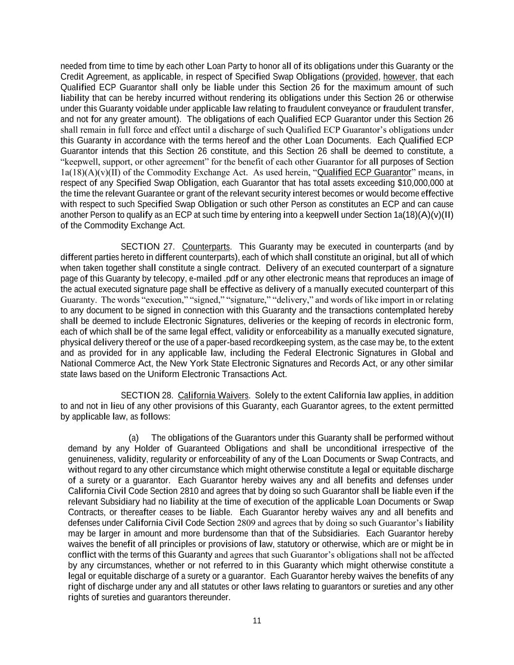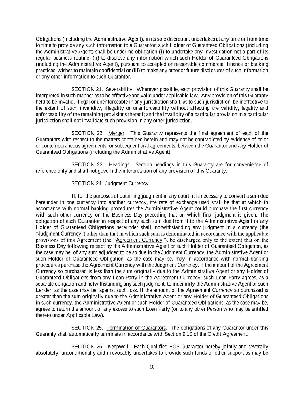 104 14102835v4 10.04 Subrogation. Upon payment by the Borrower of any sums as provided above, all rights of the Borrower against any Subsidiary arising as a result thereof by way of right of subrogation or otherwise shall in all respects be subordinated and junior in right of payment to the prior indefeasible payment in full in cash of all the Additional Guaranteed Obligations owed by such Subsidiary to the applicable Lender (or its applicable Affiliates). 10.05 Keepwell. The Borrower hereby absolutely, unconditionally and irrevocably undertakes to provide such funds or other support as may be needed from time to time by each Guarantor to honor all of its obligations under the Guaranty in respect of Swap Obligations (provided, however, that the Borrower shall only be liable under this paragraph for the maximum amount of such liability that can be hereby incurred without rendering its obligations under this paragraph or otherwise under this Article X voidable under applicable law relating to fraudulent conveyance or fraudulent transfer, and not for any greater amount). The Borrower intends that this paragraph constitute, and this paragraph shall be deemed to constitute, a “keepwell, support, or other agreement” for the benefit of each Guarantor for all purposes of Section 1a(18)(A)(v)(II) of the Commodity Exchange Act. 10.06 Discharge. Nothing shall discharge or satisfy the liability of the Borrower hereunder except the full performance and payment in cash of the Obligations. ARTICLE XI MISCELLANEOUS 11.01 Amendments, Etc. (a) Subject to Section 3.03(c) and the last paragraph of this Section 11.01, no amendment or waiver of any provision of this Agreement or any other Loan Document, and no consent to any departure by the Borrower or any other Loan Party therefrom, shall be effective unless in writing signed by the Required Lenders (or by the Administrative Agent with the consent of the Required Lenders) and the Borrower or the applicable Loan Party, as the case may be, and acknowledged by the Administrative Agent, and each such waiver or consent shall be effective only in the specific instance and for the specific purpose for which given; provided, however, that no such amendment, waiver or consent shall: (i) extend or increase the Commitment of any Lender (or reinstate any Commitment terminated pursuant to Section 8.02) without the written consent of such Lender (it being understood and agreed that a waiver of any condition precedent in Section 4.02 or of any Default or a mandatory reduction in Commitments is not considered an extension or increase in Commitments of any Lender); (ii) postpone any date fixed by this Agreement or any other Loan Document for any payment (excluding mandatory prepayments) of principal, interest, fees or other amounts due to the Lenders (or any of them) or reduce the amount of, waive or excuse any such payment hereunder or under such other Loan Document without the written consent of each Lender entitled to such payment;