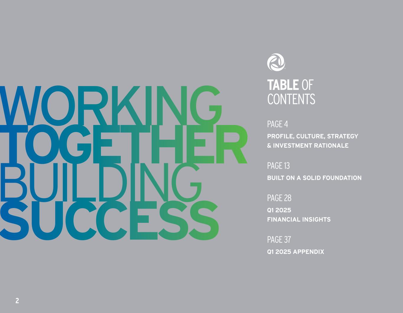 WORKING TOGETHER BUILDING SUCCESS 2 TABLE OF CONTENTS PAGE 4 PROFILE, CULTURE, STRATEGY & INVESTMENT RATIONALE PAGE 13 BUILT ON A SOLID FOUNDATION PAGE 28 Q1 2025 FINANCIAL INSIGHTS PAGE 37 Q1 2025 APPENDIX