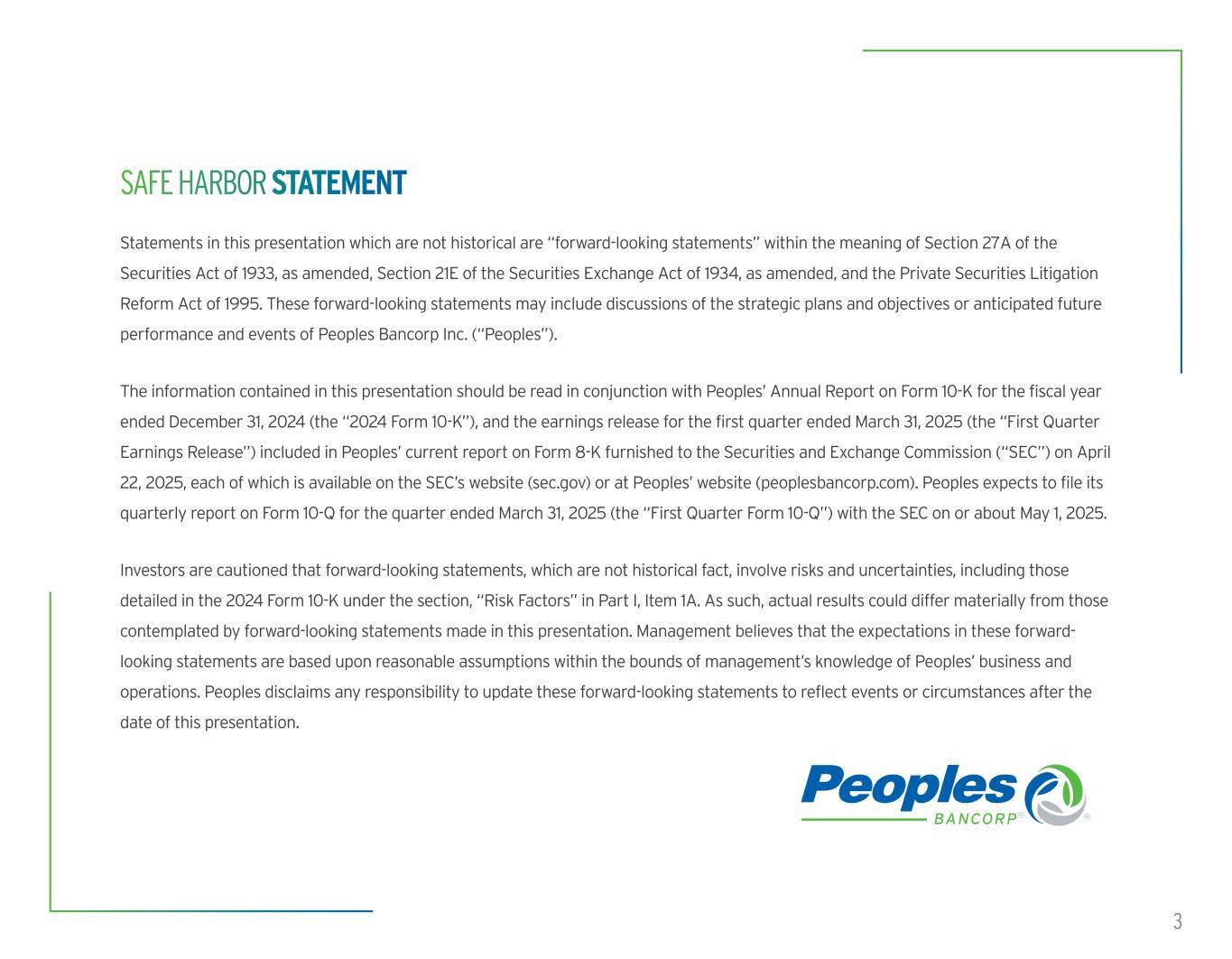 3 Statements in this presentation which are not historical are “forward-looking statements” within the meaning of Section 27A of the Securities Act of 1933, as amended, Section 21E of the Securities Exchange Act of 1934, as amended, and the Private Securities Litigation Reform Act of 1995. These forward-looking statements may include discussions of the strategic plans and objectives or anticipated future performance and events of Peoples Bancorp Inc. (“Peoples”). The information contained in this presentation should be read in conjunction with Peoples’ Annual Report on Form 10-K for the fiscal year ended December 31, 2024 (the “2024 Form 10-K”), and the earnings release for the first quarter ended March 31, 2025 (the “First Quarter Earnings Release”) included in Peoples’ current report on Form 8-K furnished to the Securities and Exchange Commission (“SEC”) on April 22, 2025, each of which is available on the SEC’s website (sec.gov) or at Peoples’ website (peoplesbancorp.com). Peoples expects to file its quarterly report on Form 10-Q for the quarter ended March 31, 2025 (the “First Quarter Form 10-Q”) with the SEC on or about May 1, 2025. Investors are cautioned that forward-looking statements, which are not historical fact, involve risks and uncertainties, including those detailed in the 2024 Form 10-K under the section, “Risk Factors” in Part I, Item 1A. As such, actual results could differ materially from those contemplated by forward-looking statements made in this presentation. Management believes that the expectations in these forward- looking statements are based upon reasonable assumptions within the bounds of management’s knowledge of Peoples’ business and operations. Peoples disclaims any responsibility to update these forward-looking statements to reflect events or circumstances after the date of this presentation. SAFE HARBOR STATEMENT