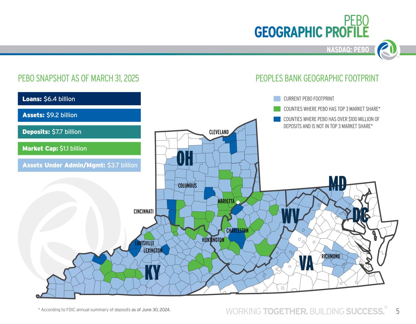 NASDAQ: PEBO PEBO GEOGRAPHIC PROFILE 5WORKING TOGETHER. BUILDING SUCCESS. ® NASDAQ: PEBO PEOPLES BANK GEOGRAPHIC FOOTPRINT COUNTIES WHERE PEBO HAS OVER $100 MILLION OF DEPOSITS AND IS NOT IN TOP 3 MARKET SHARE* COUNTIES WHERE PEBO HAS TOP 3 MARKET SHARE* CURRENT PEBO FOOTPRINT * According to FDIC annual summary of deposits as of June 30, 2024. Loans: $6.4 billion Assets: $9.2 billion Deposits: $7.7 billion Market Cap: $1.1 billion Assets Under Admin/Mgmt: $3.7 billion PEBO SNAPSHOT AS OF MARCH 31, 2025 WV VAKY OH MD DC COLUMBUS CLEVELAND CINCINNATI LEXINGTON LOUISVILLE RICHMOND CHARLESTON MARIETTA HUNTINGTON