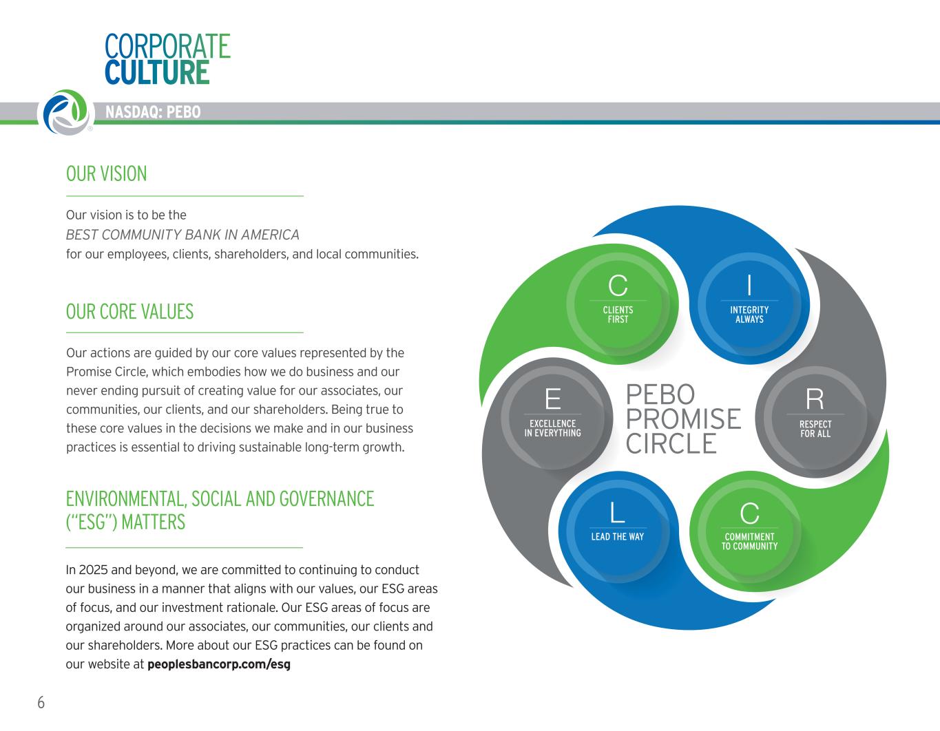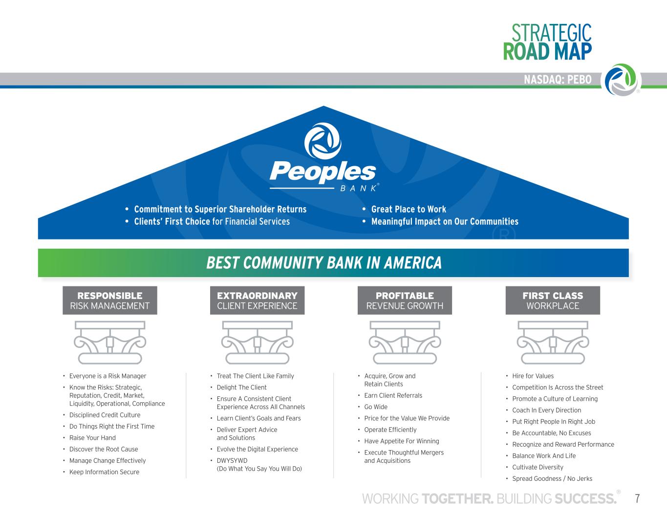 6 CORPORATE CULTURE NASDAQ: PEBO OUR VISION Our vision is to be the BEST COMMUNITY BANK IN AMERICA for our employees, clients, shareholders, and local communities. ENVIRONMENTAL, SOCIAL AND GOVERNANCE (“ESG”) MATTERS In 2025 and beyond, we are committed to continuing to conduct our business in a manner that aligns with our values, our ESG areas of focus, and our investment rationale. Our ESG areas of focus are organized around our associates, our communities, our clients and our shareholders. More about our ESG practices can be found on our website at peoplesbancorp.com/esg Our actions are guided by our core values represented by the Promise Circle, which embodies how we do business and our never ending pursuit of creating value for our associates, our communities, our clients, and our shareholders. Being true to these core values in the decisions we make and in our business practices is essential to driving sustainable long-term growth. OUR CORE VALUES