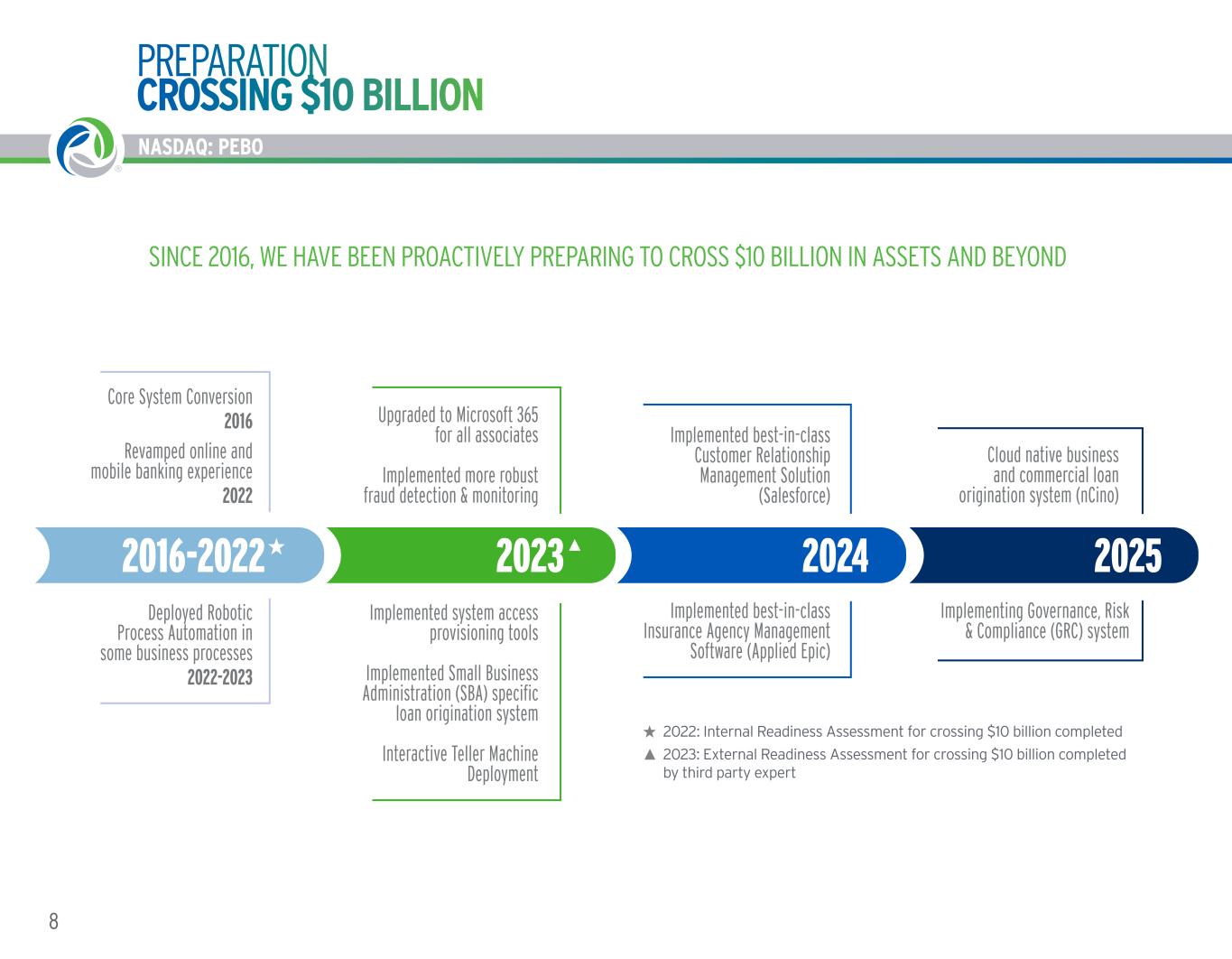 NASDAQ: PEBO STRATEGIC ROAD MAP 7WORKING TOGETHER. BUILDING SUCCESS. ® NASDAQ: PEBO • Everyone is a Risk Manager • Know the Risks: Strategic, Reputation, Credit, Market, Liquidity, Operational, Compliance • Disciplined Credit Culture • Do Things Right the First Time • Raise Your Hand • Discover the Root Cause • Manage Change Effectively • Keep Information Secure • Treat The Client Like Family • Delight The Client • Ensure A Consistent Client Experience Across All Channels • Learn Client’s Goals and Fears • Deliver Expert Advice and Solutions • Evolve the Digital Experience • DWYSYWD (Do What You Say You Will Do) • Acquire, Grow and Retain Clients • Earn Client Referrals • Go Wide • Price for the Value We Provide • Operate Efficiently • Have Appetite For Winning • Execute Thoughtful Mergers and Acquisitions • Hire for Values • Competition Is Across the Street • Promote a Culture of Learning • Coach In Every Direction • Put Right People In Right Job • Be Accountable, No Excuses • Recognize and Reward Performance • Balance Work And Life • Cultivate Diversity • Spread Goodness / No Jerks RESPONSIBLE RISK MANAGEMENT EXTRAORDINARY CLIENT EXPERIENCE PROFITABLE REVENUE GROWTH FIRST CLASS WORKPLACE • Commitment to Superior Shareholder Returns • Clients’ First Choice for Financial Services • Great Place to Work • Meaningful Impact on Our Communities BEST COMMUNITY BANK IN AMERICA