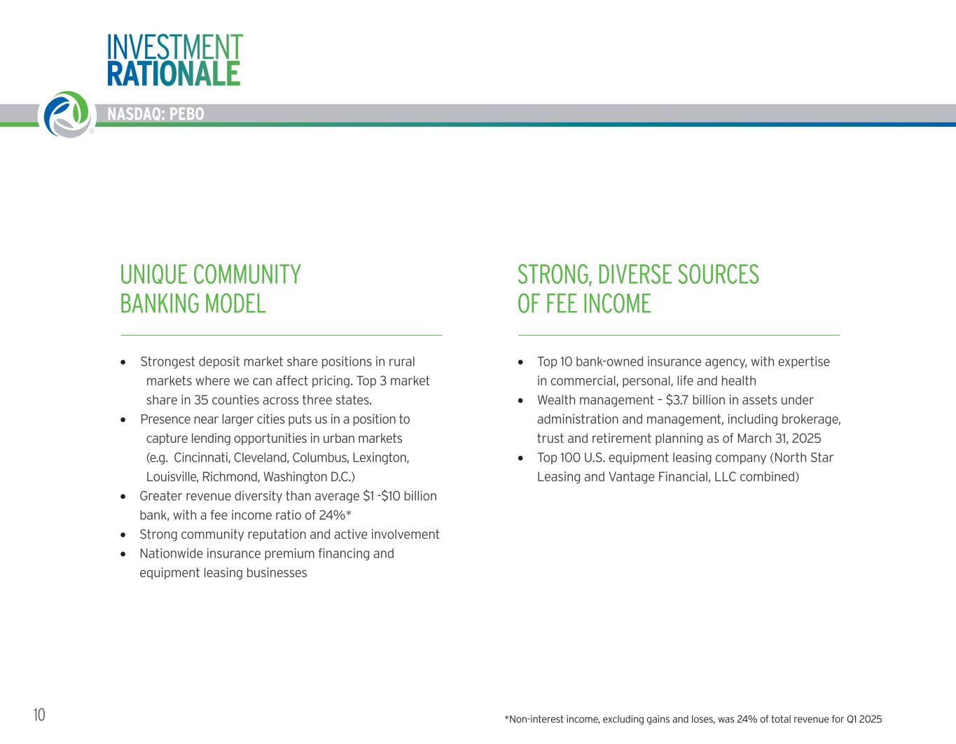 NASDAQ: PEBO 9WORKING TOGETHER. BUILDING SUCCESS. ® NASDAQ: PEBO LEADING EDGE PRODUCTS, TECHNOLOGY AND CAPABILITIES CREDIT CARD SOLUTIONS Purchasing card, ghost card, virtual card, credit cards for consumers and small business COMMERCIAL CAPABILITIES Remote deposit capture, sweep accounts and more FRAUD PREVENTION TOOLS Positive pay, reverse positive pay, debit card on/off switch, 24/7 fraud monitoring and more SPECIALTY FINANCE Online applications and servicing for leasing and premium finance BANKING MOBILE APP Mobile check deposit, Zelle, Apple Pay, ACH approval and more Google Play Store Rating: 4.6 Stars INVESTMENT and INSURANCE APPS Google Play Store Rating as of April 7, 2025