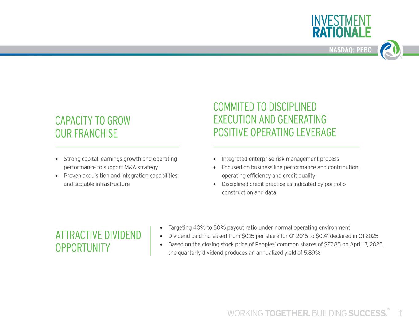 NASDAQ: PEBO 10 INVESTMENT RATIONALE *Non-interest income, excluding gains and loses, was 24% of total revenue for Q1 2025 • Strongest deposit market share positions in rural markets where we can affect pricing. Top 3 market share in 35 counties across three states. • Presence near larger cities puts us in a position to capture lending opportunities in urban markets (e.g. Cincinnati, Cleveland, Columbus, Lexington, Louisville, Richmond, Washington D.C.) • Greater revenue diversity than average $1 -$10 billion bank, with a fee income ratio of 24%* • Strong community reputation and active involvement • Nationwide insurance premium financing and equipment leasing businesses UNIQUE COMMUNITY BANKING MODEL • Top 10 bank-owned insurance agency, with expertise in commercial, personal, life and health • Wealth management – $3.7 billion in assets under administration and management, including brokerage, trust and retirement planning as of March 31, 2025 • Top 100 U.S. equipment leasing company (North Star Leasing and Vantage Financial, LLC combined) STRONG, DIVERSE SOURCES OF FEE INCOME