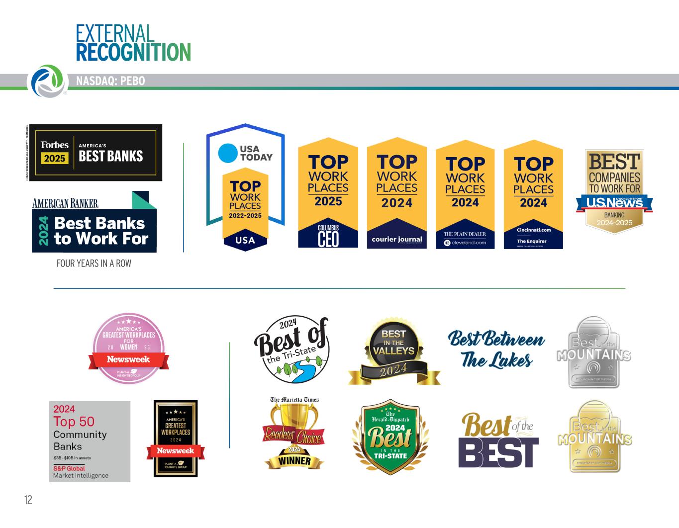 FOUR YEARS IN A ROW Best of the Tri-State 2024 NASDAQ: PEBO EXTERNAL RECOGNITION 12