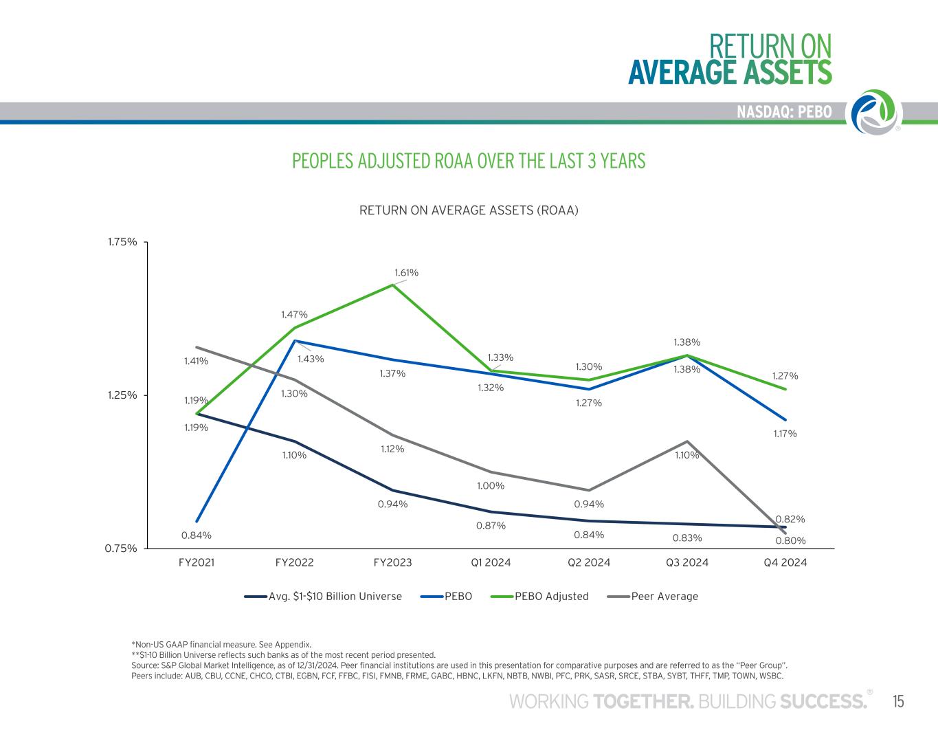14 NASDAQ: PEBO 4.20% 0.00% 0.50% 1.00% 1.50% 2.00% 2.50% 3.00% 3.50% 4.00% 4.50% 5.00% P R K P E B O FF B C T H FF S R C E S T B A C H C O FC F G A B C C C N E S Y B T C T B I N W B I N B T B A U B FR M E LK FN C B U W S B C T O W N H B N C T M P FI S I FM N B P FC S A S R E G B N PEER GROUP-NET INTEREST MARGIN NEAR BEST IN CLASS NET INTEREST MARGIN LARGELY DUE TO STRONG DEPOSIT FRANCHISE PEER GROUP - NET INTEREST MARGIN Source: S&P Global Market Intelligence, as of 12/31/2024. Peer financial institutions are used in this presentation for comparative purposes and are referred to as the “Peer Group”. Peers include: AUB, CBU, CCNE, CHCO, CTBI, EGBN, FCF, FFBC, FISI, FMNB, FRME, GABC, HBNC, LKFN, NBTB, NWBI, PFC, PRK, SASR, SRCE, STBA, SYBT, THFF, TMP, TOWN, WSBC. DATA AS OF DECEMBER 31, 2024 UNIV. $1-$10 B AVERAGE: 3.32% NET INTEREST MARGIN
