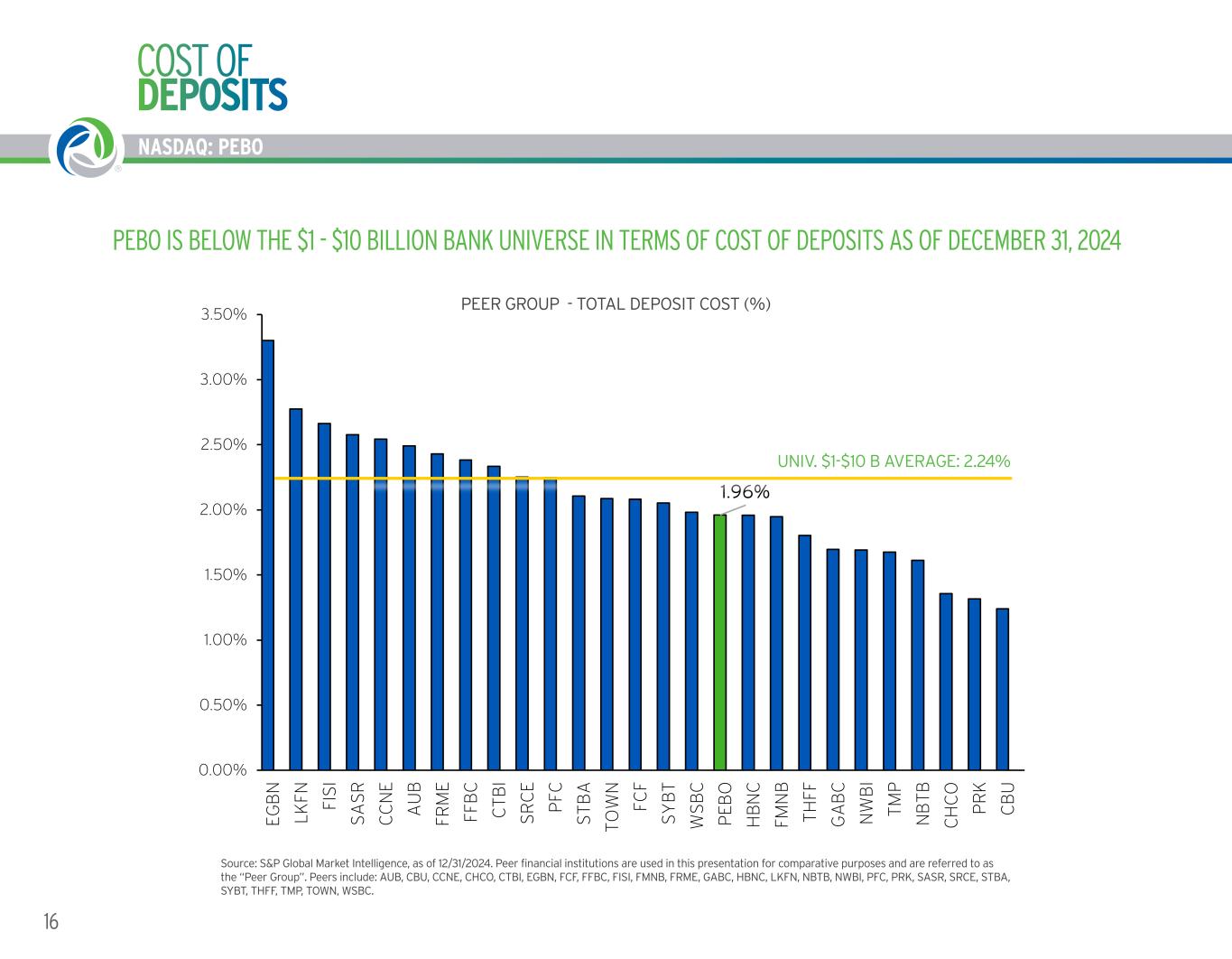 NASDAQ: PEBO 15WORKING TOGETHER. BUILDING SUCCESS. ® NASDAQ: PEBO 1.19% 1.10% 0.94% 0.87% 0.84% 0.83% 0.82% 0.84% 1.43% 1.37% 1.32% 1.27% 1.38% 1.17% 1.19% 1.47% 1.61% 1.33% 1.30% 1.38% 1.27% 1.41% 1.30% 1.12% 1.00% 0.94% 1.10% 0.80% 0.75% 1.25% 1.75% FY2021 FY2022 FY2023 Q1 2024 Q2 2024 Q3 2024 Q4 2024 Avg. $1-$10 Billion Universe PEBO PEBO Adjusted Peer Average RETURN ON AVERAGE ASSETS NEAR BEST IN CLASS NET INTEREST MARGIN LARGELY DUE TO STRONG DEPOSIT FRANCHISE PEER GROUP - NET INTEREST MARGIN PEOPLES ADJUSTED ROAA OVER THE LAST 3 YEARS *Non-US GAAP financial measure. See Appendix. **$1-10 Billion Universe reflects such banks as of the most recent period presented. Source: S&P Global Market Intelligence, as of 12/31/2024. Peer financial institutions are used in this presentation for comparative purposes and are referred to as the “Peer Group”. Peers include: AUB, CBU, CCNE, CHCO, CTBI, EGBN, FCF, FFBC, FISI, FMNB, FRME, GABC, HBNC, LKFN, NBTB, NWBI, PFC, PRK, SASR, SRCE, STBA, SYBT, THFF, TMP, TOWN, WSBC. RETURN ON AVERAGE ASSETS (ROAA)