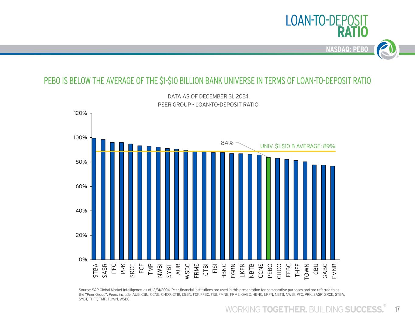 16 NASDAQ: PEBO 1.96% 0.00% 0.50% 1.00% 1.50% 2.00% 2.50% 3.00% 3.50% E G B N LK FN FI S I S A S R C C N E A U B FR M E FF B C C T B I S R C E P FC S T B A T O W N FC F S Y B T W S B C P E B O H B N C FM N B T H FF G A B C N W B I T M P N B T B C H C O P R K C B U PEER GROUP - TOTAL DEPOSIT COST (%) COST OF DEPOSITS Source: S&P Global Market Intelligence, as of 12/31/2024. Peer financial institutions are used in this presentation for comparative purposes and are referred to as the “Peer Group”. Peers include: AUB, CBU, CCNE, CHCO, CTBI, EGBN, FCF, FFBC, FISI, FMNB, FRME, GABC, HBNC, LKFN, NBTB, NWBI, PFC, PRK, SASR, SRCE, STBA, SYBT, THFF, TMP, TOWN, WSBC. UNIV. $1-$10 B AVERAGE: 2.24% PEBO IS BELOW THE $1 - $10 BILLION BANK UNIVERSE IN TERMS OF COST OF DEPOSITS AS OF DECEMBER 31, 2024 PEER GROUP - TOTAL DEPOSIT COST (%)