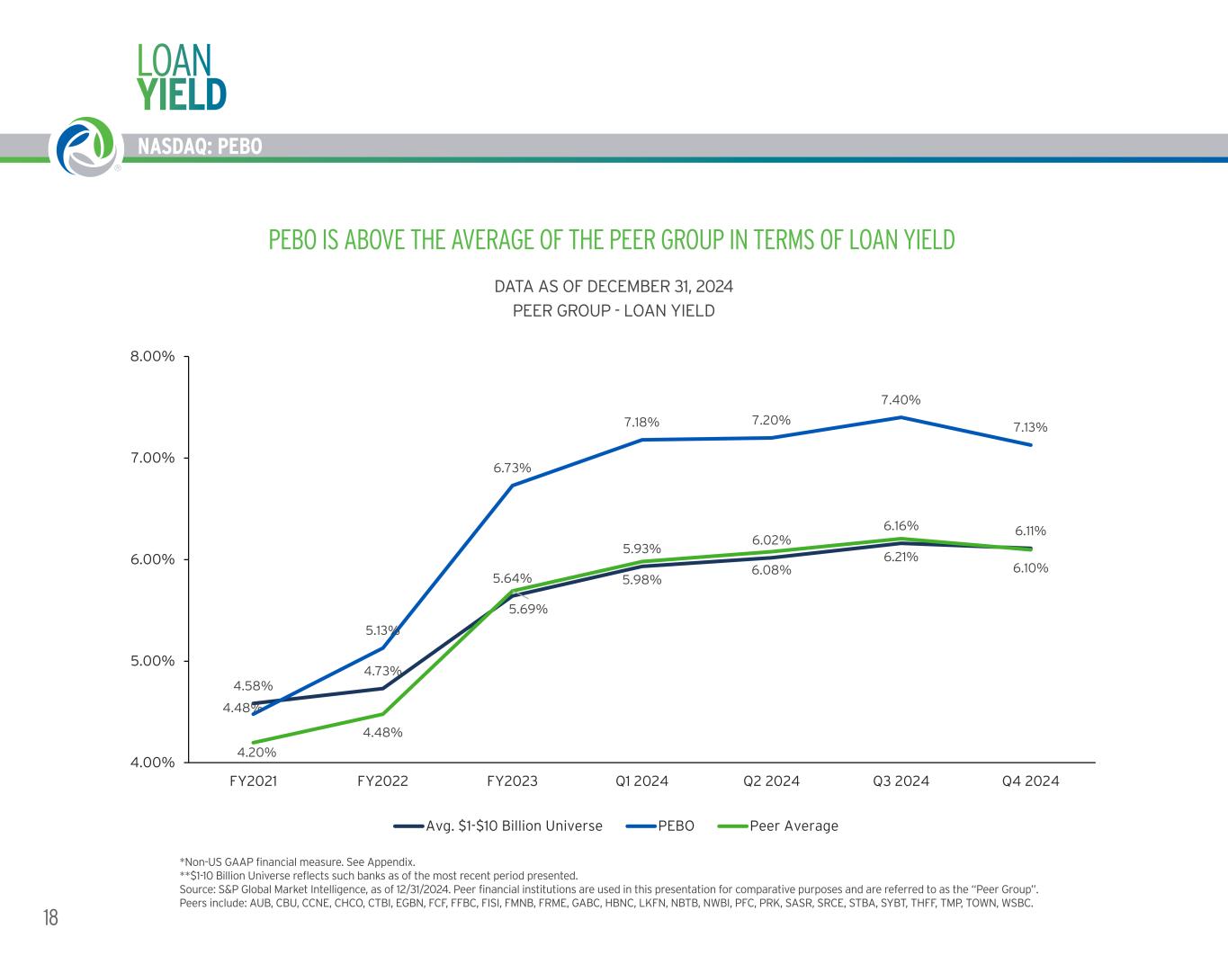 NASDAQ: PEBO 17WORKING TOGETHER. BUILDING SUCCESS. ® NASDAQ: PEBO 84% 0% 20% 40% 60% 80% 100% 120% S T B A S A S R P F C P R K S R C E F C F T M P N W B I S Y B T A U B W S B C F R M E C T B I F IS I H B N C E G B N L K F N N B T B C C N E P E B O C H C O F F B C T H F F T O W N C B U G A B C F M N B PEER GROUP - LOANS / DEPOSITS LOAN-TO-DEPOSIT RATIO Source: S&P Global Market Intelligence, as of 12/31/2024. Peer financial institutions are used in this presentation for comparative purposes and are referred to as the “Peer Group”. Peers include: AUB, CBU, CCNE, CHCO, CTBI, EGBN, FCF, FFBC, FISI, FMNB, FRME, GABC, HBNC, LKFN, NBTB, NWBI, PFC, PRK, SASR, SRCE, STBA, SYBT, THFF, TMP, TOWN, WSBC. PEBO IS BELOW THE AVERAGE OF THE $1-$10 BILLION BANK UNIVERSE IN TERMS OF LOAN-TO-DEPOSIT RATIO PEER P - LOAN-TO-DEPOSIT RATIO DATA AS OF DECEMBER 31, 2024 UNIV. $1-$10 B AVERAGE: 89%