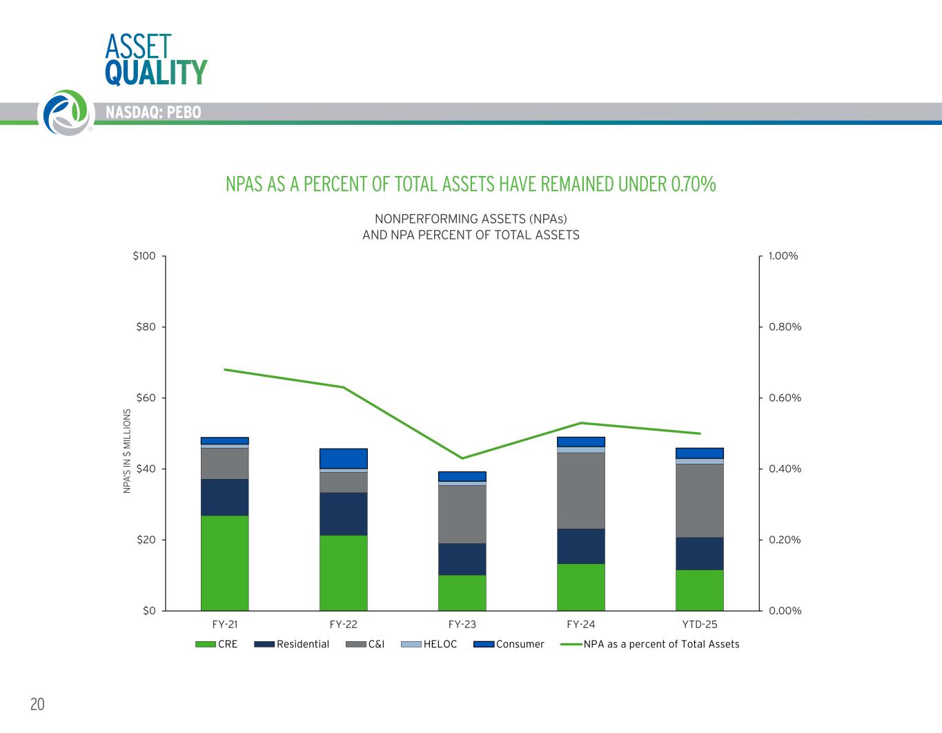 NASDAQ: PEBO 19WORKING TOGETHER. BUILDING SUCCESS. ® NASDAQ: PEBO LOANS & LEASES* PORTFOLIO COMPOSITION • Robust concentration management process focused on portfolio risk diversification • Relationship based lending • Commercial Real Estate (CRE) and Commercial & Industrial (C&I) are balanced with Consumer • CRE financing generally for "A" tier developers only • CRE is 187% of risk based capital as of 3/31/2025 • Very limited out-of-market lending • Growing consumer portfolios organically and through acquisitions POLICY / UNDERWRITING STANDARDS • Experienced, independent commercial and consumer underwriters • Comprehensive commercial underwriting package includes standardized loan covenant language, sensitivity analysis and industry research • Risk appropriate CRE policy standards that vary by asset class • Established limits on policy exceptions; volume and trends monitored monthly • Use of government guarantee programs when appropriate • Use of automated underwriting systems to evaluate all residential loan requests (e.g. Fannie Mae Desktop Underwriter) MANAGEMENT & MONITORING • Clear segregation of duties between sales & credit functions • Signature approval process with Credit Administration representation • Centralized risk rating, borrowing base monitoring, covenant tracking and testing • Consistent documentation and loan funding process centrally managed by Credit Administration with second review • Experienced workout team dedicated to proactive rehabilitation or exit • Construction loan monitoring and funding process independently managed by Credit Administration staff OVERSIGHT • Board approval required for C&I relationships >$40 million • External loan review by large accounting and advisory firm • Quarterly Criticized Asset Review (CAR) meetings for loans > $0.5 million • Quarterly review of Systemically Important Relationships (SIRs) • Monthly Loan Quality Committee meetings • Internal loan reviews are performed annually on all commercial loans > $1 million • Quarterly, the CECL Assumptions Group provides recommendations on the allowance for credit losses (“ACL”) based on their review of economic forecasts and the loan portfolio metrics *Also referred to throughout this document as “total loans” and “loans held for investment” CREDIT RISK MANAGEMENT PROCESS