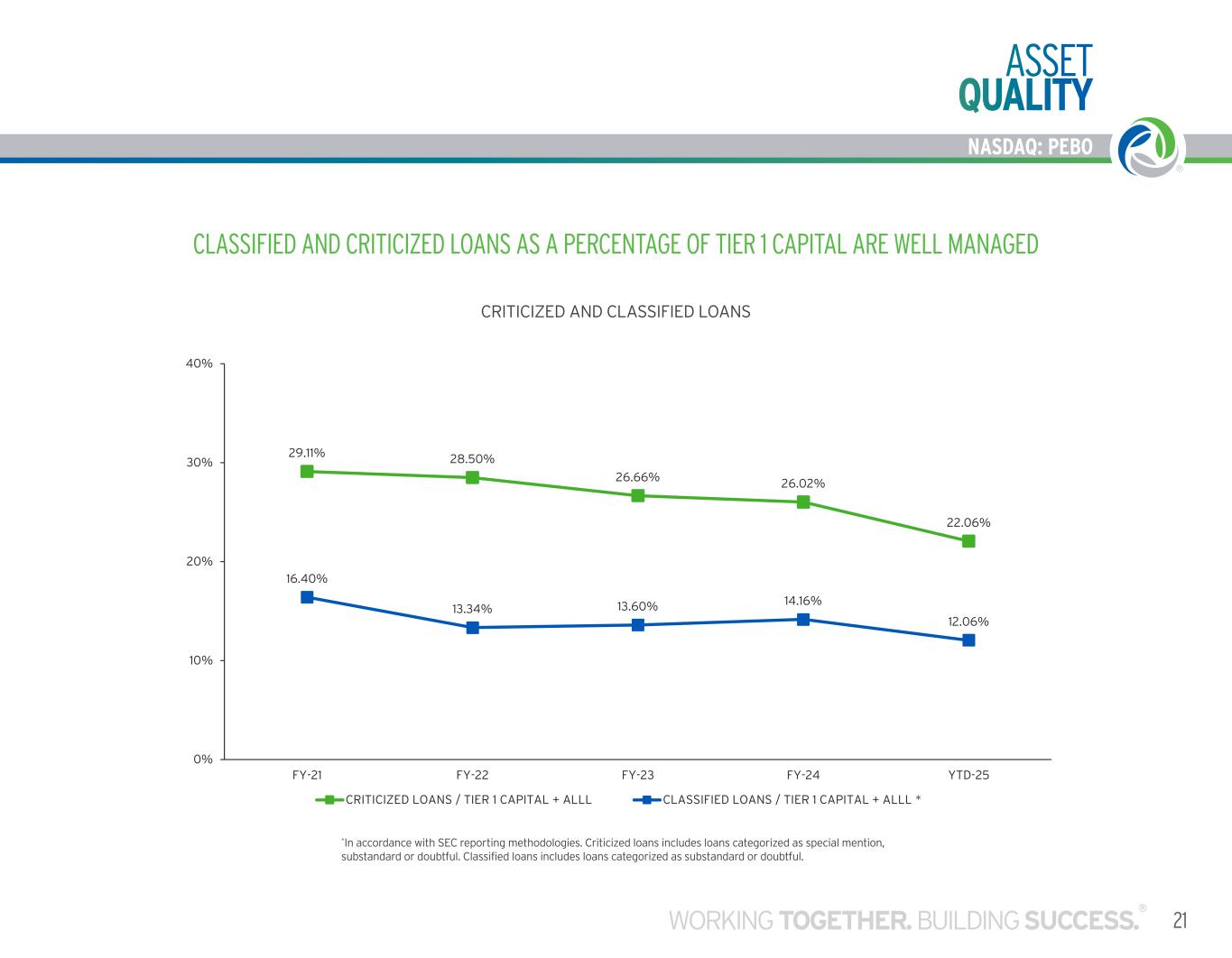 20 NASDAQ: PEBO 0.00% 0.20% 0.40% 0.60% 0.80% 1.00% $0 $20 $40 $60 $80 $100 FY-21 FY-22 FY-23 FY-24 YTD-25 NONPERFORMING ASSETS (NPAs) AND NPA PERCENT OF TOTAL ASSETS CRE Residential C&I HELOC Consumer NPA as a percent of Total Assets CRITICIZED AND CLASSIFIED LOANS NPAS AS A PERCENT OF TOTAL ASSETS HAVE REMAINED UNDER 0.70% N PA ’S IN $ M IL LI O N S NONPERFORMING ASSETS (NPAs) AND NPA PERCENT OF TOTAL ASSETS ASSET QUALITY
