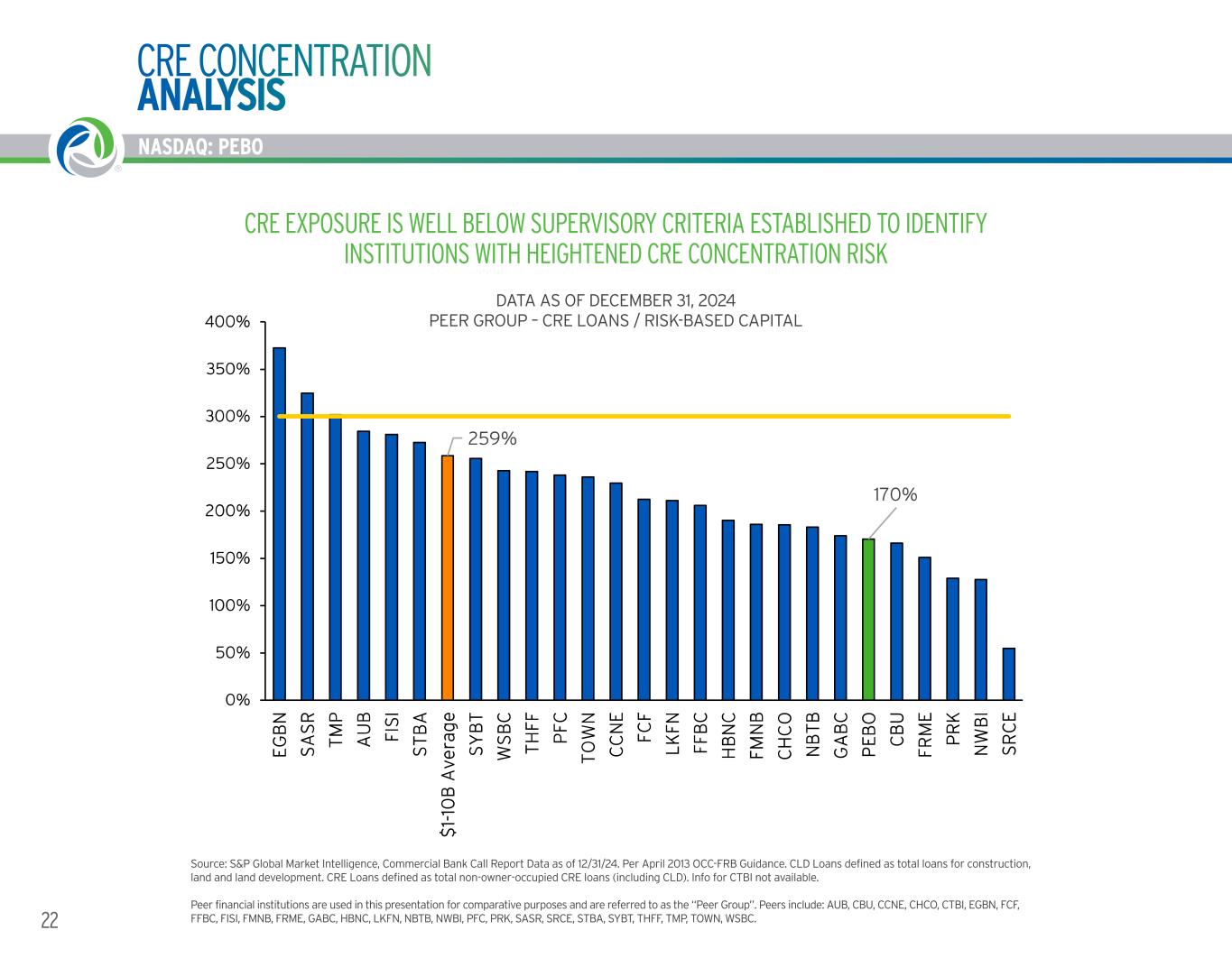 NASDAQ: PEBO 23WORKING TOGETHER. BUILDING SUCCESS. ® NASDAQ: PEBO 47% 35% 0% 20% 40% 60% 80% 100% 120% 140% E G B N F IS I S A S R T H F F S Y B T L K F N W S B C A U B T M P T O W N P F C $ 1- 10 B … C C N E F R M E F F B C F C F H B N C G A B C P E B O S T B A P R K C B U F M N B S R C E N B T B N W B I C H C O PEER GROUP - CONSTRUCTION, LAND AND DEVELOPMENT LOANS / RISK- BASED CAPITAL Source: S&P Global Market Intelligence, Commercial Bank Call Report Data as of 12/31/24. Per April 2013 OCC-FRB Guidance. CLD Loans defined as total loans for construction, land and land development. CRE Loans defined as total non-owner-occupied CRE loans (including CLD). Info for CTBI not available. Peers include: AUB, CBU, CCNE, CHCO, CTBI, EGBN, FCF, FFBC, FISI, FMNB, FRME, GABC, HBNC, LKFN, NBTB, NWBI, PFC, PRK, SASR, SRCE, STBA, SYBT, THFF, TMP, TOWN, WSBC. DATA AS OF DECEMBER 31, 2024 PEER GROUP - CONSTRUCTION, LAND AND LAND DEVELOPMENT LOANS / RISK-BASED CAPITAL PEBO IS MEANINGFULLY BELOW THE AVERAGE FOR $1-10 BILLION BANKS IN TERMS OF CONSTRUCTION, LAND AND LAND DEVELOPMENT LOANS / RISK-BASED CAPITAL CRE CONCENTRATION ANALYSIS