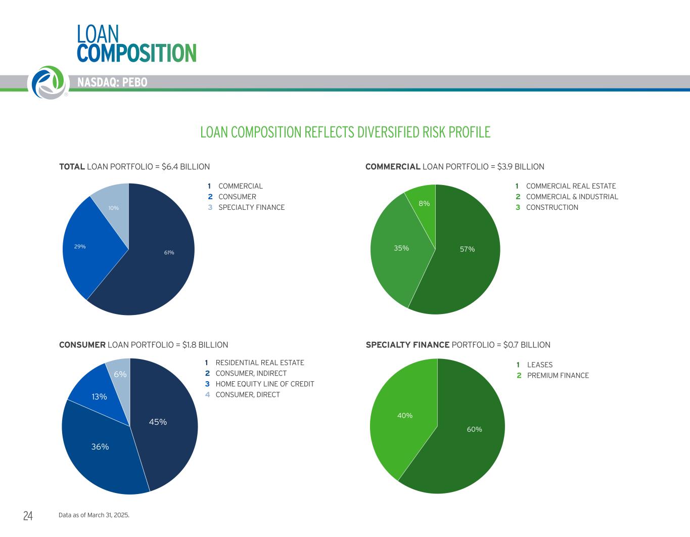 24 NASDAQ: PEBO 60% 40% SPECIALITY FINANCE PORTFOLIO LEASES PREIMUM FINANCE45% 36% 13% 6% CONSUMER LOAN PORTFOLIO RESIDENTIAL REAL ESTATE COSUMER, INDIRECT HOME EQUITY LINE OF CREDIT CONSUMER, DIRECT 57%35% 8% COMMERICAL LOAN PORTFOLIO COMMERICAL REAL ESTATE COMMERCIAL & INDUSTRIAL CONSTRUCTION 61% 29% 10% TOTAL LOAN PORTFOLIO COMMERICAL CONSUMER SPECIALITY FINANCE Data as of March 31, 2025. LOAN COMPOSITION REFLECTS DIVERSIFIED RISK PROFILE LOAN COMPOSITION TOTAL LOAN PORTFOLIO = $6.4 BILLION COMMERCIAL CONSUMER SPECIALTY FINANCE 1 2 3 CONSUMER LOAN PORTFOLIO = $1.8 BILLION RESIDENTIAL REAL ESTATE CONSUMER, INDIRECT HOME EQUITY LI E OF CREDIT CONSUMER, DIRECT 1 2 3 4 COMMERCIAL LOAN PORTFOLIO = $3.9 BILLION COMMERCIAL REAL ESTATE COMMERCIAL & INDUSTRIAL CONSTRUCTION 1 2 3 SPECIALTY FINANCE PORTFOLIO = $0.7 BILLION LEASES PREMIUM FINANCE 1 2