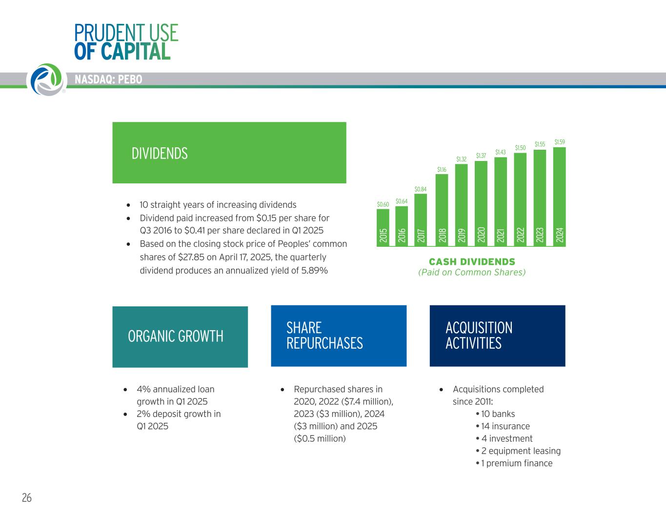 NASDAQ: PEBO 25WORKING TOGETHER. BUILDING SUCCESS. ® NASDAQ: PEBO 25% 21% 9% 6% 6% 4% 3% 3% 3% 2% 18% TOTAL C&I PORTFOLIO= $1.3 BILLION FOOD SERVICES RETAIL TRADE CONTRACTORS MANUFACTURING (FOOD, BEVERAGE, TEXTILE, LEATHER, WOOD, PAPER, CHEMICAL) REAL ESTATE AMBULATORY HEALTH CARE SERVICES WHOLESALE TRADE PROFESSIONAL, SCIENTIFIC, AND TECHNICAL SERVICES TRANSPORTATION MACHINERY MANUFACTURING OTHER 18% 11% 11% 9%8% 5% 3% 4% 3% 2% 27% TOTAL CRE LOAN PORTFOLIO* = $2.2 BILLION APARTMENT RETAIL INDUSTRIAL OFFICE BUILDING LODGING ASSISTED LIVING WAREHOUSE RESTAURANT MIXED USE HEALTHCARE OTHER 52% 21% 19% 3% 3% 0% 0% 2% GEOGRAPHIC DISPERSION OF TOTAL LOAN EXPOSURE (COMMITMENTS)^ OHIO KENTUCKY WEST VIRGINIA VIRGINIA MARYLAND WASHINGTON DC PENNSLYVANIA OTHER STATES LOAN COMPOSITION REFLECTS DIVERSIFIED RISK PROFILE LOAN COMPOSITION Data as of March 31, 2025. *Total includes commercial real estate and construction loans, and exposure includes commitments. **Top ten categories in terms of loan size are shown (remaining categories in other) ^ EXCLUDES PREMIUM FINANCE, NORTH STAR LEASING AND VANTAGE LEASING TOTAL C&I PORTFOLIO* = $1.3 BILLION TOTAL CRE PORTFOLIO* = $2.2 BILLION 26% NORTH STAR LEASING BY SEGMENTGEOGRAPHIC DISPERSION OF TOTAL LOAN EXPOSURE (COM ITME OHIO KENTUCKY WEST VIRGINIA VIRGINIA MARYLAND WASHINGTON DC PENNSYLV IA OTHER STATES 1 2 3 4 5 6 7 8 FOOD SERVICES RETAIL TRADE CONTRACTORS MANUFACTURING REAL ESTATE AMBULATORY SERVICES WHOLESALE TRADE PROFESSIONAL, SCIENTIFIC, AND TECHNICAL SERVICES TRANSPORTATION MACHINERY MANUFACTURING OTHER 1 2 3 4 5 6 7 8 9 10 11 APARTMENT RETAIL INDUSTRIAL OFFICE BUILDING LODGING ASSISTED LIVING WAREHOUSE RESTAURANT MIXED USE HEALTHCARE OTHER 1 2 3 4 5 6 7 8 9 10 11 RESTAURANT TITLED - VOCATIONAL TRUCKING/TRAILER/FLEET BREWERY/DISTILLERY HEAVY EQUIPMENT MANUFACTURING OTHER 1 2 3 4 5 6 7 21% 13% 10% 9% 8% 6% 33% NORTH STAR LEASING BY SEGMENT Restaurant Titled - Vocational Titled - Trucking/Trailer/Flee t Brewery/Distillery Heavy Equipment Manufacturing - Production Other