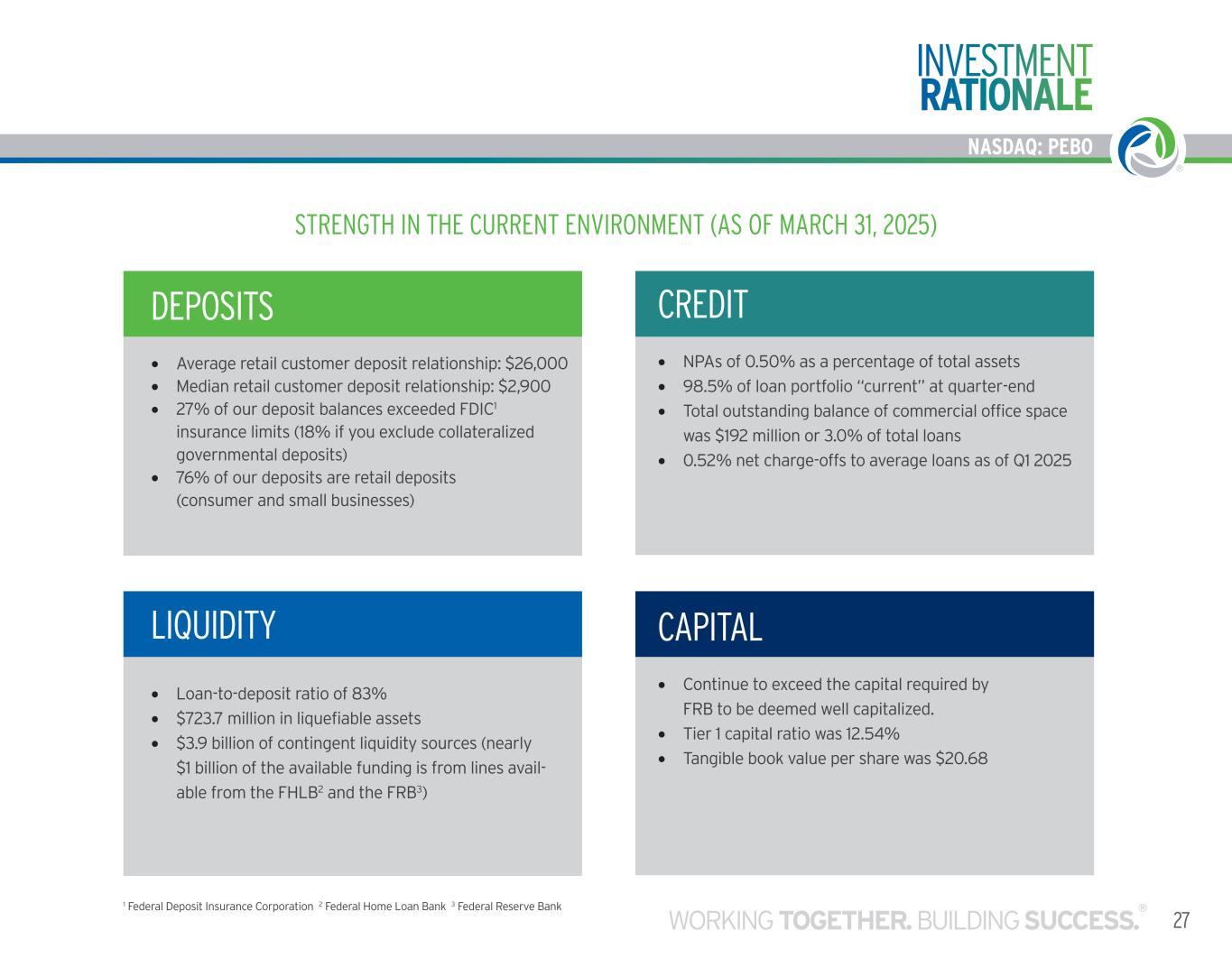 NASDAQ: PEBO 27WORKING TOGETHER. BUILDING SUCCESS. ® NASDAQ: PEBO INVESTMENT RATIONALE CREDIT • NPAs of 0.50% as a percentage of total assets • 98.5% of loan portfolio “current” at quarter-end • Total outstanding balance of commercial office space was $192 million or 3.0% of total loans • 0.52% net charge-offs to average loans as of Q1 2025 CAPITAL • Continue to exceed the capital required by FRB to be deemed well capitalized. • Tier 1 capital ratio was 12.54% • Tangible book value per share was $20.68 DEPOSITS • Average retail customer deposit relationship: $26,000 • Median retail customer deposit relationship: $2,900 • 27% of our deposit balances exceeded FDIC1 insurance limits (18% if you exclude collateralized governmental deposits) • 76% of our deposits are retail deposits (consumer and small businesses) LIQUIDITY • Loan-to-deposit ratio of 83% • $723.7 million in liquefiable assets • $3.9 billion of contingent liquidity sources (nearly $1 billion of the available funding is from lines avail- able from the FHLB2 and the FRB3) STRENGTH IN THE CURRENT ENVIRONMENT (AS OF MARCH 31, 2025) 1 Federal Deposit Insurance Corporation 2 Federal Home Loan Bank 3 Federal Reserve Bank