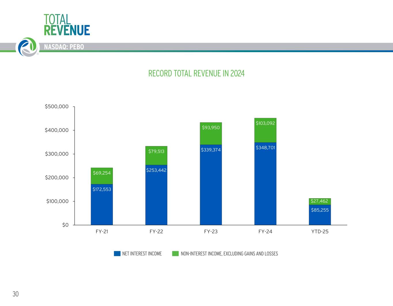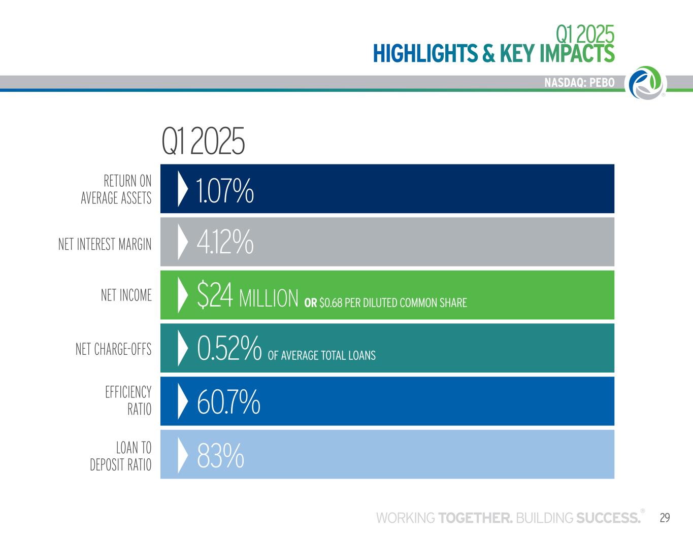 NASDAQ: PEBO 29WORKING TOGETHER. BUILDING SUCCESS. ® NASDAQ: PEBO Q1 2025 HIGHLIGHTS & KEY IMPACTS LOAN TO DEPOSIT RATIO 83% NET INCOME $24 MILLION OR $0.68 PER DILUTED COMMON SHARE NET CHARGE-OFFS 0.52% OF AVERAGE TOTAL LOANS EFFICIENCY RATIO 60.7% RETURN ON AVERAGE ASSETS 1.07% NET INTEREST MARGIN 4.12% Q1 2025