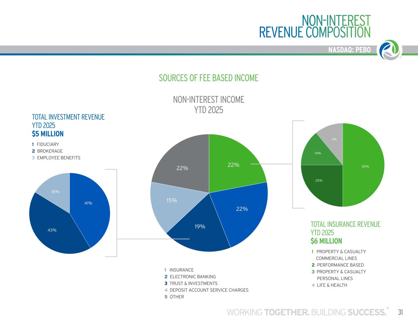 $172,553 $253,442 $339,374 $348,701 $85,255 $69,254 $79,513 $93,950 $103,092 $27,462 $0 $100,000 $200,000 $300,000 $400,000 $500,000 FY-21 FY-22 FY-23 FY-24 YTD-25 RECORD TOTAL REVENUE IN 2024 NET INTEREST INCOME NON-INTEREST INCOME, EXCLUDING GAINS AND LOSSES 30 TOTAL REVENUE NASDAQ: PEBO RECORD TOTAL REVENUE IN 2024 SOURCES OF FEE BASED INCOME NON-INTEREST INCOME YTD 2025 NON-INTEREST INCOME, EXCLUDING GAINS AND LOSSESNET INTEREST INCOME