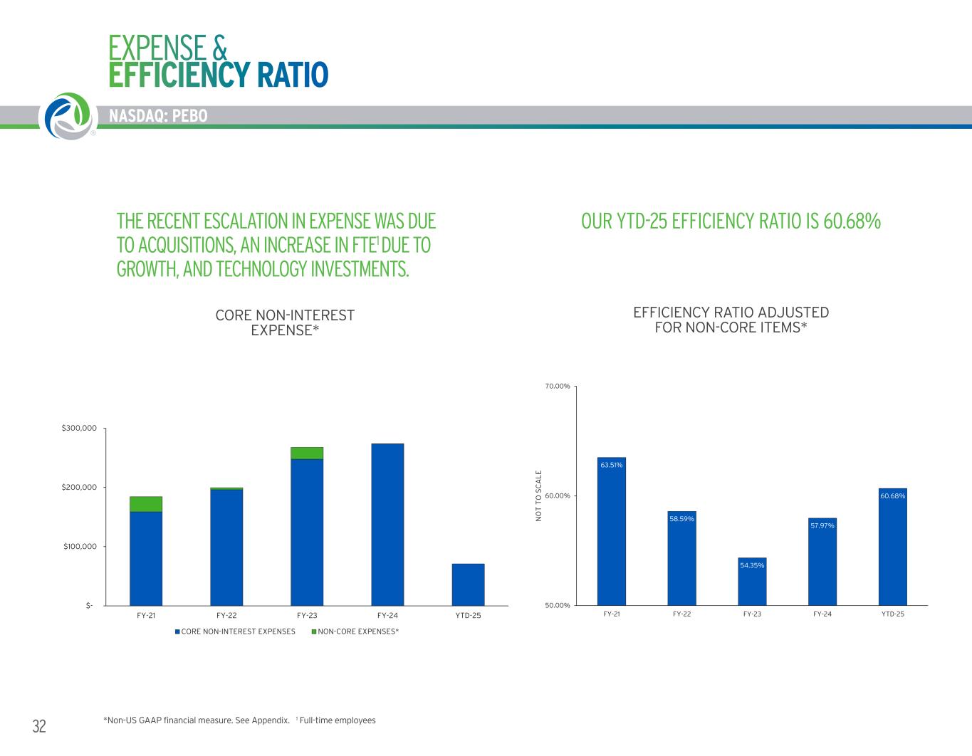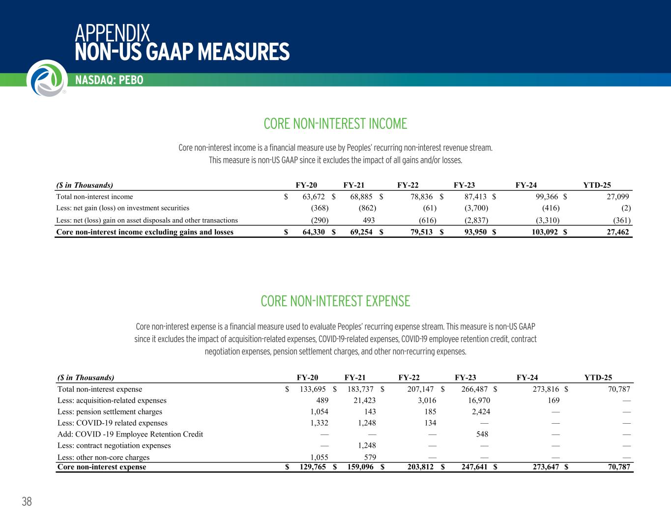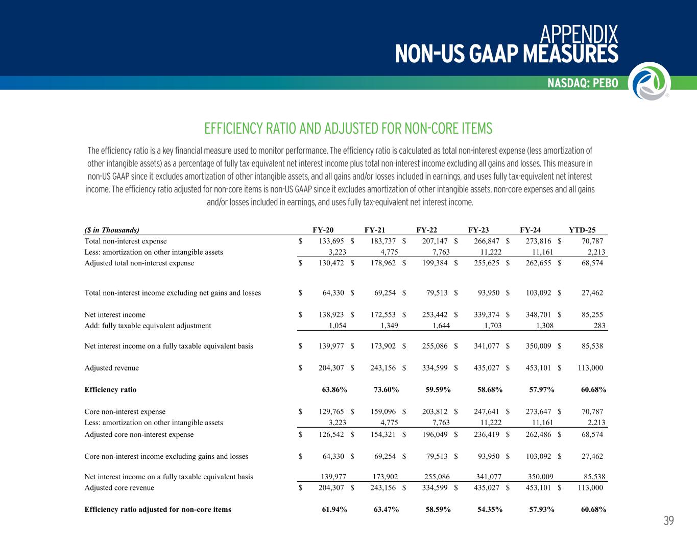 APPENDIX NON-US GAAP MEASURES NASDAQ: PEBO 39 EFFICIENCY RATIO AND ADJUSTED FOR NON-CORE ITEMS ($ in Thousands) FY-20 FY-21 FY-22 FY-23 FY-24 YTD-25 Total non-interest expense $ 133,695 $ 183,737 $ 207,147 $ 266,847 $ 273,816 $ 70,787 Less: amortization on other intangible assets 3,223 4,775 7,763 11,222 11,161 2,213 Adjusted total non-interest expense $ 130,472 $ 178,962 $ 199,384 $ 255,625 $ 262,655 $ 68,574 Total non-interest income excluding net gains and losses $ 64,330 $ 69,254 $ 79,513 $ 93,950 $ 103,092 $ 27,462 Net interest income $ 138,923 $ 172,553 $ 253,442 $ 339,374 $ 348,701 $ 85,255 Add: fully taxable equivalent adjustment 1,054 1,349 1,644 1,703 1,308 283 Net interest income on a fully taxable equivalent basis $ 139,977 $ 173,902 $ 255,086 $ 341,077 $ 350,009 $ 85,538 Adjusted revenue $ 204,307 $ 243,156 $ 334,599 $ 435,027 $ 453,101 $ 113,000 Efficiency ratio 63.86% 73.60% 59.59% 58.68% 57.97% 60.68% Core non-interest expense $ 129,765 $ 159,096 $ 203,812 $ 247,641 $ 273,647 $ 70,787 Less: amortization on other intangible assets 3,223 4,775 7,763 11,222 11,161 2,213 Adjusted core non-interest expense $ 126,542 $ 154,321 $ 196,049 $ 236,419 $ 262,486 $ 68,574 Core non-interest income excluding gains and losses $ 64,330 $ 69,254 $ 79,513 $ 93,950 $ 103,092 $ 27,462 Net interest income on a fully taxable equivalent basis 139,977 173,902 255,086 341,077 350,009 85,538 Adjusted core revenue $ 204,307 $ 243,156 $ 334,599 $ 435,027 $ 453,101 $ 113,000 Efficiency ratio adjusted for non-core items 61.94% 63.47% 58.59% 54.35% 57.93% 60.68% The efficiency ratio is a key financial measure used to monitor performance. The efficiency ratio is calculated as total non-interest expense (less amortization of other intangible assets) as a percentage of fully tax-equivalent net interest income plus total non-interest income excluding all gains and losses. This measure in non-US GAAP since it excludes amortization of other intangible assets, and all gains and/or losses included in earnings, and uses fully tax-equivalent net interest income. The efficiency ratio adjusted for non-core items is non-US GAAP since it excludes amortization of other intangible assets, non-core expenses and all gains and/or losses included in earnings, and uses fully tax-equivalent net interest income. CORE NON-INTEREST EXPENSE