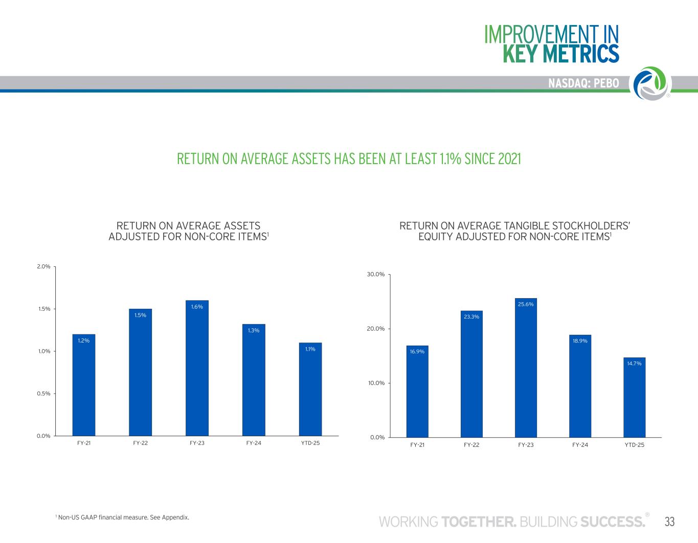 APPENDIX NON-US GAAP MEASURES NASDAQ: PEBO 43 RETURN ON AVERAGE STOCKHOLDERS’ EQUITY ADJUSTED FOR NON-CORE ITEMS (a) Tax effect is calculated using a 21% federal statutory tax rate for all periods represented. The return on average stockholders' equity adjusted for non-core items represents a non-US GAAP financial measure since it excludes the after-tax impacts of all gains and losses, acquisition-related expenses, COVID-19 expenses, COVID-19 employee retention credit, and contract negotiation expenses. ($ in Thousands) FY-20 FY-21 FY-22 FY-23 FY-24 YTD-25 Return on average equity adjusted for non-core items: Net income $ 34,767 $ 47,555 $ 101,292 $ 113,363 $ 117,205 $ 24,336 Add: net loss on investment securities 368 862 61 3,700 416 2 Less: tax effect of net loss on investment securities (a) 77 181 13 777 87 — Less: net gain on assets disposals and other transactions — 493 — — — — Add: tax effect of net gain on asset disposals and other transactions — 104 — — — — Add: net loss on asset disposals and other transactios 290 — 616 2,837 3,310 361 Less: tax effect on net loss on asset disposals and other transactions (a) 61 — 129 596 695 76 Add: acquisition-related expenses 489 21,423 3,016 16,970 169 — Less: tax effect on acquisition-related expenses (a) 103 4,499 633 3,564 35 — Add: pension settlement charges 1,054 143 185 2,424 — — Less: tax effect on pension settlement charges (a) 221 30 39 509 — — Add: COVID-19 expenses 1,332 1,248 134 — — — Less: tax effect on COVID-19 related expenses (a) 280 262 28 — — — Less: COVID -19 Employee Retention Credit — — — 548 — — Add: tax effect of COVID -19 Employee Retention Credit — — — 115 — — Add: other non-core charges 1,055 579 — — — — Less: tax effect on other non-core charges (a) 222 122 — — — — Add: contract negotiation fees — 1,248 — — — — Less: tax effect on contract negotiation expenses (a) — 262 — — — — Net income adjusted for non-core items $ 38,391 $ 67,312 $ 104,461 $ 133,415 $ 120,283 $ 24,623 Average equity $ 575,386 $ 656,633 $ 797,984 $ 940,797 $ 1,083,792 $ 1,122,860 Return on average equity adjusted for non-core items 6.67% 10.25% 13.09% 14.18% 11.10% 8.89% Net income adjusted for non-core items excluding the amortization of intangible assets $ 40,937 $ 71,086 $ 110,594 $ 142,280 $ 129,100 $ 26,371 Average tangible equity $ 393,860 $ 421,966 $ 475,345 $ 556,625 $ 677,173 $ 721,516 Return on average tangible equity adjusted for non-core items 10.39% 16.85% 23.27% 25.56% 19.06% 14.82%