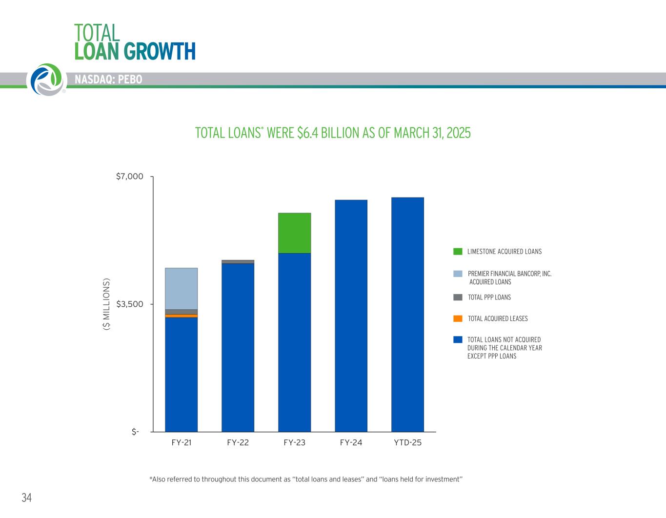 16.9% 23.3% 25.6% 18.9% 14.7% 0.0% 10.0% 20.0% 30.0% FY-21 FY-22 FY-23 FY-24 YTD-25 RETURN ON AVERAGE TANGIBLE STOCKHOLDERS EQUITY ADJUSTED FOR NON-CORE ITEMS NASDAQ: PEBO IMPROVEMENT IN KEY METRICS 33WORKING TOGETHER. BUILDING SUCCESS. ® NASDAQ: PEBO RETURN ON AVERAGE ASSETS HAS BEEN AT LEAST 1.1% SINCE 2021 1 Non-US GAAP financial measure. See Appendix. 16.9% 25.6% RETURN ON AVERAGE ASSETS ADJUSTED FOR NON-CORE ITEMS1 RETURN ON AVERAGE TANGIBLE STOCKHOLDERS’ EQUITY ADJUSTED FOR NON-CORE ITEMS1 1.2% 1.5% 1.6% 1.3% 1.1% 0.0% 0.5% 1.0% 1.5% 2.0% FY-21 FY-22 FY-23 FY-24 YTD-25 RETURN ON AVERAGE ASSETS ADJUSTED FOR NON-CORE ITEMS