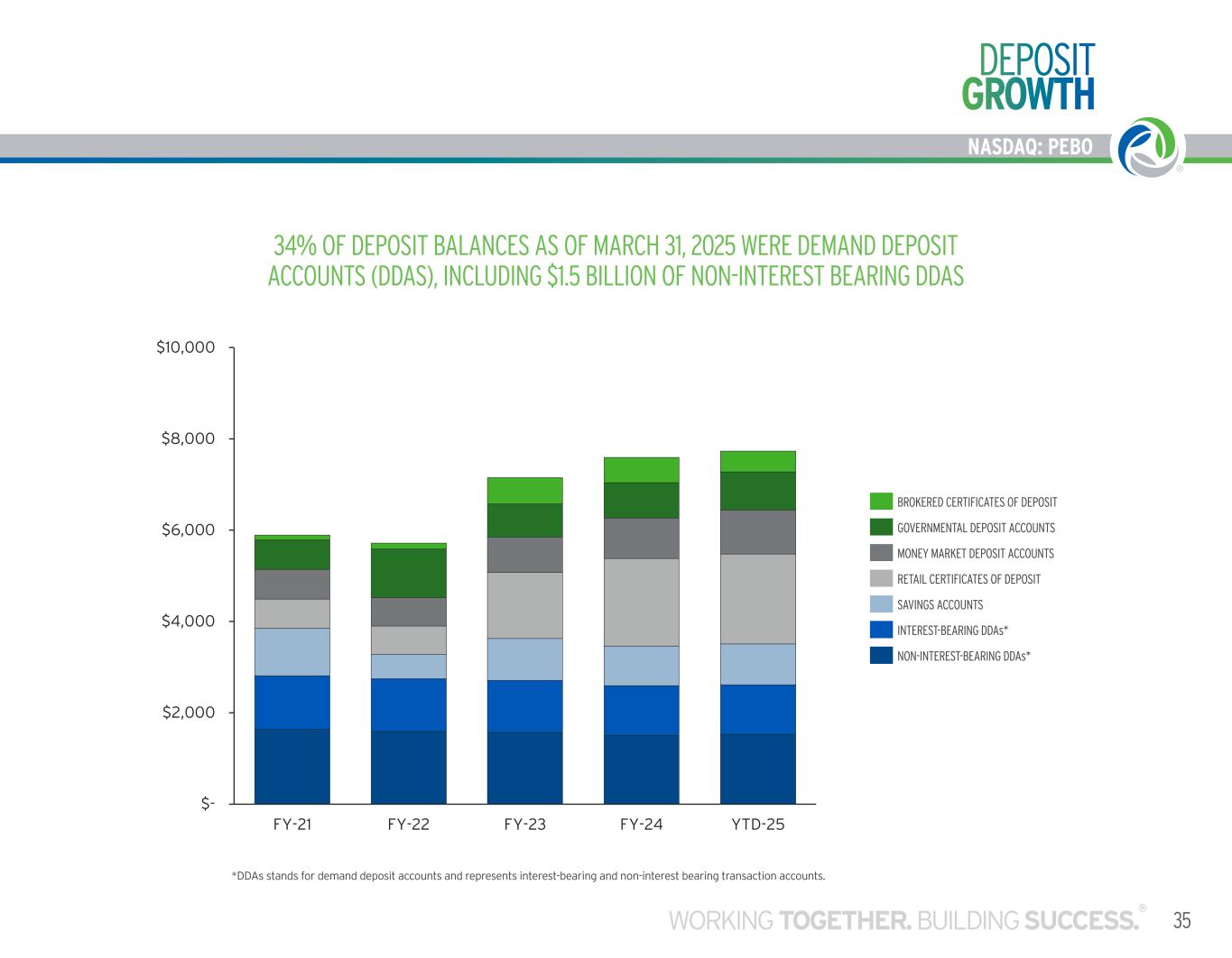 34% OF DEPOSIT BALANCES AS OF MARCH 31, 2025 WERE DEMAND DEPOSIT ACCOUNTS (DDAS), INCLUDING $1.5 BILLION OF NON-INTEREST BEARING DDAS *DDAs stands for demand deposit accounts and represents interest-bearing and non-interest bearing transaction accounts. DEPOSIT GROWTH NASDAQ: PEBO 35WORKING TOGETHER. BUILDING SUCCESS. ® NASDAQ: PEBO BROKERED CERTIFICATES OF DEPOSIT GOVERNMENTAL DEPOSIT ACCOUNTS MONEY MARKET DEPOSIT ACCOUNTS RETAIL CERTIFICATES OF DEPOSIT SAVINGS ACCOUNTS INTEREST-BEARING DDAs* NON-INTEREST-BEARING DDAs* $- $2,000 $4,000 $6,000 $8,000 $10,000 FY-21 FY-22 FY-23 FY-24 YTD-25 DEPOSIT BALANCES AS OF DECEMBER 31, 2024 BROKER CERTIFICATES OF DEPOSIT GOVERNMENTAL DEPOSIT ACCOUNTS MONEY MARKET DEPOSIT ACCOUNTS RETAIL CERTIFICATES OF DEPOSIT SAVINGS ACCOUNTS INTEREST-BEARI G DDs* NON-INTEREST-BEARING DDs*