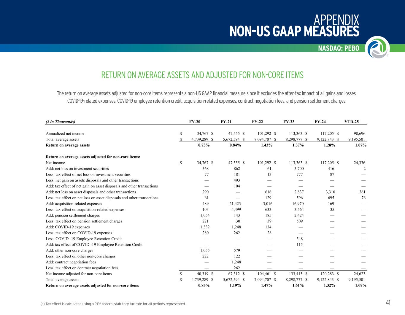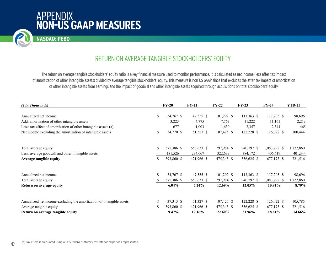 APPENDIX NON-US GAAP MEASURES NASDAQ: PEBO 41 Peoples uses tangible capital measures to evaluate the adequacy of Peoples’ stockholders’. Such ratios represent non-US GAAP financial measures since the calculation removes the impact of goodwill and other intangible assets acquired through acquisitions on both total stockholders’ equity and total assets. Management believes this information is useful to investors since it facilitates the comparison of Peoples’ operating performance, financial condition and trends to peers, especially those without a level of intangible assets similar to that of Peoples. The following table reconciles the calculation of these non-US GAAP financial measures to amounts reported in Peoples’ consolidated financial statements. (a) Tax effect is calculated using a 21% federal statutory tax rate for all periods represented. RETURN ON AVERAGE ASSETS AND ADJUSTED FOR NON-CORE ITEMS The return on average assets adjusted for non-core items represents a non-US GAAP financial measure since it excludes the after-tax impact of all gains and losses, COVID-19-related expenses, COVID-19 employee retention credit, acquisition-related expenses, contract negotiation fees, and pension settlement charges. ($ in Thousands) FY-20 FY-21 FY-22 FY-23 FY-24 YTD-25 Annualized net income $ 34,767 $ 47,555 $ 101,292 $ 113,363 $ 117,205 $ 98,696 Total average assets $ 4,739,289 $ 5,672,594 $ 7,094,707 $ 8,298,777 $ 9,122,843 $ 9,195,501 Return on average assets 0.73% 0.84% 1.43% 1.37% 1.28% 1.07% Return on average assets adjusted for non-core items: Net income $ 34,767 $ 47,555 $ 101,292 $ 113,363 $ 117,205 $ 24,336 Add: net loss on investment securities 368 862 61 3,700 416 2 Less: tax effect of net loss on investment securities 77 181 13 777 87 — Less: net gain on assets disposals and other transactions — 493 — — — — Add: tax effect of net gain on asset disposals and other transactions — 104 — — — — Add: net loss on asset disposals and other transactions 290 — 616 2,837 3,310 361 Less: tax effect on net loss on asset disposals and other transactions 61 — 129 596 695 76 Add: acquisition-related expenses 489 21,423 3,016 16,970 169 — Less: tax effect on acquisition-related expenses 103 4,499 633 3,564 35 — Add: pension settlement charges 1,054 143 185 2,424 — — Less: tax effect on pension settlement charges 221 30 39 509 — — Add: COVID-19 expenses 1,332 1,248 134 — — — Less: tax effect on COVID-19 expenses 280 262 28 — — — Less: COVID -19 Employee Retention Credit — — — 548 — — Add: tax effect of COVID -19 Employee Retention Credit — — — 115 — — Add: other non-core charges 1,055 579 — — — — Less: tax effect on other non-core charges 222 122 — — — — Add: contract negotiation fees — 1,248 — — — — Less: tax effect on contract negotiation fees — 262 — — — — Net income adjusted for non-core items $ 40,319 $ 67,312 $ 104,461 $ 133,415 $ 120,283 $ 24,623 Total average assets $ 4,739,289 $ 5,672,594 $ 7,094,707 $ 8,298,777 $ 9,122,843 $ 9,195,501 Return on average assets adjusted for non-core items 0.85% 1.19% 1.47% 1.61% 1.32% 1.09%