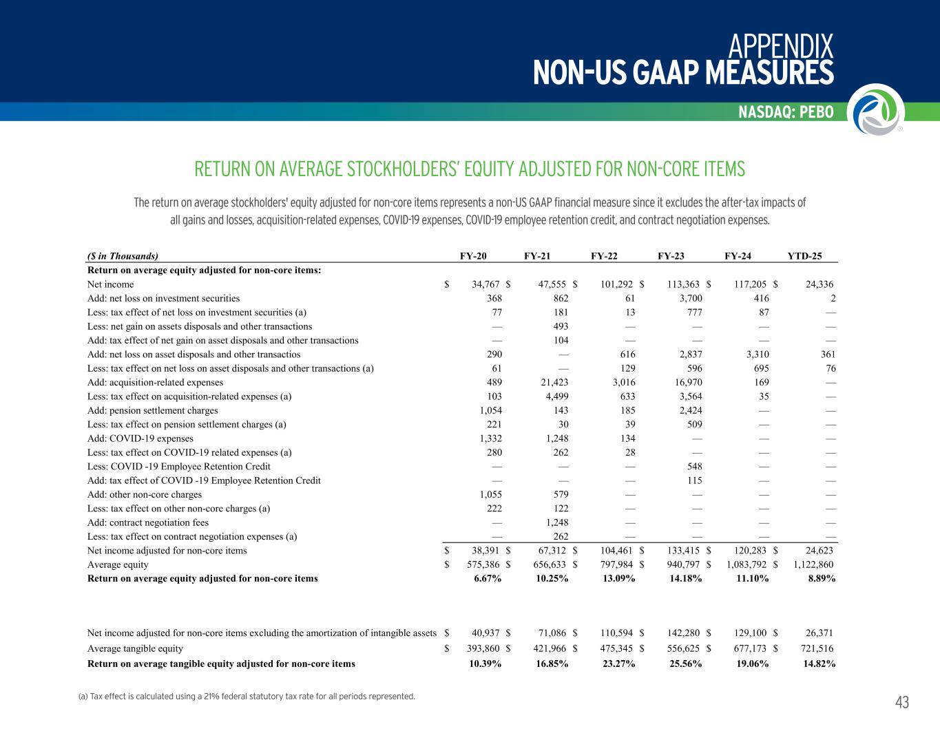 NASDAQ: PEBO APPENDIX NON-US GAAP MEASURES 42 (a) Tax effect is calculated using a 21% federal statutory tax rate for all periods represented. RETURN ON AVERAGE TANGIBLE STOCKHOLDERS’ EQUITY The return on average tangible stockholders’ equity ratio is a key financial measure used to monitor performance. It is calculated as net income (less after-tax impact of amortization of other intangible assets) divided by average tangible stockholders’ equity. This measure is non-US GAAP since that excludes the after-tax impact of amortization of other intangible assets from earnings and the impact of goodwill and other intangible assets acquired through acquisitions on total stockholders’ equity. ($ in Thousands) FY-20 FY-21 FY-22 FY-23 FY-24 YTD-25 Annualized net income $ 34,767 $ 47,555 $ 101,292 $ 113,363 $ 117,205 $ 98,696 Add: amortization of other intangible assets 3,223 4,775 7,763 11,222 11,161 2,213 Less: tax effect of amortization of other intangible assets (a) 677 1,003 1,630 2,357 2,344 465 Net income excluding the amortization of intangible assets $ 34,770 $ 51,327 $ 107,425 $ 122,228 $ 126,022 $ 100,444 Total average equity $ 575,386 $ 656,633 $ 797,984 $ 940,797 $ 1,083,792 $ 1,122,860 Less: average goodwill and other intangible assets 181,526 234,667 322,639 384,172 406,619 401,344 Average tangible equity $ 393,860 $ 421,966 $ 475,345 $ 556,625 $ 677,173 $ 721,516 Annualized net income $ 34,767 $ 47,555 $ 101,292 $ 113,363 $ 117,205 $ 98,696 Total average equity $ 575,386 $ 656,633 $ 797,984 $ 940,797 $ 1,083,792 $ 1,122,860 Return on average equity 6.04% 7.24% 12.69% 12.05% 10.81% 8.79% Annualized net income excluding the amortization of intangible assets $ 37,313 $ 51,327 $ 107,425 $ 122,228 $ 126,022 $ 105,785 Average tangible equity $ 393,860 $ 421,966 $ 475,345 $ 556,625 $ 677,173 $ 721,516 Return on average tangible equity 9.47% 12.16% 22.60% 21.96% 18.61% 14.66%