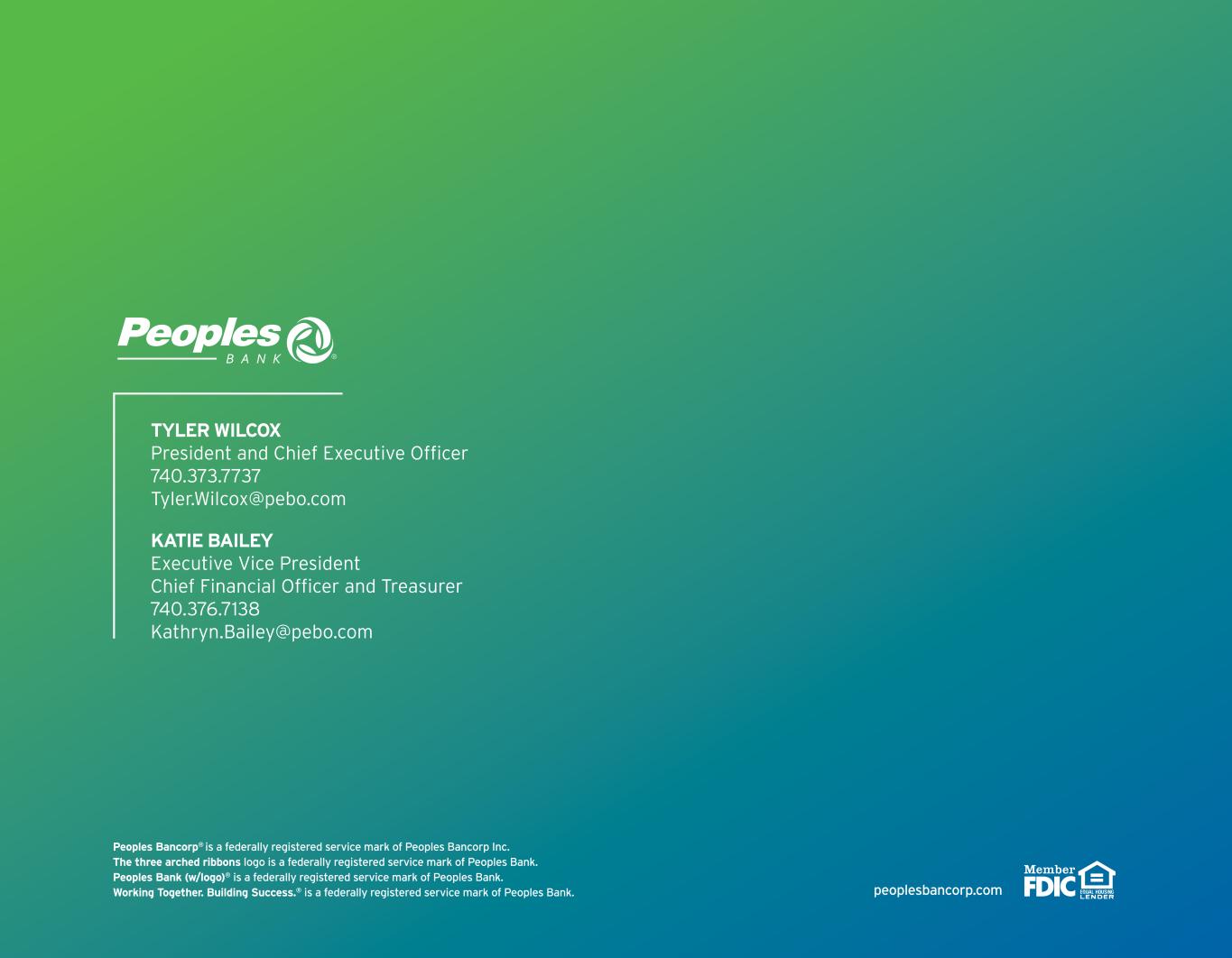 peoplesbancorp.com Peoples Bancorp® is a federally registered service mark of Peoples Bancorp Inc. The three arched ribbons logo is a federally registered service mark of Peoples Bank. Peoples Bank (w/logo)® is a federally registered service mark of Peoples Bank. Working Together. Building Success.® is a federally registered service mark of Peoples Bank. TYLER WILCOX President and Chief Executive Officer 740.373.7737 Tyler.Wilcox@pebo.com KATIE BAILEY Executive Vice President Chief Financial Officer and Treasurer 740.376.7138 Kathryn.Bailey@pebo.com