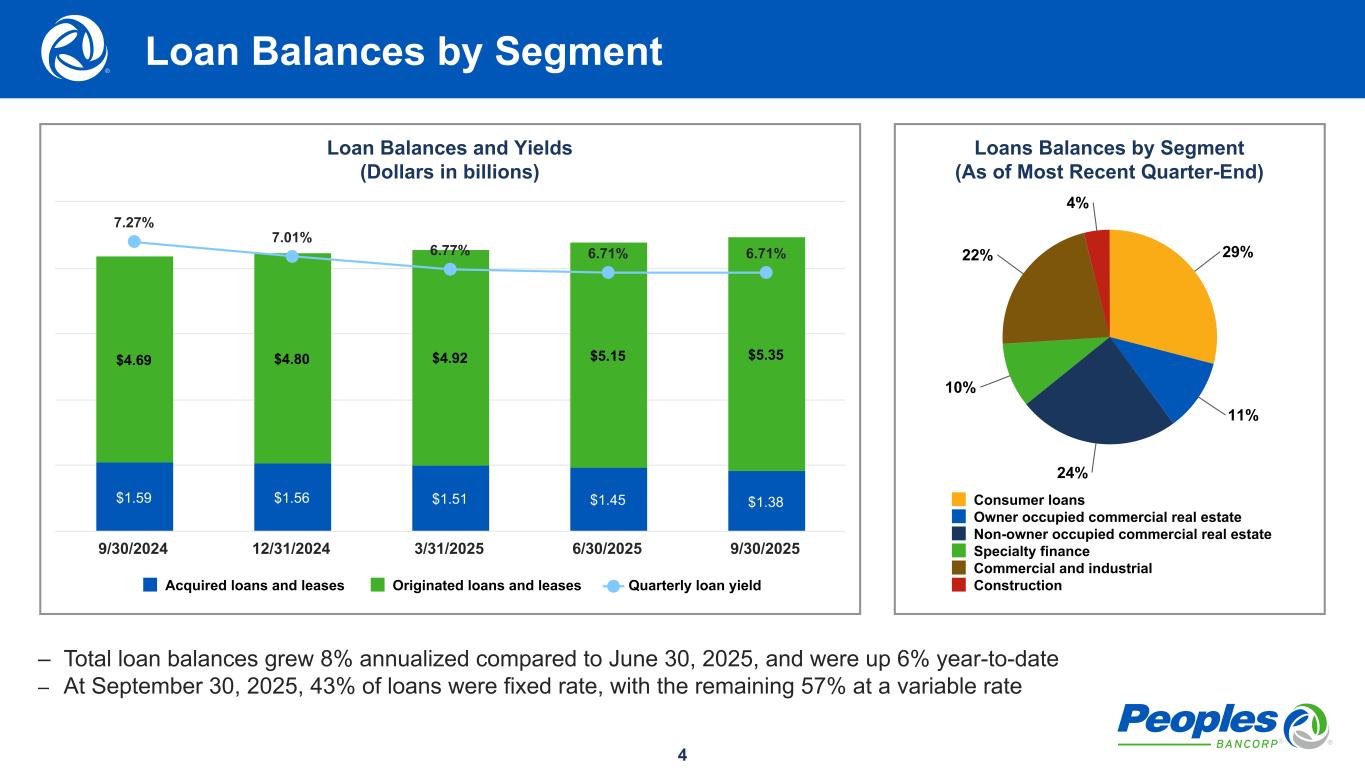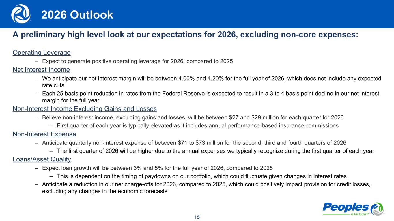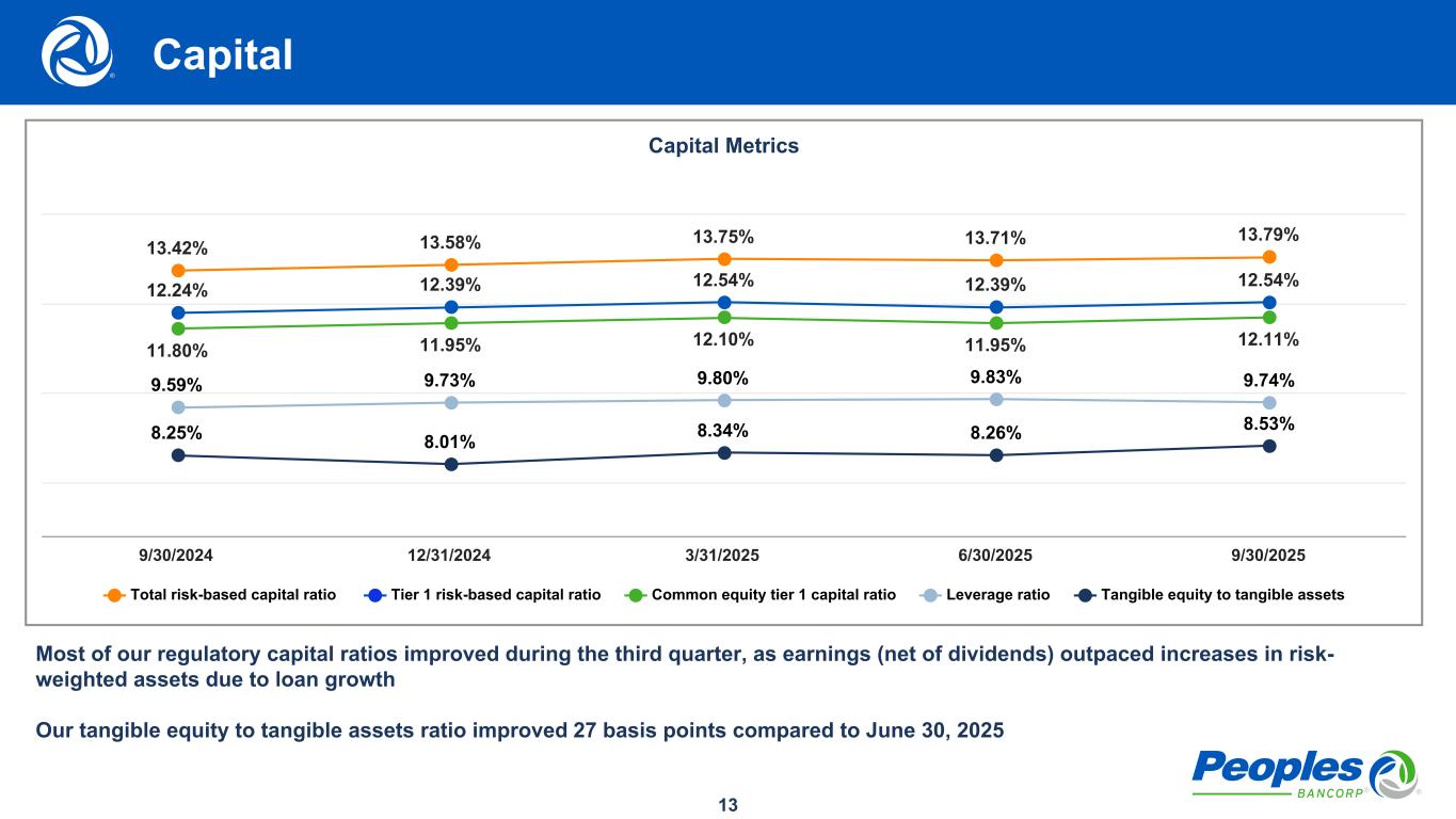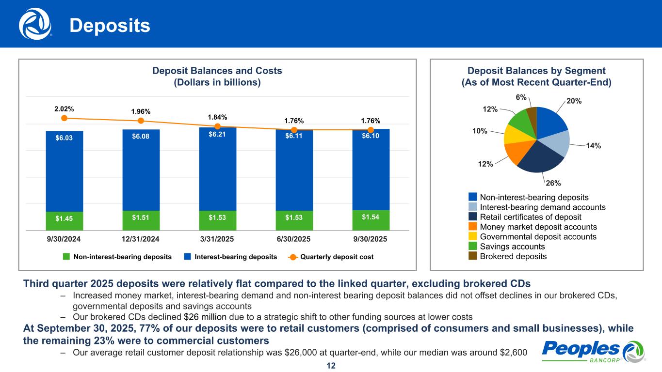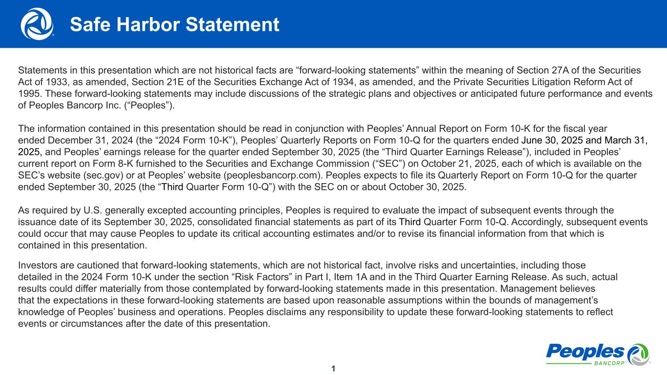 ピープルズは本日午前11時(米国東部夏時間)より、ピープルズの経営陣が参加するカンファレンス・コールを開催し、2025年第3四半期の業績について説明します。アナリスト、メディア、個人投資家の皆様は、(866) 890-9285までお電話ください。カンファレンス・コールの音声と決算説明の同時ウェブキャストは、ピープルズのウェブサイト(www.peoplesbancorp.com)の「投資家向け情報」セクションからオンラインで視聴できます。電話会議への参加を確実にし、必要な場合は必要なソフトウェアのダウンロードとインストールを行うため、参加者は電話会議予定時刻の15分前までに電話またはサインインすることが推奨される。電話会議のリプレイは、ピープルズのウェブサイトの「投資家向け情報」セクションで1年間視聴可能です。