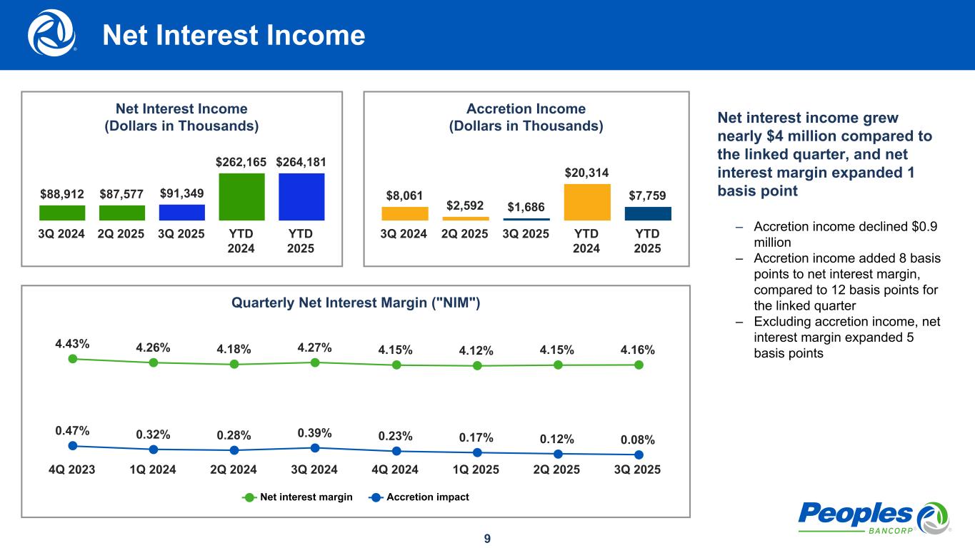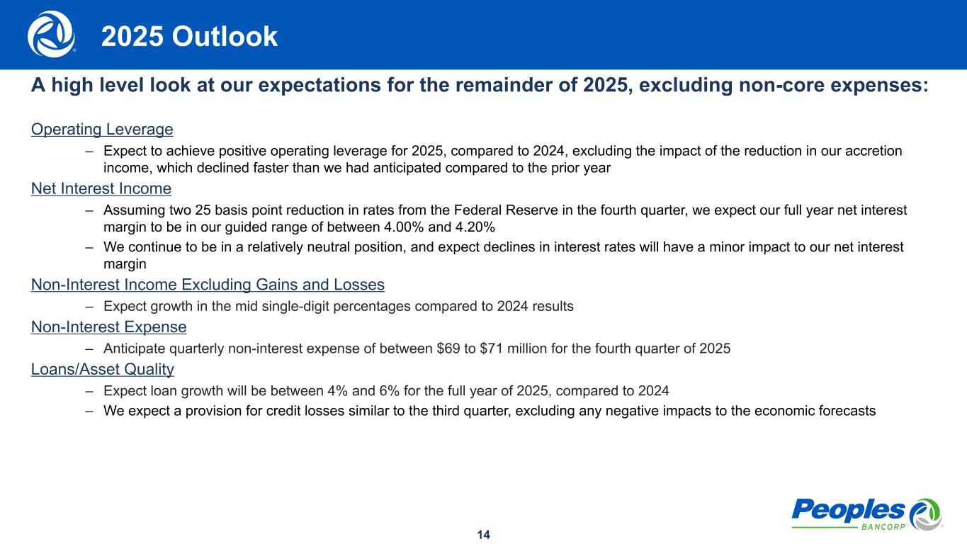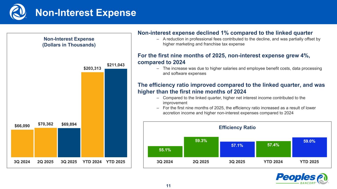 企業買収に伴う、償却費用控除後の増 加収益は、2025 年第 3 四半期は 170 万ドル、連動四半期は 260 万ドル、2024 年第 3 四半期は 810 万ドルで、それぞれ純利鞘に 8bp、12bp、39bp のプラスとなりました。2025 年第 3 四半期の増収は、連動四半期および 2024 年第 3 四半期と比べ減少しましたが、これはローンの返済が少なかったこと、およびライムストーン・バンコープ・インクとの合併(以下「ライムストーン合併」)により 2024 年に認識された増収が多かったことによるものです。