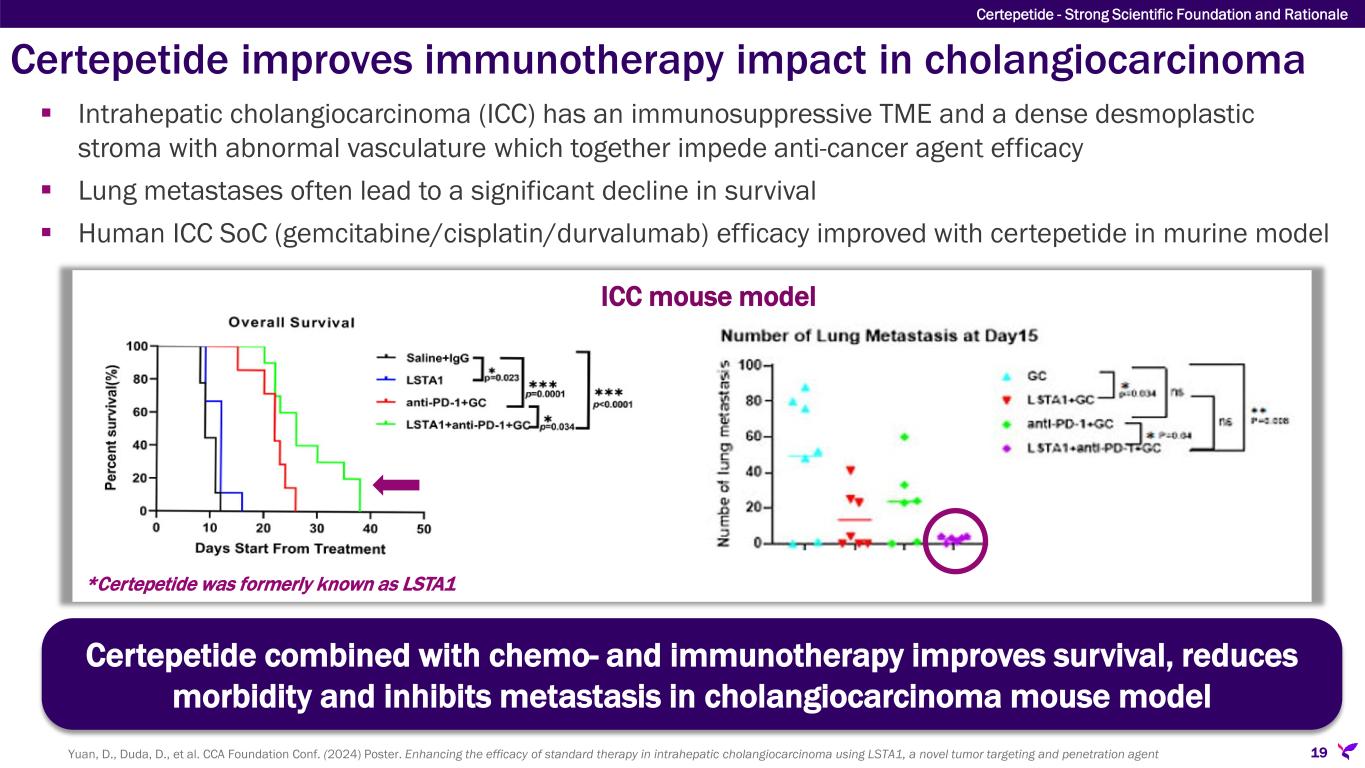 -iLSTA:非営利財団WARPNINE Inc.の資金提供により、局所進行切除不能PDAC患者を対象に、SoC化学療法(ナブパクリタキセル、ゲムシタビン)+SoC免疫療法(デュルバルマブ)併用群とSoC単独群との比較でセルテペチドを評価する、オーストラリアにおける第1b/2a相ランダム化単盲検安全性・薬力学的試験。試験の登録は完了し、2025年7月3日のESMO-GI学会で中間解析の結果が発表され、certepetideについて説得力のある新たな裏付けデータが示された。2025年ASCO-GI会議で発表された以前の知見と一致して、このデータは、RECISTの有意な奏効を誘発し、全奏効率と病勢コントロール率を改善することにより、セルテペチドが免疫療法の有効性を高める可能性を示している。本試験の最終データは2026年第1四半期に発表される予定である。