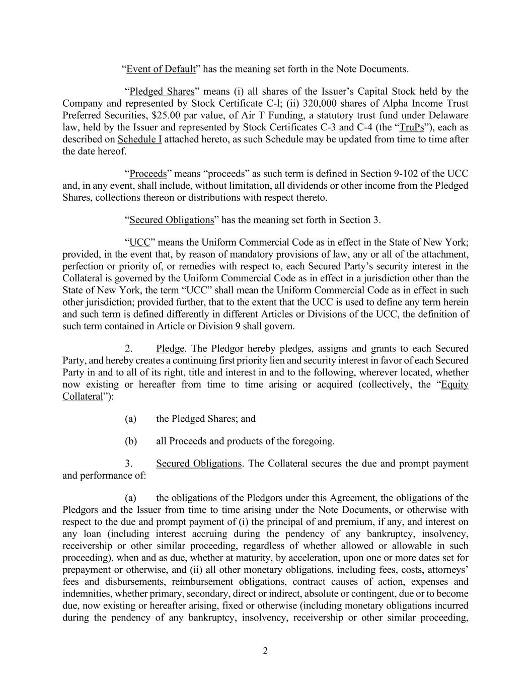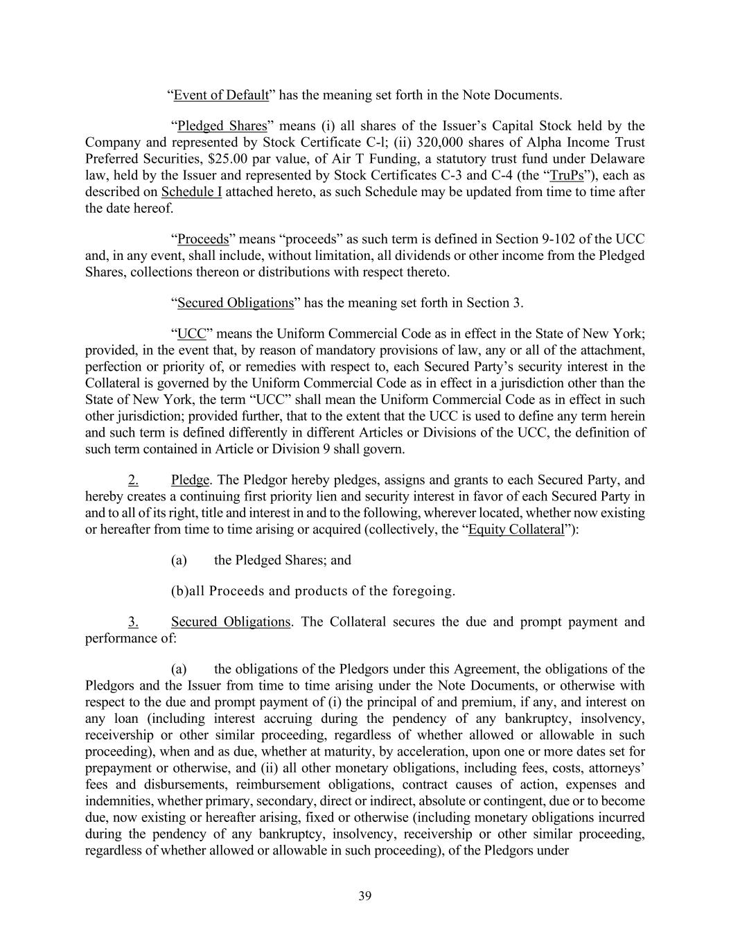 39 “Event of Default” has the meaning set forth in the Note Documents. “Pledged Shares” means (i) all shares of the Issuer’s Capital Stock held by the Company and represented by Stock Certificate C-l; (ii) 320,000 shares of Alpha Income Trust Preferred Securities, $25.00 par value, of Air T Funding, a statutory trust fund under Delaware law, held by the Issuer and represented by Stock Certificates C-3 and C-4 (the “TruPs”), each as described on Schedule I attached hereto, as such Schedule may be updated from time to time after the date hereof. “Proceeds” means “proceeds” as such term is defined in Section 9-102 of the UCC and, in any event, shall include, without limitation, all dividends or other income from the Pledged Shares, collections thereon or distributions with respect thereto. “Secured Obligations” has the meaning set forth in Section 3. “UCC” means the Uniform Commercial Code as in effect in the State of New York; provided, in the event that, by reason of mandatory provisions of law, any or all of the attachment, perfection or priority of, or remedies with respect to, each Secured Party’s security interest in the Collateral is governed by the Uniform Commercial Code as in effect in a jurisdiction other than the State of New York, the term “UCC” shall mean the Uniform Commercial Code as in effect in such other jurisdiction; provided further, that to the extent that the UCC is used to define any term herein and such term is defined differently in different Articles or Divisions of the UCC, the definition of such term contained in Article or Division 9 shall govern. 2. Pledge. The Pledgor hereby pledges, assigns and grants to each Secured Party, and hereby creates a continuing first priority lien and security interest in favor of each Secured Party in and to all of its right, title and interest in and to the following, wherever located, whether now existing or hereafter from time to time arising or acquired (collectively, the “Equity Collateral”): (a) the Pledged Shares; and (b)all Proceeds and products of the foregoing. 3. Secured Obligations. The Collateral secures the due and prompt payment and performance of: (a) the obligations of the Pledgors under this Agreement, the obligations of the Pledgors and the Issuer from time to time arising under the Note Documents, or otherwise with respect to the due and prompt payment of (i) the principal of and premium, if any, and interest on any loan (including interest accruing during the pendency of any bankruptcy, insolvency, receivership or other similar proceeding, regardless of whether allowed or allowable in such proceeding), when and as due, whether at maturity, by acceleration, upon one or more dates set for prepayment or otherwise, and (ii) all other monetary obligations, including fees, costs, attorneys’ fees and disbursements, reimbursement obligations, contract causes of action, expenses and indemnities, whether primary, secondary, direct or indirect, absolute or contingent, due or to become due, now existing or hereafter arising, fixed or otherwise (including monetary obligations incurred during the pendency of any bankruptcy, insolvency, receivership or other similar proceeding, regardless of whether allowed or allowable in such proceeding), of the Pledgors under