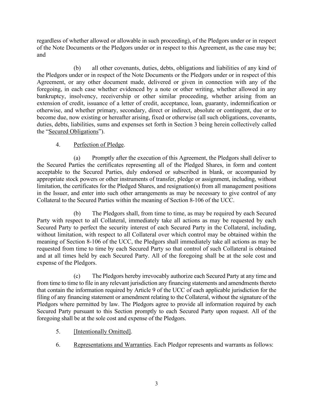 41 or in respect of the Note Documents or the Pledgors under or in respect to this Agreement, as the case may be; and (b)all other covenants, duties, debts, obligations and liabilities of any kind of the Pledgors under or in respect of the Note Documents or the Pledgors under or in respect of this Agreement, or any other document made, delivered or given in connection with any of the foregoing, in each case whether evidenced by a note or other writing, whether allowed in any bankruptcy, insolvency, receivership or other similar proceeding, whether arising from an extension of credit, issuance of a letter of credit, acceptance, loan, guaranty, indemnification or otherwise, and whether primary, secondary, direct or indirect, absolute or contingent, due or to become due, now existing or hereafter arising, fixed or otherwise (all such obligations, covenants, duties, debts, liabilities, sums and expenses set forth in Section 3 being herein collectively called the “Secured Obligations”). 4. Perfection of Pledge. (a) Promptly after the execution of this Agreement, the Pledgors shall deliver to the Secured Parties the certificates representing all of the Pledged Shares, in form and content acceptable to the Secured Parties, duly endorsed or subscribed in blank, or accompanied by appropriate stock powers or other instruments of transfer, pledge or assignment, including, without limitation, the certificates for the Pledged Shares, and resignation(s) from all management positions in the Issuer, and enter into such other arrangements as may be necessary to give control of any Collateral to the Secured Parties within the meaning of Section 8-106 of the UCC. (b) The Pledgors shall, from time to time, as may be required by each Secured Party with respect to all Collateral, immediately take all actions as may be requested by each Secured Party to perfect the security interest of each Secured Party in the Collateral, including, without limitation, with respect to all Collateral over which control may be obtained within the meaning of Section 8-106 of the UCC, the Pledgors shall immediately take all actions as may be requested from time to time by each Secured Party so that control of such Collateral is obtained and at all times held by each Secured Party. All of the foregoing shall be at the sole cost and expense of the Pledgors. (c) The Pledgors hereby irrevocably authorize each Secured Party at any time and from time to time to file in any relevant jurisdiction any financing statements and amendments thereto that contain the information required by Article 9 of the UCC of each applicable jurisdiction for the filing of any financing statement or amendment relating to the Collateral, without the signature of the Pledgors where permitted by law. The Pledgors agree to provide all information required by each Secured Party pursuant to this Section promptly to each Secured Party upon request. All of the foregoing shall be at the sole cost and expense of the Pledgors. 5. [Intentionally Omitted]. 6. Representations and Warranties. Each Pledgor represents and warrants as follows: (a) The Pledged Shares have been duly authorized and validly issued, and are fully paid and non-assessable and subject to no options to purchase or similar rights. All information set forth in Schedule I relating to the Pledged Shares is accurate and complete.