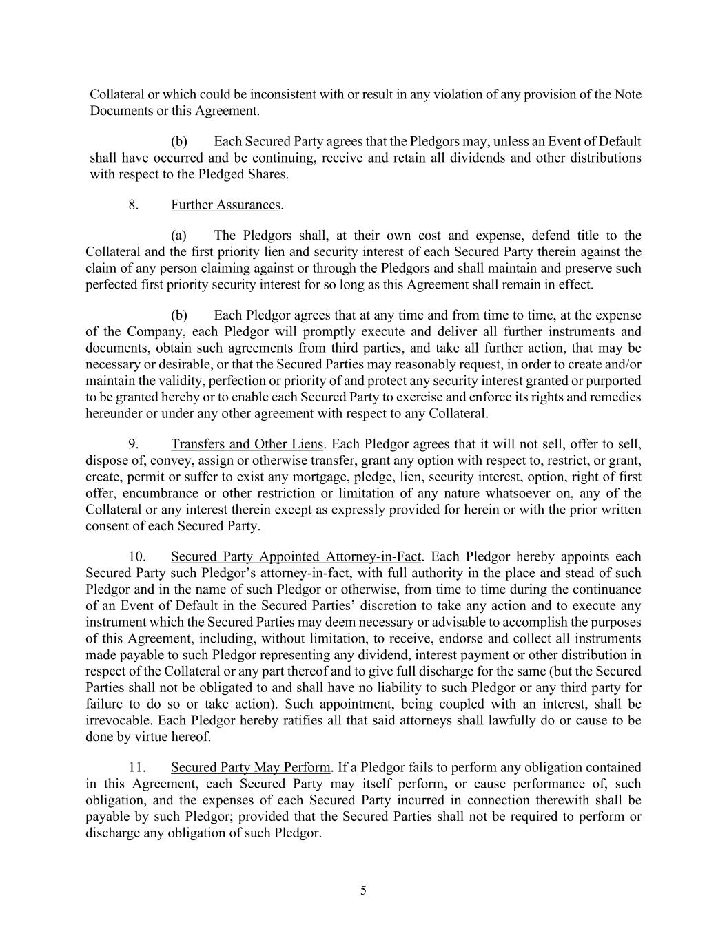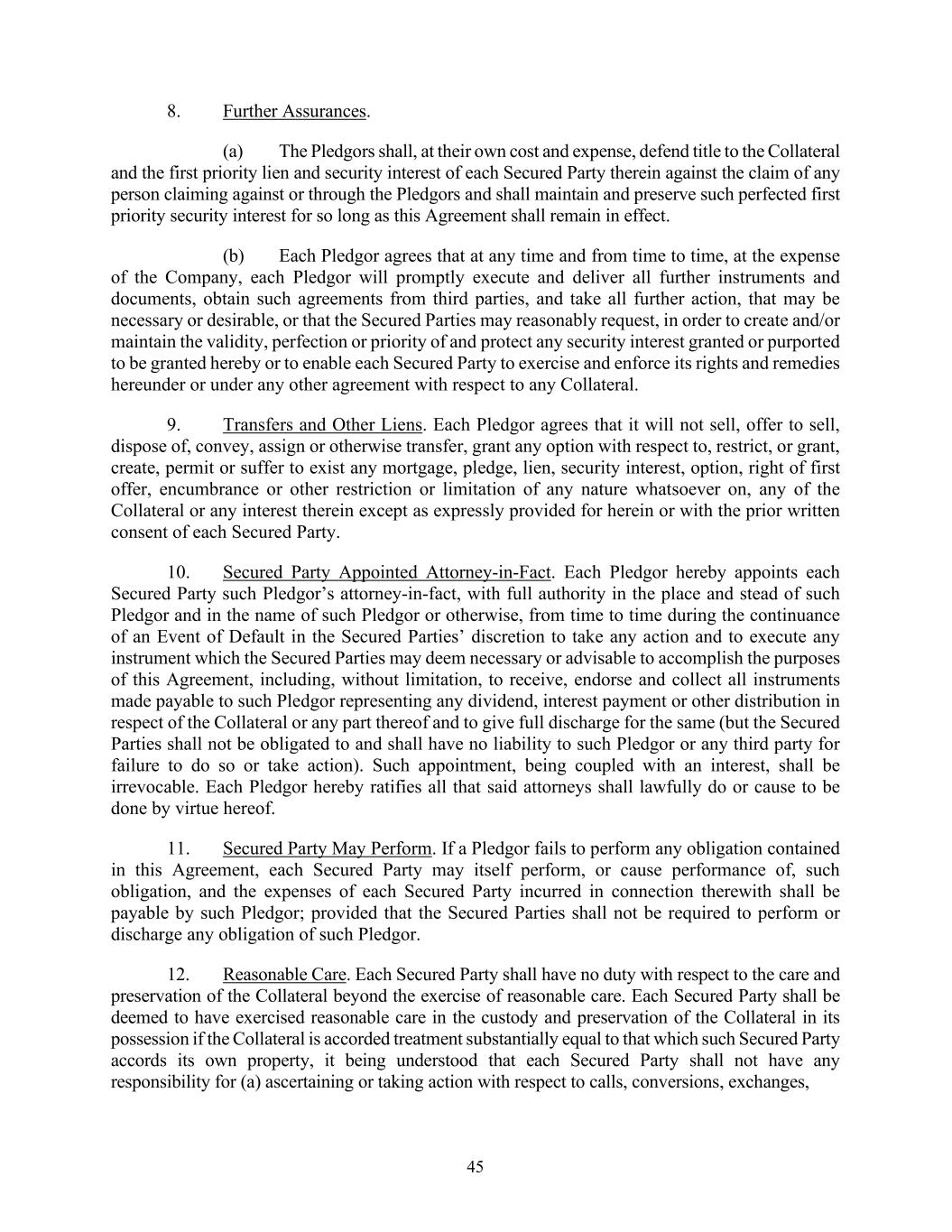 45 8. Further Assurances. (a) The Pledgors shall, at their own cost and expense, defend title to the Collateral and the first priority lien and security interest of each Secured Party therein against the claim of any person claiming against or through the Pledgors and shall maintain and preserve such perfected first priority security interest for so long as this Agreement shall remain in effect. (b) Each Pledgor agrees that at any time and from time to time, at the expense of the Company, each Pledgor will promptly execute and deliver all further instruments and documents, obtain such agreements from third parties, and take all further action, that may be necessary or desirable, or that the Secured Parties may reasonably request, in order to create and/or maintain the validity, perfection or priority of and protect any security interest granted or purported to be granted hereby or to enable each Secured Party to exercise and enforce its rights and remedies hereunder or under any other agreement with respect to any Collateral. 9. Transfers and Other Liens. Each Pledgor agrees that it will not sell, offer to sell, dispose of, convey, assign or otherwise transfer, grant any option with respect to, restrict, or grant, create, permit or suffer to exist any mortgage, pledge, lien, security interest, option, right of first offer, encumbrance or other restriction or limitation of any nature whatsoever on, any of the Collateral or any interest therein except as expressly provided for herein or with the prior written consent of each Secured Party. 10. Secured Party Appointed Attorney-in-Fact. Each Pledgor hereby appoints each Secured Party such Pledgor’s attorney-in-fact, with full authority in the place and stead of such Pledgor and in the name of such Pledgor or otherwise, from time to time during the continuance of an Event of Default in the Secured Parties’ discretion to take any action and to execute any instrument which the Secured Parties may deem necessary or advisable to accomplish the purposes of this Agreement, including, without limitation, to receive, endorse and collect all instruments made payable to such Pledgor representing any dividend, interest payment or other distribution in respect of the Collateral or any part thereof and to give full discharge for the same (but the Secured Parties shall not be obligated to and shall have no liability to such Pledgor or any third party for failure to do so or take action). Such appointment, being coupled with an interest, shall be irrevocable. Each Pledgor hereby ratifies all that said attorneys shall lawfully do or cause to be done by virtue hereof. 11. Secured Party May Perform. If a Pledgor fails to perform any obligation contained in this Agreement, each Secured Party may itself perform, or cause performance of, such obligation, and the expenses of each Secured Party incurred in connection therewith shall be payable by such Pledgor; provided that the Secured Parties shall not be required to perform or discharge any obligation of such Pledgor. 12. Reasonable Care. Each Secured Party shall have no duty with respect to the care and preservation of the Collateral beyond the exercise of reasonable care. Each Secured Party shall be deemed to have exercised reasonable care in the custody and preservation of the Collateral in its possession if the Collateral is accorded treatment substantially equal to that which such Secured Party accords its own property, it being understood that each Secured Party shall not have any responsibility for (a) ascertaining or taking action with respect to calls, conversions, exchanges,