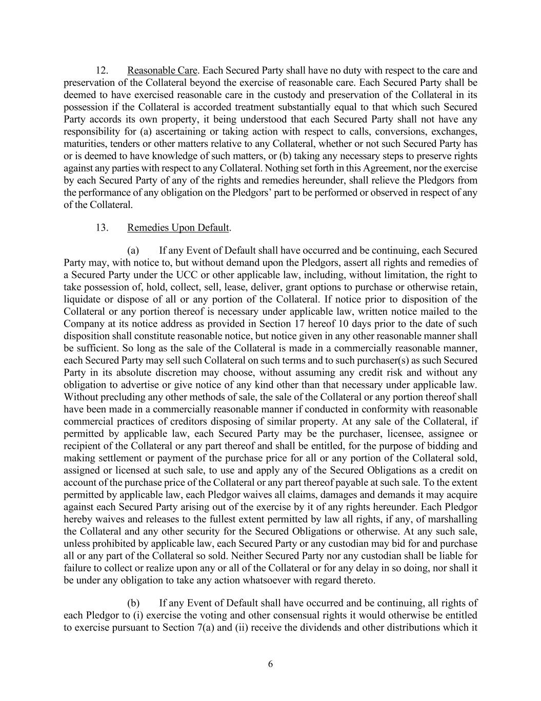 47 maturities, tenders or other matters relative to any Collateral, whether or not such Secured Party has or is deemed to have knowledge of such matters, or (b) taking any necessary steps to preserve rights against any parties with respect to any Collateral. Nothing set forth in this Agreement, nor the exercise by each Secured Party of any of the rights and remedies hereunder, shall relieve the Pledgors from the performance of any obligation on the Pledgors’ part to be performed or observed in respect of any of the Collateral. 13. Remedies Upon Default. (a) If any Event of Default shall have occurred and be continuing, each Secured Party may, with notice to, but without demand upon the Pledgors, assert all rights and remedies of a Secured Party under the UCC or other applicable law, including, without limitation, the right to take possession of, hold, collect, sell, lease, deliver, grant options to purchase or otherwise retain, liquidate or dispose of all or any portion of the Collateral. If notice prior to disposition of the Collateral or any portion thereof is necessary under applicable law, written notice mailed to the Company at its notice address as provided in Section 17 hereof 10 days prior to the date of such disposition shall constitute reasonable notice, but notice given in any other reasonable manner shall be sufficient. So long as the sale of the Collateral is made in a commercially reasonable manner, each Secured Party may sell such Collateral on such terms and to such purchaser(s) as such Secured Party in its absolute discretion may choose, without assuming any credit risk and without any obligation to advertise or give notice of any kind other than that necessary under applicable law. Without precluding any other methods of sale, the sale of the Collateral or any portion thereof shall have been made in a commercially reasonable manner if conducted in conformity with reasonable commercial practices of creditors disposing of similar property. At any sale of the Collateral, if permitted by applicable law, each Secured Party may be the purchaser, licensee, assignee or recipient of the Collateral or any part thereof and shall be entitled, for the purpose of bidding and making settlement or payment of the purchase price for all or any portion of the Collateral sold, assigned or licensed at such sale, to use and apply any of the Secured Obligations as a credit on account of the purchase price of the Collateral or any part thereof payable at such sale. To the extent permitted by applicable law, each Pledgor waives all claims, damages and demands it may acquire against each Secured Party arising out of the exercise by it of any rights hereunder. Each Pledgor hereby waives and releases to the fullest extent permitted by law all rights, if any, of marshalling the Collateral and any other security for the Secured Obligations or otherwise. At any such sale, unless prohibited by applicable law, each Secured Party or any custodian may bid for and purchase all or any part of the Collateral so sold. Neither Secured Party nor any custodian shall be liable for failure to collect or realize upon any or all of the Collateral or for any delay in so doing, nor shall it be under any obligation to take any action whatsoever with regard thereto. (b) If any Event of Default shall have occurred and be continuing, all rights of each Pledgor to (i) exercise the voting and other consensual rights it would otherwise be entitled to exercise pursuant to Section 7(a) and (ii) receive the dividends and other distributions which it would otherwise be entitled to receive and retain pursuant to Section 7(b), shall immediately cease, and all such rights shall thereupon become vested in each Secured Party, which shall have the sole right to exercise such voting and other consensual rights and receive and hold such dividends and other distributions as Collateral. B-6