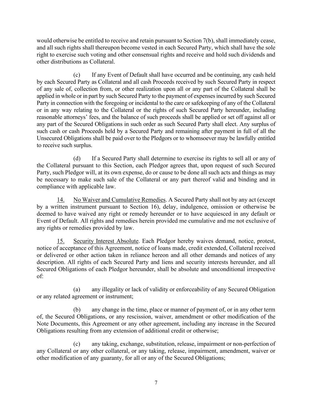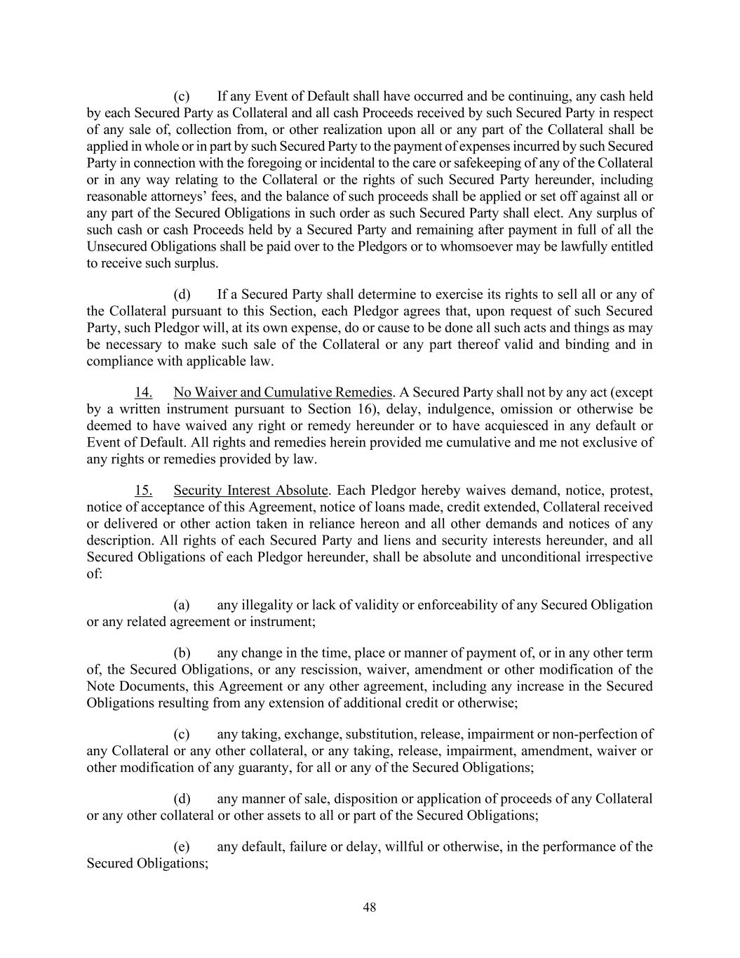 48 (c) If any Event of Default shall have occurred and be continuing, any cash held by each Secured Party as Collateral and all cash Proceeds received by such Secured Party in respect of any sale of, collection from, or other realization upon all or any part of the Collateral shall be applied in whole or in part by such Secured Party to the payment of expenses incurred by such Secured Party in connection with the foregoing or incidental to the care or safekeeping of any of the Collateral or in any way relating to the Collateral or the rights of such Secured Party hereunder, including reasonable attorneys’ fees, and the balance of such proceeds shall be applied or set off against all or any part of the Secured Obligations in such order as such Secured Party shall elect. Any surplus of such cash or cash Proceeds held by a Secured Party and remaining after payment in full of all the Unsecured Obligations shall be paid over to the Pledgors or to whomsoever may be lawfully entitled to receive such surplus. (d) If a Secured Party shall determine to exercise its rights to sell all or any of the Collateral pursuant to this Section, each Pledgor agrees that, upon request of such Secured Party, such Pledgor will, at its own expense, do or cause to be done all such acts and things as may be necessary to make such sale of the Collateral or any part thereof valid and binding and in compliance with applicable law. 14. No Waiver and Cumulative Remedies. A Secured Party shall not by any act (except by a written instrument pursuant to Section 16), delay, indulgence, omission or otherwise be deemed to have waived any right or remedy hereunder or to have acquiesced in any default or Event of Default. All rights and remedies herein provided me cumulative and me not exclusive of any rights or remedies provided by law. 15. Security Interest Absolute. Each Pledgor hereby waives demand, notice, protest, notice of acceptance of this Agreement, notice of loans made, credit extended, Collateral received or delivered or other action taken in reliance hereon and all other demands and notices of any description. All rights of each Secured Party and liens and security interests hereunder, and all Secured Obligations of each Pledgor hereunder, shall be absolute and unconditional irrespective of: (a) any illegality or lack of validity or enforceability of any Secured Obligation or any related agreement or instrument; (b) any change in the time, place or manner of payment of, or in any other term of, the Secured Obligations, or any rescission, waiver, amendment or other modification of the Note Documents, this Agreement or any other agreement, including any increase in the Secured Obligations resulting from any extension of additional credit or otherwise; (c) any taking, exchange, substitution, release, impairment or non-perfection of any Collateral or any other collateral, or any taking, release, impairment, amendment, waiver or other modification of any guaranty, for all or any of the Secured Obligations; (d) any manner of sale, disposition or application of proceeds of any Collateral or any other collateral or other assets to all or part of the Secured Obligations; (e) any default, failure or delay, willful or otherwise, in the performance of the Secured Obligations;