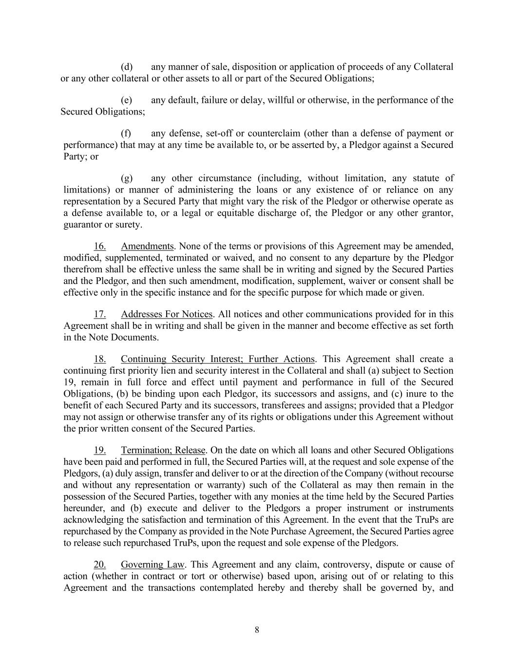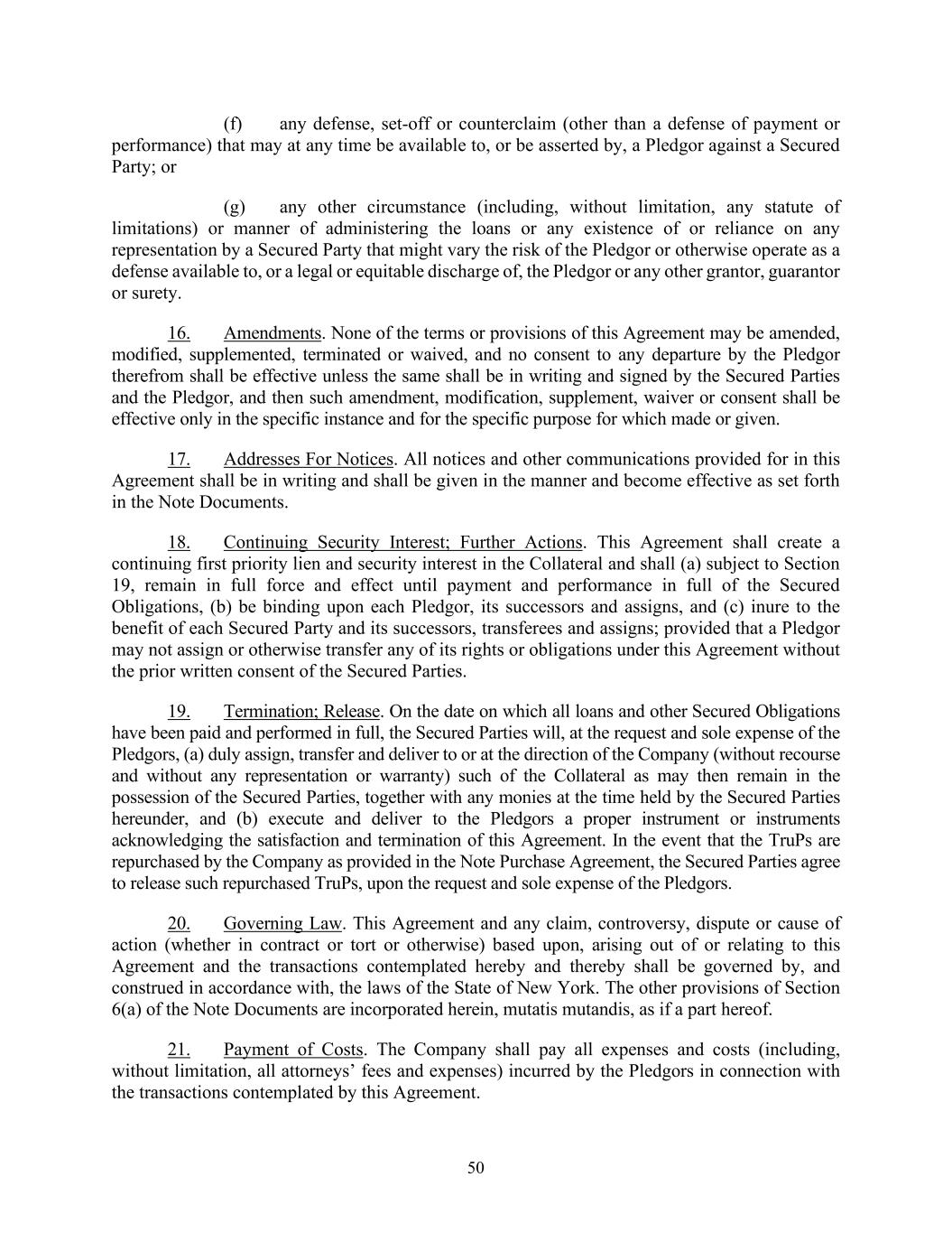 50 (f) any defense, set-off or counterclaim (other than a defense of payment or performance) that may at any time be available to, or be asserted by, a Pledgor against a Secured Party; or (g) any other circumstance (including, without limitation, any statute of limitations) or manner of administering the loans or any existence of or reliance on any representation by a Secured Party that might vary the risk of the Pledgor or otherwise operate as a defense available to, or a legal or equitable discharge of, the Pledgor or any other grantor, guarantor or surety. 16. Amendments. None of the terms or provisions of this Agreement may be amended, modified, supplemented, terminated or waived, and no consent to any departure by the Pledgor therefrom shall be effective unless the same shall be in writing and signed by the Secured Parties and the Pledgor, and then such amendment, modification, supplement, waiver or consent shall be effective only in the specific instance and for the specific purpose for which made or given. 17. Addresses For Notices. All notices and other communications provided for in this Agreement shall be in writing and shall be given in the manner and become effective as set forth in the Note Documents. 18. Continuing Security Interest; Further Actions. This Agreement shall create a continuing first priority lien and security interest in the Collateral and shall (a) subject to Section 19, remain in full force and effect until payment and performance in full of the Secured Obligations, (b) be binding upon each Pledgor, its successors and assigns, and (c) inure to the benefit of each Secured Party and its successors, transferees and assigns; provided that a Pledgor may not assign or otherwise transfer any of its rights or obligations under this Agreement without the prior written consent of the Secured Parties. 19. Termination; Release. On the date on which all loans and other Secured Obligations have been paid and performed in full, the Secured Parties will, at the request and sole expense of the Pledgors, (a) duly assign, transfer and deliver to or at the direction of the Company (without recourse and without any representation or warranty) such of the Collateral as may then remain in the possession of the Secured Parties, together with any monies at the time held by the Secured Parties hereunder, and (b) execute and deliver to the Pledgors a proper instrument or instruments acknowledging the satisfaction and termination of this Agreement. In the event that the TruPs are repurchased by the Company as provided in the Note Purchase Agreement, the Secured Parties agree to release such repurchased TruPs, upon the request and sole expense of the Pledgors. 20. Governing Law. This Agreement and any claim, controversy, dispute or cause of action (whether in contract or tort or otherwise) based upon, arising out of or relating to this Agreement and the transactions contemplated hereby and thereby shall be governed by, and construed in accordance with, the laws of the State of New York. The other provisions of Section 6(a) of the Note Documents are incorporated herein, mutatis mutandis, as if a part hereof. 21. Payment of Costs. The Company shall pay all expenses and costs (including, without limitation, all attorneys’ fees and expenses) incurred by the Pledgors in connection with the transactions contemplated by this Agreement.