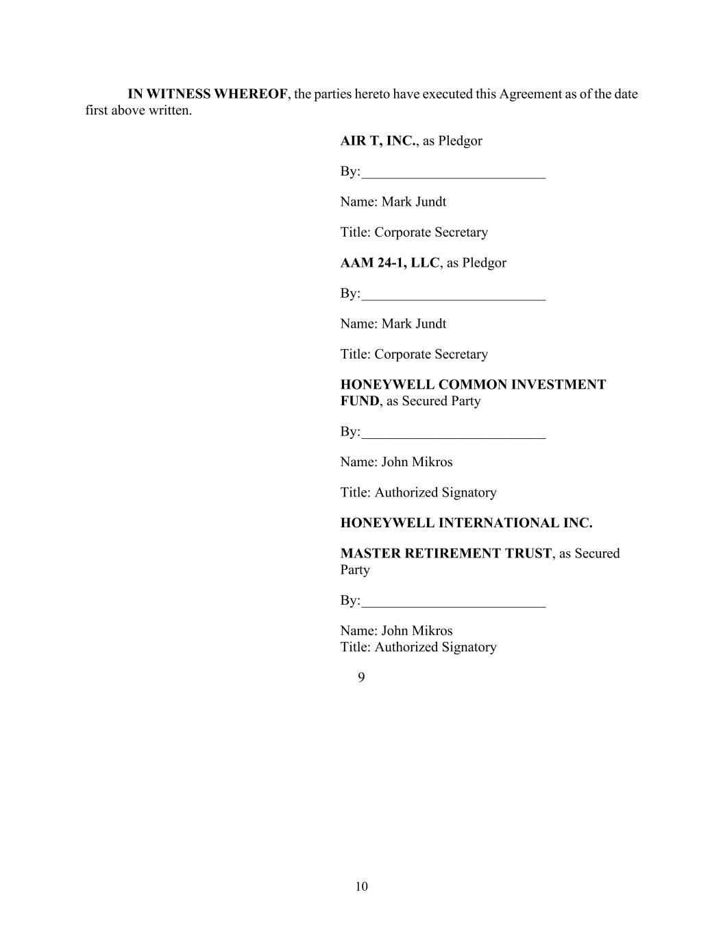 53 IN WITNESS WHEREOF, the parties hereto have executed this Agreement as of the date first above written. AIR T, INC., as Pledgor By: __________________________ Name: Mark Jundt Title: Corporate Secretary AAM 24-1, LLC, as Pledgor By: __________________________ Name: Mark Jundt Title: Corporate Secretary HONEYWELL COMMON INVESTMENT FUND, as Secured Party By: __________________________ Name: John Mikros Title: Authorized Signatory HONEYWELL INTERNATIONAL INC. MASTER RETIREMENT TRUST, as Secured Party By: __________________________ Name: John Mikros Title: Authorized Signatory B-10