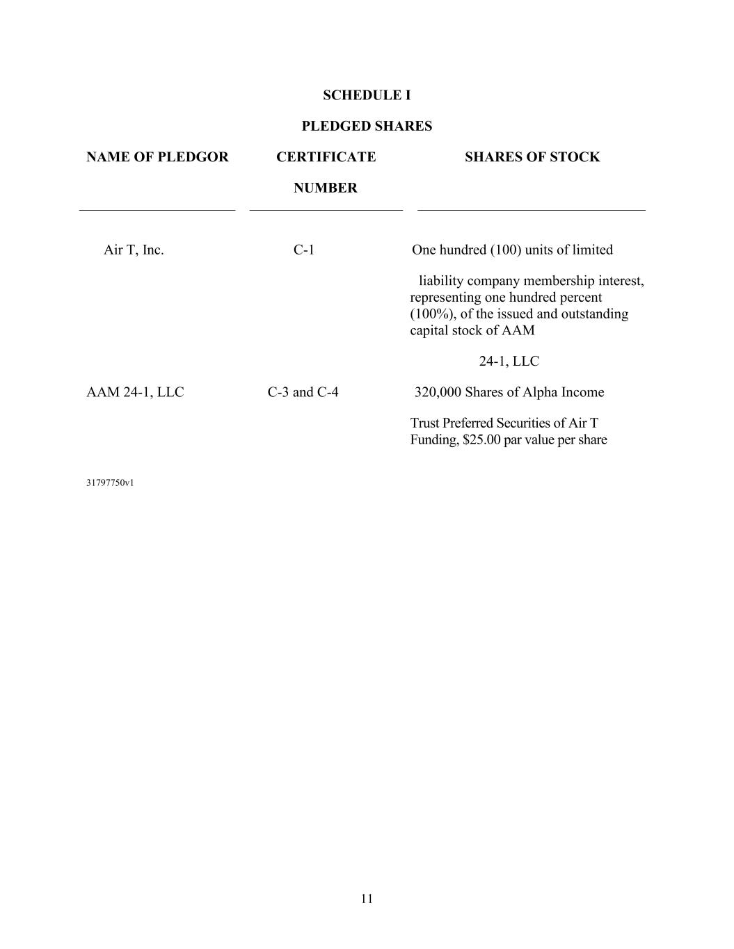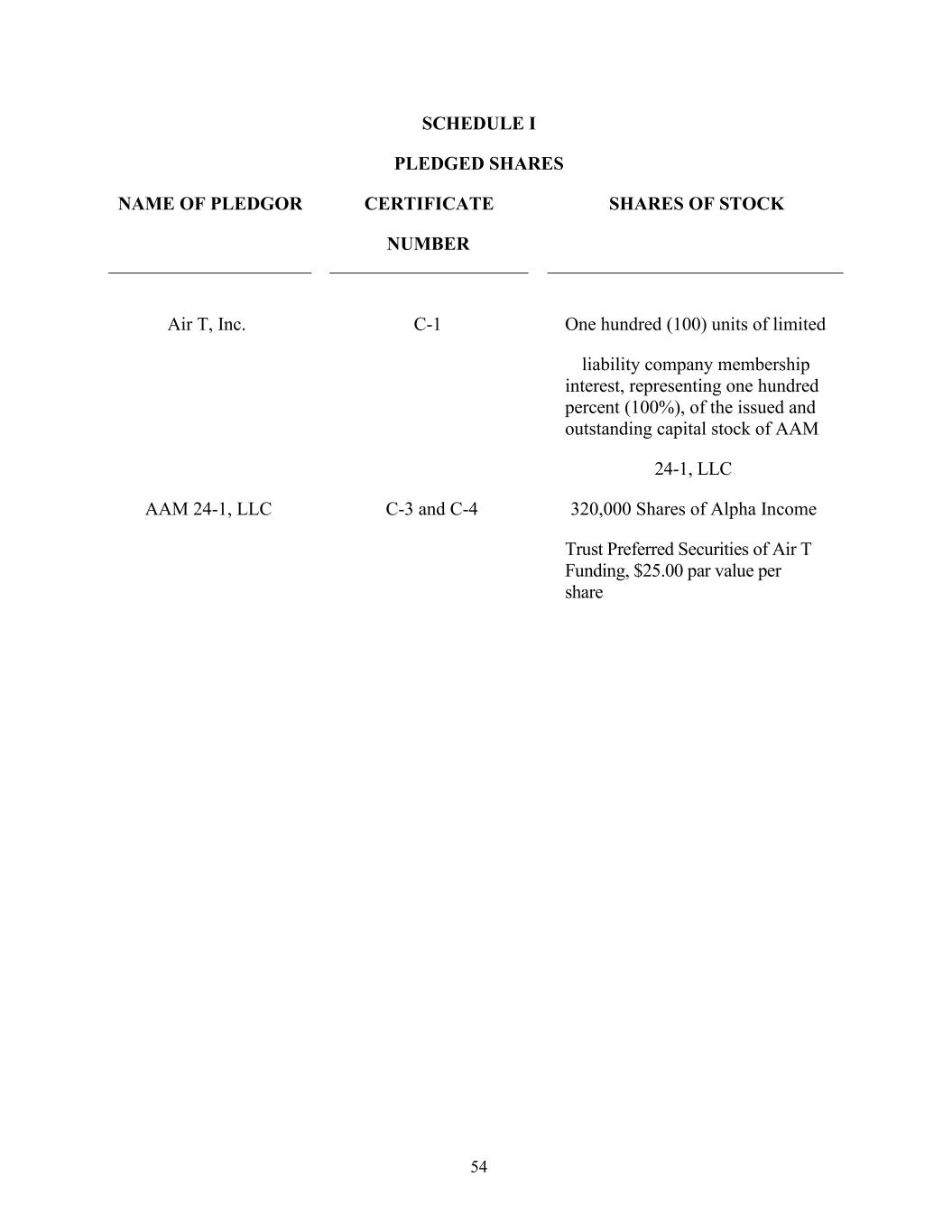 54 SCHEDULE I PLEDGED SHARES NAME OF PLEDGOR CERTIFICATE SHARES OF STOCK NUMBER Air T, Inc. C-1 One hundred (100) units of limited liability company membership interest, representing one hundred percent (100%), of the issued and outstanding capital stock of AAM 24-1, LLC AAM 24-1, LLC C-3 and C-4 320,000 Shares of Alpha Income Trust Preferred Securities of Air T Funding, $25.00 par value per share