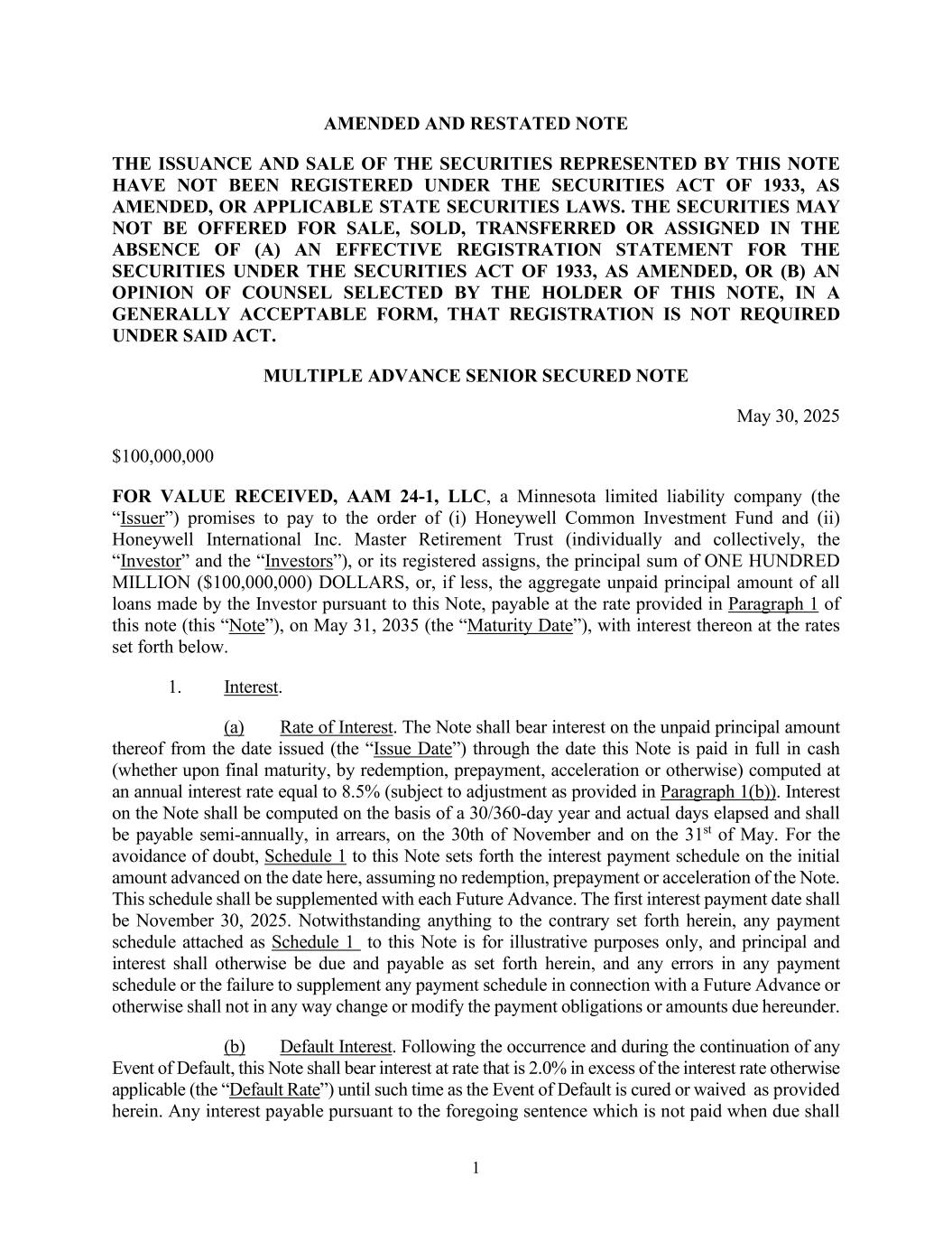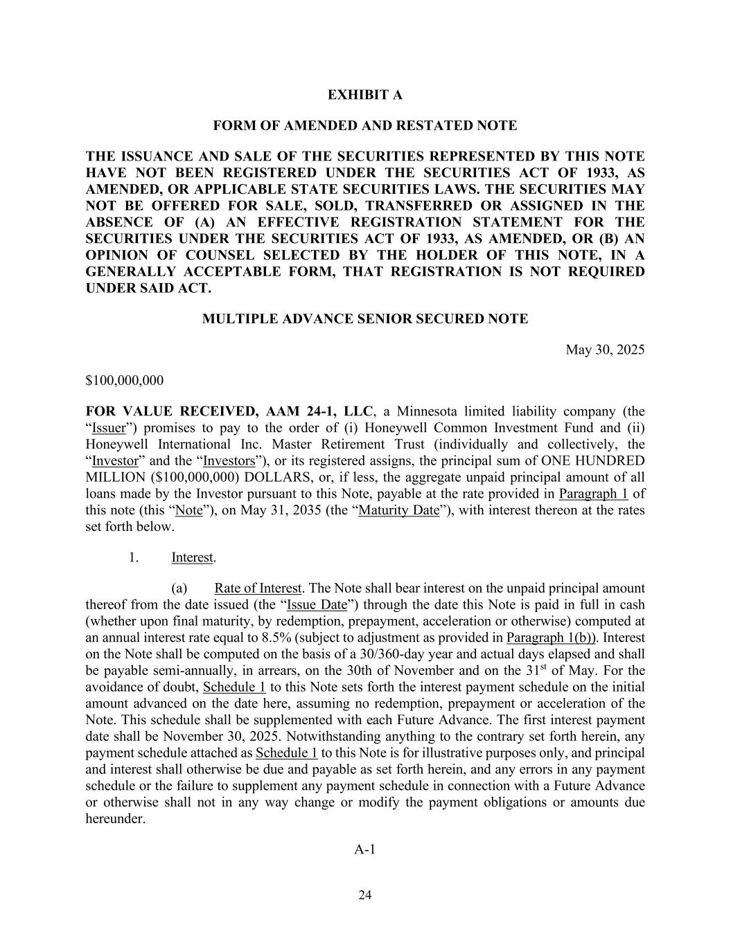24 EXHIBIT A FORM OF AMENDED AND RESTATED NOTE THE ISSUANCE AND SALE OF THE SECURITIES REPRESENTED BY THIS NOTE HAVE NOT BEEN REGISTERED UNDER THE SECURITIES ACT OF 1933, AS AMENDED, OR APPLICABLE STATE SECURITIES LAWS. THE SECURITIES MAY NOT BE OFFERED FOR SALE, SOLD, TRANSFERRED OR ASSIGNED IN THE ABSENCE OF (A) AN EFFECTIVE REGISTRATION STATEMENT FOR THE SECURITIES UNDER THE SECURITIES ACT OF 1933, AS AMENDED, OR (B) AN OPINION OF COUNSEL SELECTED BY THE HOLDER OF THIS NOTE, IN A GENERALLY ACCEPTABLE FORM, THAT REGISTRATION IS NOT REQUIRED UNDER SAID ACT. MULTIPLE ADVANCE SENIOR SECURED NOTE May 30, 2025 $100,000,000 FOR VALUE RECEIVED, AAM 24-1, LLC, a Minnesota limited liability company (the “Issuer”) promises to pay to the order of (i) Honeywell Common Investment Fund and (ii) Honeywell International Inc. Master Retirement Trust (individually and collectively, the “Investor” and the “Investors”), or its registered assigns, the principal sum of ONE HUNDRED MILLION ($100,000,000) DOLLARS, or, if less, the aggregate unpaid principal amount of all loans made by the Investor pursuant to this Note, payable at the rate provided in Paragraph 1 of this note (this “Note”), on May 31, 2035 (the “Maturity Date”), with interest thereon at the rates set forth below. 1. Interest. (a) Rate of Interest. The Note shall bear interest on the unpaid principal amount thereof from the date issued (the “Issue Date”) through the date this Note is paid in full in cash (whether upon final maturity, by redemption, prepayment, acceleration or otherwise) computed at an annual interest rate equal to 8.5% (subject to adjustment as provided in Paragraph 1(b)). Interest on the Note shall be computed on the basis of a 30/360-day year and actual days elapsed and shall be payable semi-annually, in arrears, on the 30th of November and on the 31st of May. For the avoidance of doubt, Schedule 1 to this Note sets forth the interest payment schedule on the initial amount advanced on the date here, assuming no redemption, prepayment or acceleration of the Note. This schedule shall be supplemented with each Future Advance. The first interest payment date shall be November 30, 2025. Notwithstanding anything to the contrary set forth herein, any payment schedule attached as Schedule 1 to this Note is for illustrative purposes only, and principal and interest shall otherwise be due and payable as set forth herein, and any errors in any payment schedule or the failure to supplement any payment schedule in connection with a Future Advance or otherwise shall not in any way change or modify the payment obligations or amounts due hereunder. A-1
