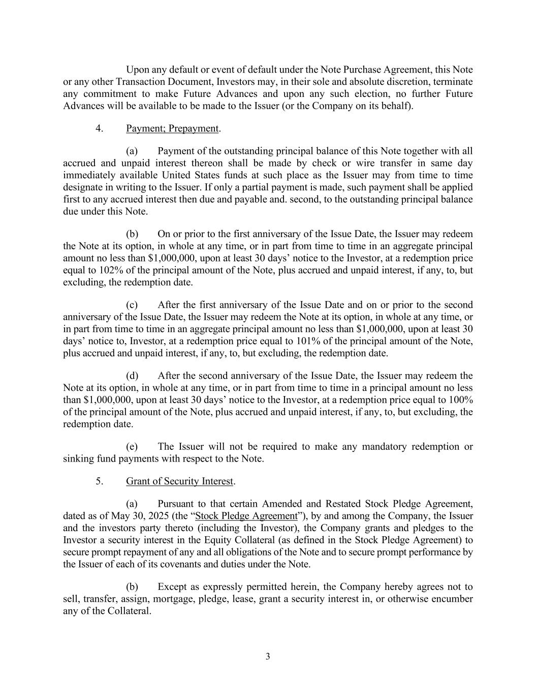 27 May 30, 2027 $10,000,000 The date and amount of any Future Advance may be further adjusted upon written mutual agreement of the Issuer, Company and Investors. Upon any default or event of default under the Note Purchase Agreement, this Note or any other Transaction Document, Investors may, in their sole and absolute discretion, terminate any commitment to make Future Advances and upon any such election, no further Future Advances will be available to be made to the Issuer (or the Company on its behalf). 4. Payment; Prepayment. (a) Payment of the outstanding principal balance of this Note together with all accrued and unpaid interest thereon shall be made by check or wire transfer in same day immediately available United States funds at such place as the Issuer may from time to time designate in writing to the Issuer. If only a partial payment is made, such payment shall be applied first to any accrued interest then due and payable and. second, to the outstanding principal balance due under this Note. (b) On or prior to the first anniversary of the Issue Date, the Issuer may redeem the Note at its option, in whole at any time, or in part from time to time in an aggregate principal amount no less than $1,000,000, upon at least 30 days’ notice to the Investor, at a redemption price equal to 102% of the principal amount of the Note, plus accrued and unpaid interest, if any, to, but excluding, the redemption date. (c) After the first anniversary of the Issue Date and on or prior to the second anniversary of the Issue Date, the Issuer may redeem the Note at its option, in whole at any time, or in part from time to time in an aggregate principal amount no less than $1,000,000, upon at least 30 days’ notice to, Investor, at a redemption price equal to 101% of the principal amount of the Note, plus accrued and unpaid interest, if any, to, but excluding, the redemption date. (d) After the second anniversary of the Issue Date, the Issuer may redeem the Note at its option, in whole at any time, or in part from time to time in a principal amount no less than $1,000,000, upon at least 30 days’ notice to the Investor, at a redemption price equal to 100% of the principal amount of the Note, plus accrued and unpaid interest, if any, to, but excluding, the redemption date. (e) The Issuer will not be required to make any mandatory redemption or sinking fund payments with respect to the Note. 5. Grant of Security Interest. (a) Pursuant to that certain Amended and Restated Stock Pledge Agreement, dated as of May 30, 2025 (the “Stock Pledge Agreement”), by and among the Company, the Issuer and the investors party thereto (including the Investor), the Company grants and pledges to the Investor a security interest in the Equity Collateral (as defined in the Stock Pledge Agreement) to secure prompt repayment of any and all obligations of the Note and to secure prompt performance by the Issuer of each of its covenants and duties under the Note.