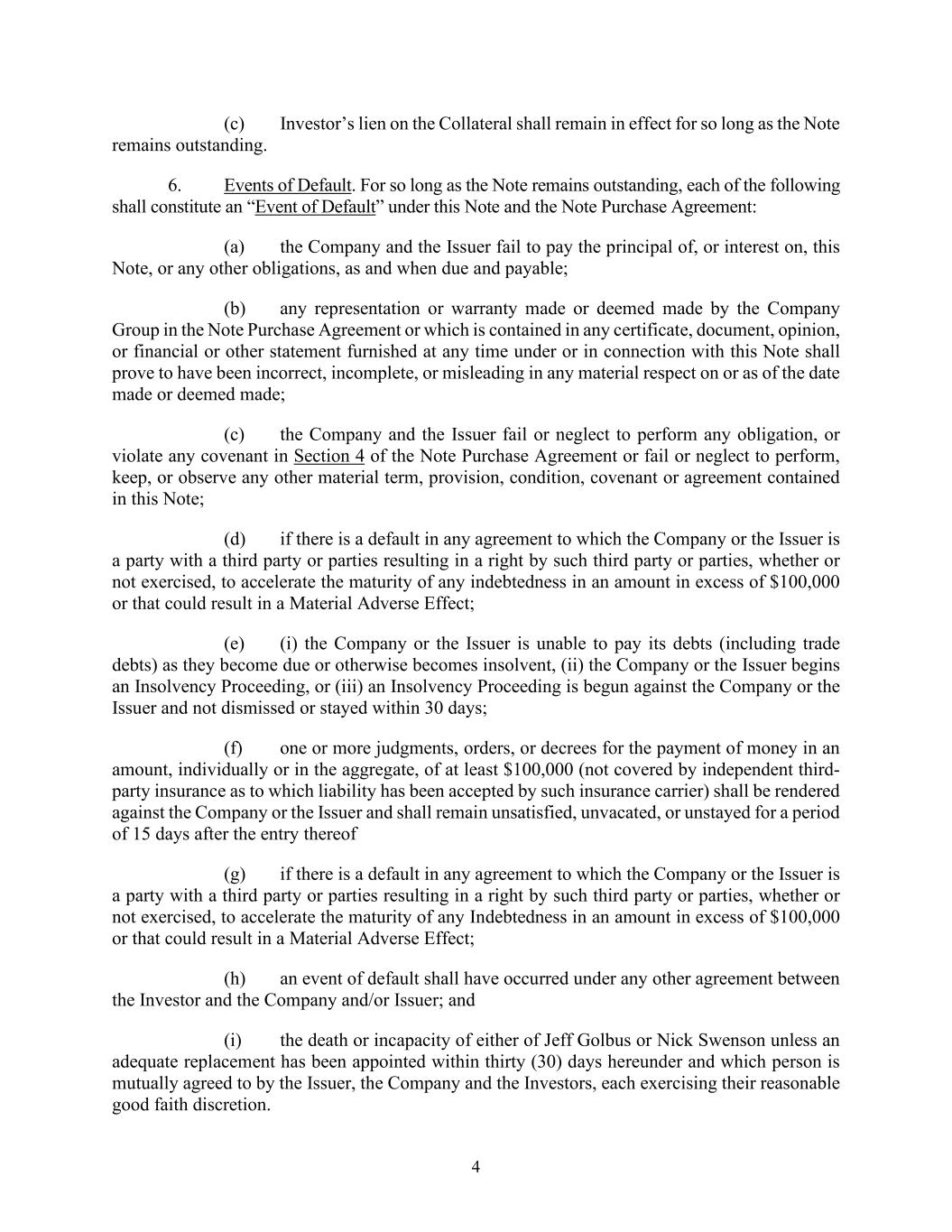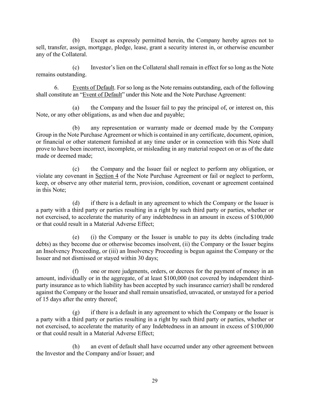 29 (b) Except as expressly permitted herein, the Company hereby agrees not to sell, transfer, assign, mortgage, pledge, lease, grant a security interest in, or otherwise encumber any of the Collateral. (c) Investor’s lien on the Collateral shall remain in effect for so long as the Note remains outstanding. 6. Events of Default. For so long as the Note remains outstanding, each of the following shall constitute an “Event of Default” under this Note and the Note Purchase Agreement: (a) the Company and the Issuer fail to pay the principal of, or interest on, this Note, or any other obligations, as and when due and payable; (b) any representation or warranty made or deemed made by the Company Group in the Note Purchase Agreement or which is contained in any certificate, document, opinion, or financial or other statement furnished at any time under or in connection with this Note shall prove to have been incorrect, incomplete, or misleading in any material respect on or as of the date made or deemed made; (c) the Company and the Issuer fail or neglect to perform any obligation, or violate any covenant in Section 4 of the Note Purchase Agreement or fail or neglect to perform, keep, or observe any other material term, provision, condition, covenant or agreement contained in this Note; (d) if there is a default in any agreement to which the Company or the Issuer is a party with a third party or parties resulting in a right by such third party or parties, whether or not exercised, to accelerate the maturity of any indebtedness in an amount in excess of $100,000 or that could result in a Material Adverse Effect; (e) (i) the Company or the Issuer is unable to pay its debts (including trade debts) as they become due or otherwise becomes insolvent, (ii) the Company or the Issuer begins an Insolvency Proceeding, or (iii) an Insolvency Proceeding is begun against the Company or the Issuer and not dismissed or stayed within 30 days; (f) one or more judgments, orders, or decrees for the payment of money in an amount, individually or in the aggregate, of at least $100,000 (not covered by independent third- party insurance as to which liability has been accepted by such insurance carrier) shall be rendered against the Company or the Issuer and shall remain unsatisfied, unvacated, or unstayed for a period of 15 days after the entry thereof; (g) if there is a default in any agreement to which the Company or the Issuer is a party with a third party or parties resulting in a right by such third party or parties, whether or not exercised, to accelerate the maturity of any Indebtedness in an amount in excess of $100,000 or that could result in a Material Adverse Effect; (h) an event of default shall have occurred under any other agreement between the Investor and the Company and/or Issuer; and