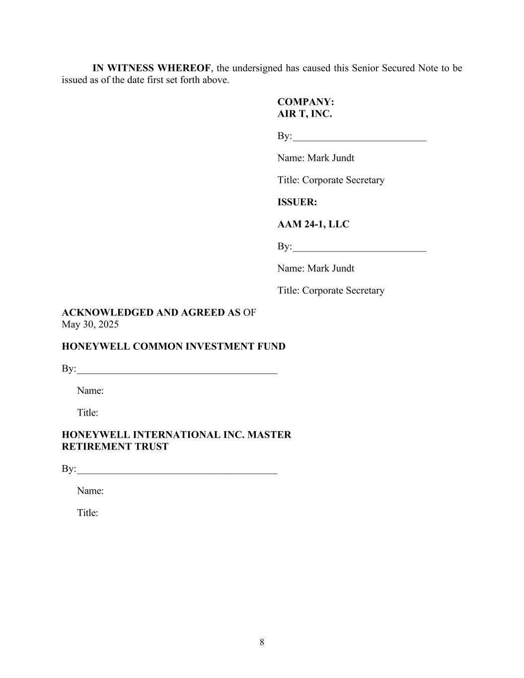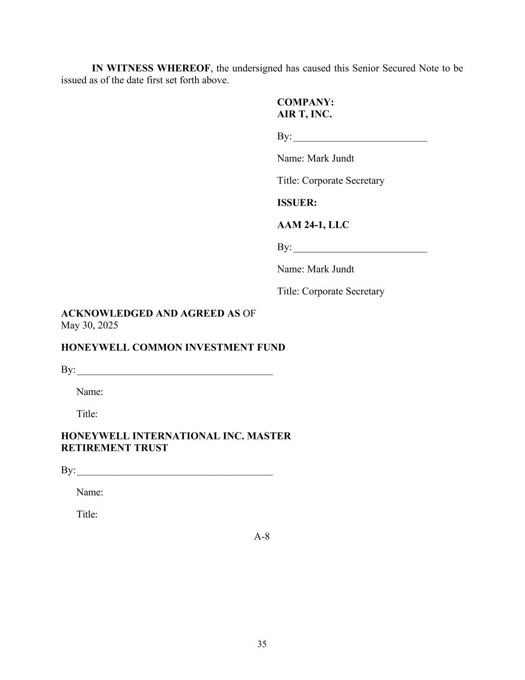 35 IN WITNESS WHEREOF, the undersigned has caused this Senior Secured Note to be issued as of the date first set forth above. COMPANY: AIR T, INC. By: __________________________ Name: Mark Jundt Title: Corporate Secretary ISSUER: AAM 24-1, LLC By: __________________________ Name: Mark Jundt Title: Corporate Secretary ACKNOWLEDGED AND AGREED AS OF May 30, 2025 HONEYWELL COMMON INVESTMENT FUND By: ______________________________________ Name: Title: HONEYWELL INTERNATIONAL INC. MASTER RETIREMENT TRUST By: ______________________________________ Name: Title: A-8
