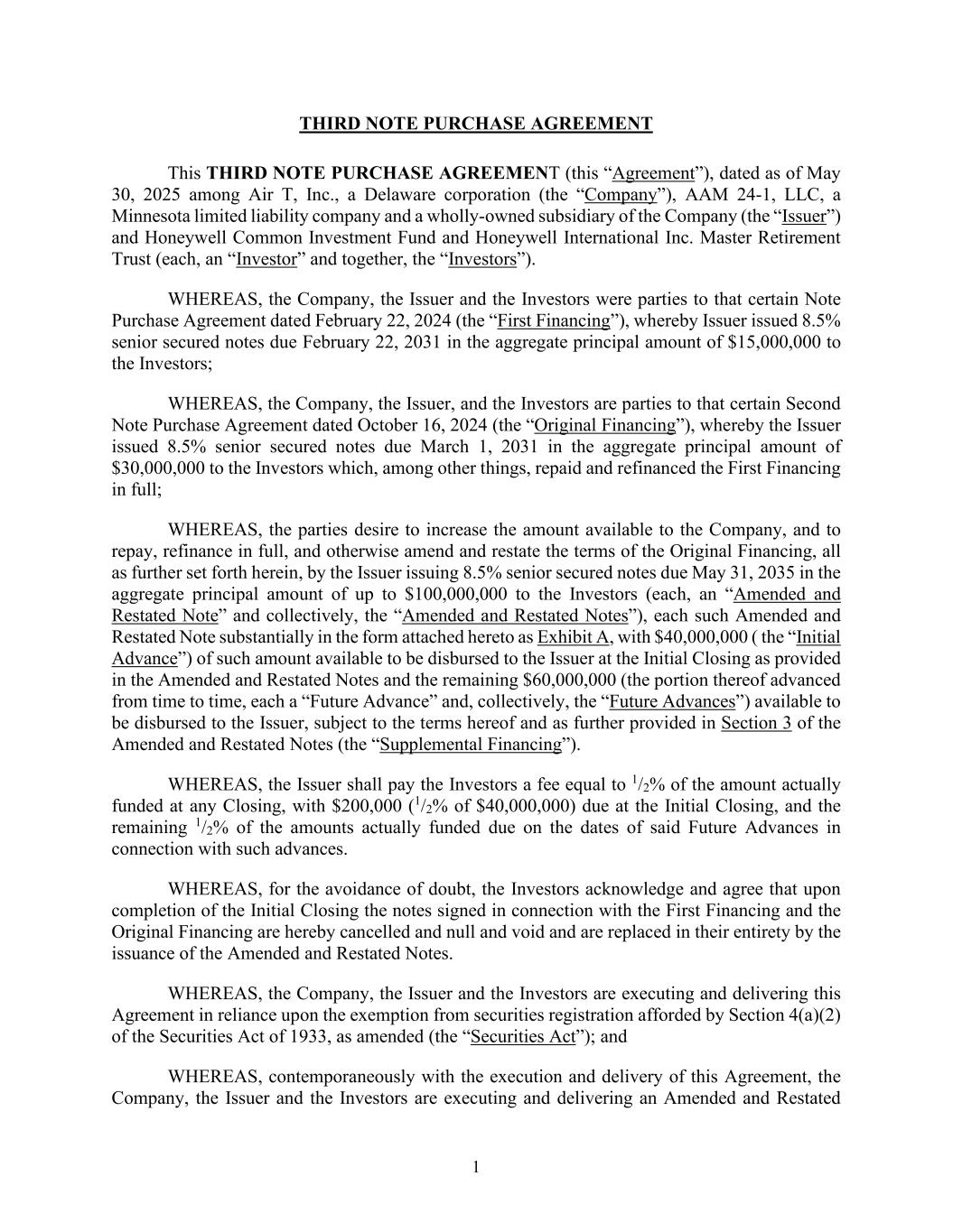 1 THIRD NOTE PURCHASE AGREEMENT This THIRD NOTE PURCHASE AGREEMENT (this “Agreement”), dated as of May 30, 2025 among Air T, Inc., a Delaware corporation (the “Company”), AAM 24-1, LLC, a Minnesota limited liability company and a wholly-owned subsidiary of the Company (the “Issuer”) and Honeywell Common Investment Fund and Honeywell International Inc. Master Retirement Trust (each, an “Investor” and together, the “Investors”). WHEREAS, the Company, the Issuer and the Investors were parties to that certain Note Purchase Agreement dated February 22, 2024 (the “First Financing”), whereby Issuer issued 8.5% senior secured notes due February 22, 2031 in the aggregate principal amount of $15,000,000 to the Investors; WHEREAS, the Company, the Issuer, and the Investors are parties to that certain Second Note Purchase Agreement dated October 16, 2024 (the “Original Financing”), whereby the Issuer issued 8.5% senior secured notes due March 1, 2031 in the aggregate principal amount of $30,000,000 to the Investors which, among other things, repaid and refinanced the First Financing in full; WHEREAS, the parties desire to increase the amount available to the Company, and to repay, refinance in full, and otherwise amend and restate the terms of the Original Financing, all as further set forth herein, by the Issuer issuing 8.5% senior secured notes due May 31, 2035 in the aggregate principal amount of up to $100,000,000 to the Investors (each, an “Amended and Restated Note” and collectively, the “Amended and Restated Notes”), each such Amended and Restated Note substantially in the form attached hereto as Exhibit A, with $40,000,000 ( the “Initial Advance”) of such amount available to be disbursed to the Issuer at the Initial Closing as provided in the Amended and Restated Notes and the remaining $60,000,000 (the portion thereof advanced from time to time, each a “Future Advance” and, collectively, the “Future Advances”) available to be disbursed to the Issuer, subject to the terms hereof and as further provided in Section 3 of the Amended and Restated Notes (the “Supplemental Financing”). WHEREAS, the Issuer shall pay the Investors a fee equal to 1/2% of the amount actually funded at any Closing, with $200,000 (1/2% of $40,000,000) due at the Initial Closing, and the remaining 1/2% of the amounts actually funded due on the dates of said Future Advances in connection with such advances. WHEREAS, for the avoidance of doubt, the Investors acknowledge and agree that upon completion of the Initial Closing the notes signed in connection with the First Financing and the Original Financing are hereby cancelled and null and void and are replaced in their entirety by the issuance of the Amended and Restated Notes. WHEREAS, the Company, the Issuer and the Investors are executing and delivering this Agreement in reliance upon the exemption from securities registration afforded by Section 4(a)(2) of the Securities Act of 1933, as amended (the “Securities Act”); and WHEREAS, contemporaneously with the execution and delivery of this Agreement, the Company, the Issuer and the Investors are executing and delivering an Amended and Restated