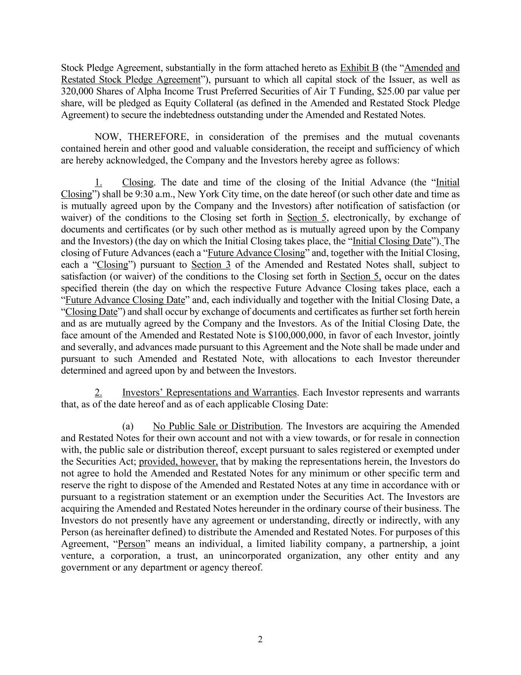 2 Stock Pledge Agreement, substantially in the form attached hereto as Exhibit B (the “Amended and Restated Stock Pledge Agreement”), pursuant to which all capital stock of the Issuer, as well as 320,000 Shares of Alpha Income Trust Preferred Securities of Air T Funding, $25.00 par value per share, will be pledged as Equity Collateral (as defined in the Amended and Restated Stock Pledge Agreement) to secure the indebtedness outstanding under the Amended and Restated Notes. NOW, THEREFORE, in consideration of the premises and the mutual covenants contained herein and other good and valuable consideration, the receipt and sufficiency of which are hereby acknowledged, the Company and the Investors hereby agree as follows: 1. Closing. The date and time of the closing of the Initial Advance (the “Initial Closing”) shall be 9:30 a.m., New York City time, on the date hereof (or such other date and time as is mutually agreed upon by the Company and the Investors) after notification of satisfaction (or waiver) of the conditions to the Closing set forth in Section 5, electronically, by exchange of documents and certificates (or by such other method as is mutually agreed upon by the Company and the Investors) (the day on which the Initial Closing takes place, the “Initial Closing Date”). The closing of Future Advances (each a “Future Advance Closing” and, together with the Initial Closing, each a “Closing”) pursuant to Section 3 of the Amended and Restated Notes shall, subject to satisfaction (or waiver) of the conditions to the Closing set forth in Section 5, occur on the dates specified therein (the day on which the respective Future Advance Closing takes place, each a “Future Advance Closing Date” and, each individually and together with the Initial Closing Date, a “Closing Date”) and shall occur by exchange of documents and certificates as further set forth herein and as are mutually agreed by the Company and the Investors. As of the Initial Closing Date, the face amount of the Amended and Restated Note is $100,000,000, in favor of each Investor, jointly and severally, and advances made pursuant to this Agreement and the Note shall be made under and pursuant to such Amended and Restated Note, with allocations to each Investor thereunder determined and agreed upon by and between the Investors. 2. Investors’ Representations and Warranties. Each Investor represents and warrants that, as of the date hereof and as of each applicable Closing Date: (a) No Public Sale or Distribution. The Investors are acquiring the Amended and Restated Notes for their own account and not with a view towards, or for resale in connection with, the public sale or distribution thereof, except pursuant to sales registered or exempted under the Securities Act; provided, however, that by making the representations herein, the Investors do not agree to hold the Amended and Restated Notes for any minimum or other specific term and reserve the right to dispose of the Amended and Restated Notes at any time in accordance with or pursuant to a registration statement or an exemption under the Securities Act. The Investors are acquiring the Amended and Restated Notes hereunder in the ordinary course of their business. The Investors do not presently have any agreement or understanding, directly or indirectly, with any Person (as hereinafter defined) to distribute the Amended and Restated Notes. For purposes of this Agreement, “Person” means an individual, a limited liability company, a partnership, a joint venture, a corporation, a trust, an unincorporated organization, any other entity and any government or any department or agency thereof.